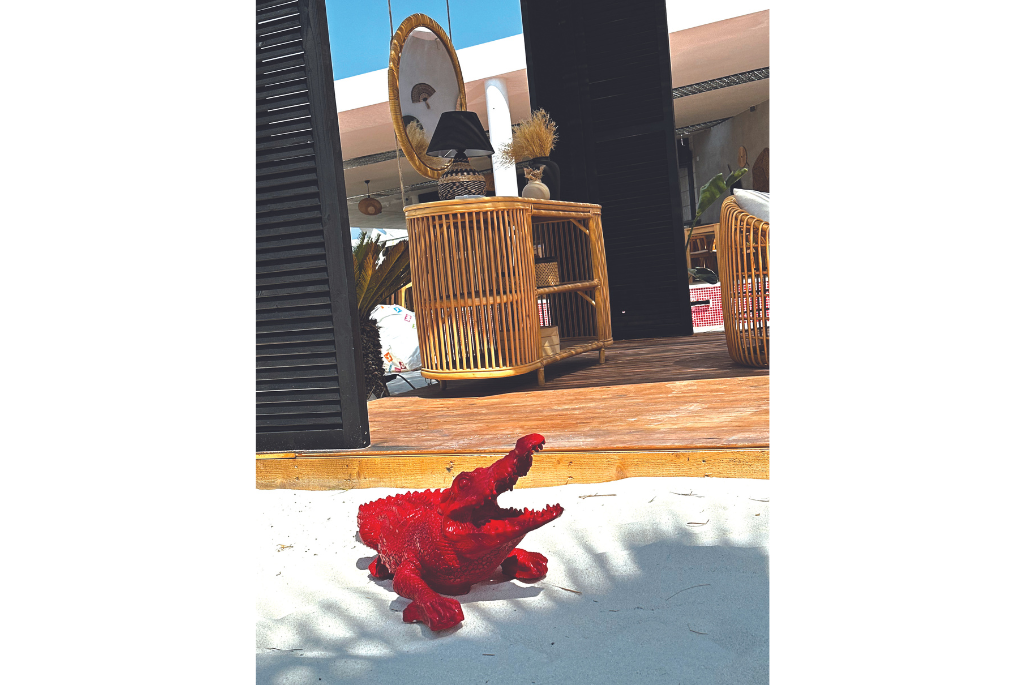 We have a sculpture at the entrance that puckers its lips to give a kiss, and in the Beach section, we have a sculpture sticking out its tongue. Our three-meter red elephant sculpture at the entrance has become a focal point for photo enthusiasts. The red crocodile sculpture on the sand and the glasses-wearing dog sculpture at the bar were also highly appreciated. A relief-like wall application was made by Greyart Work at the entrance and beach area of Ülfet Shu. This application was done for the first time in Cyprus and became a striking wall. You can even take photos in the curved walls surrounding Ülfet Restaurant, the niche wall filled with bohemian accessories, and even in the restrooms and restroom corridors.