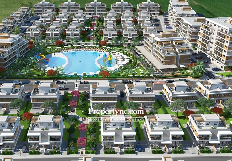 There will be shops, common green areas, communal pools, children’s pool, aqua park, silent pool, restaurant, sports centre, sauna, children’s playground, walking and cycling trials, all on site. The project is located just one kilometre from the sea and is only two minutes from the city centre of Iskele.