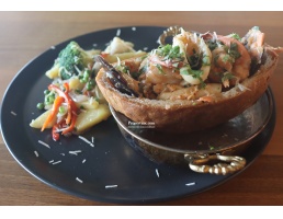 Seafood in a bowl of rye bread