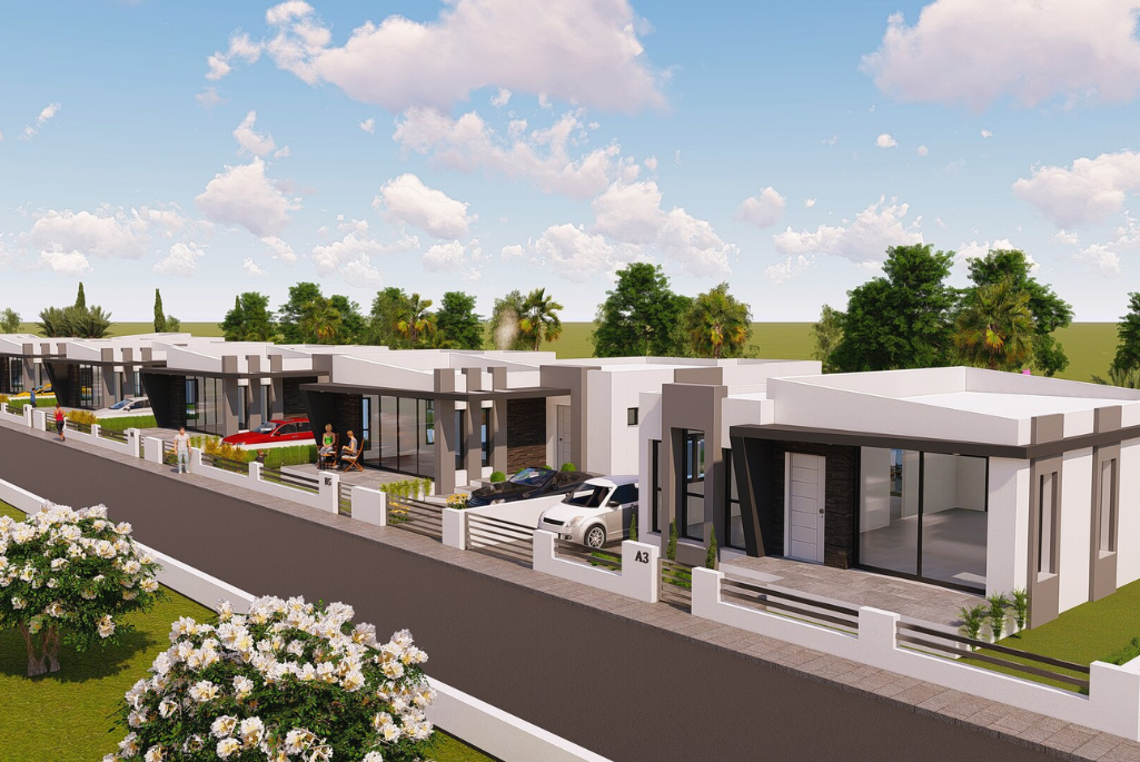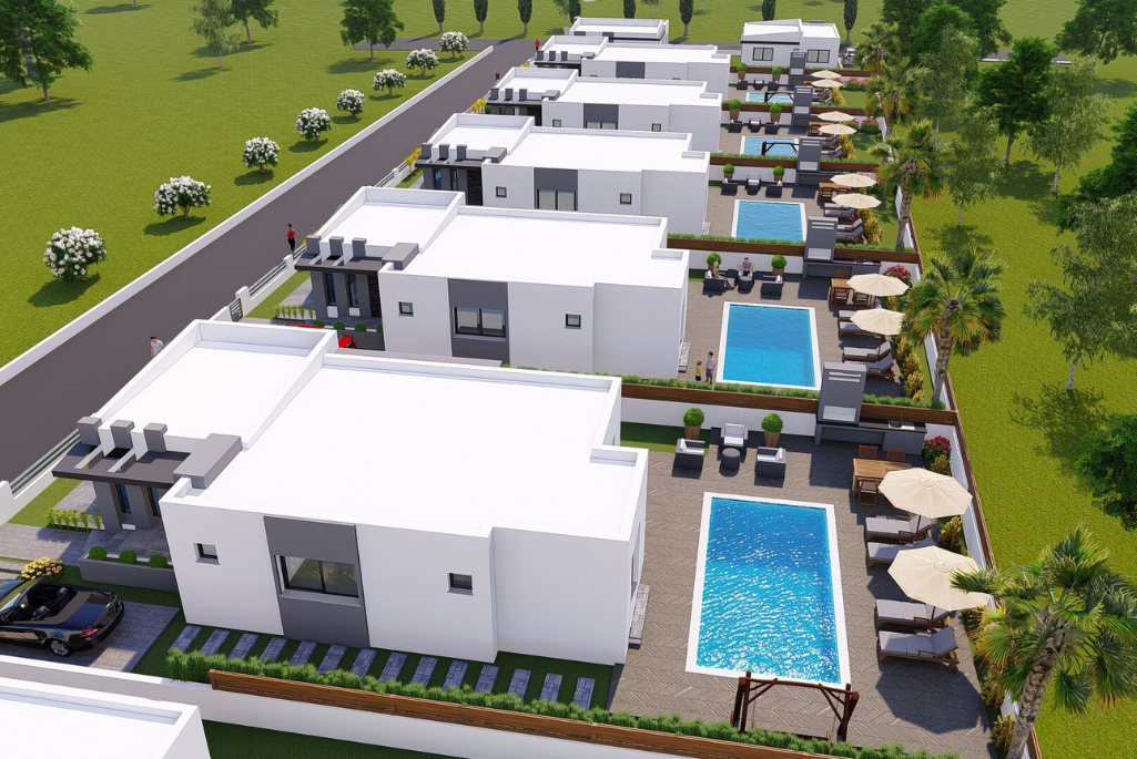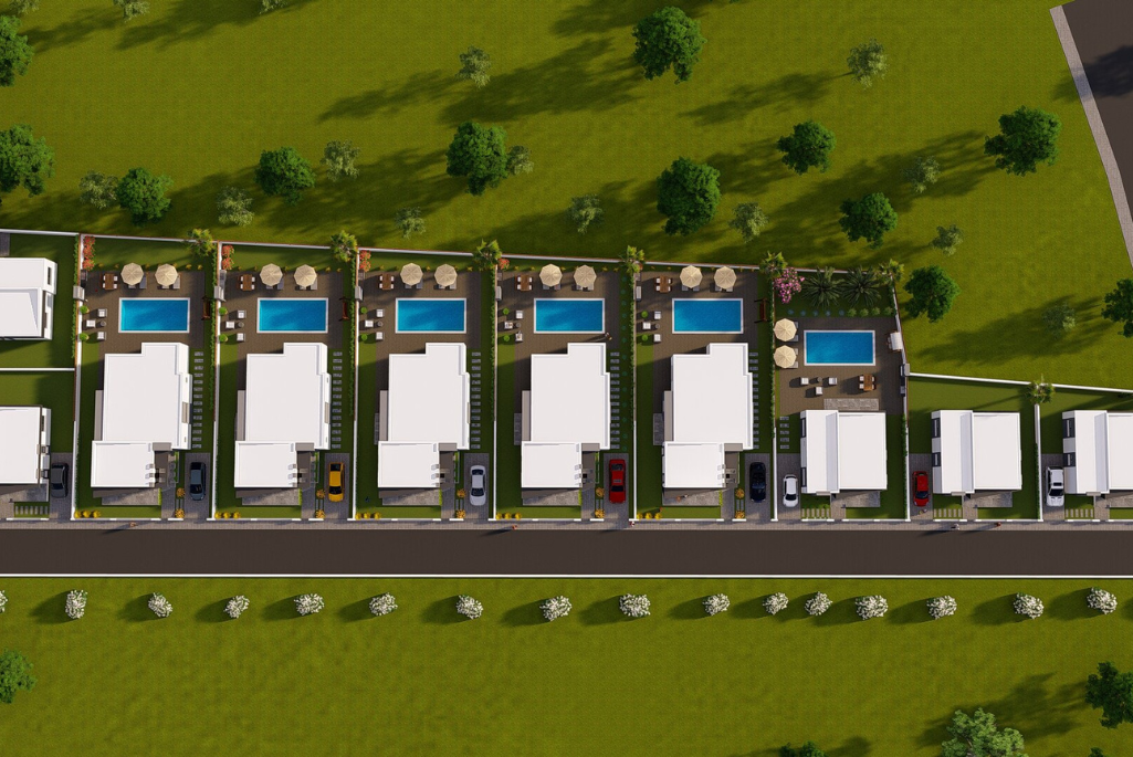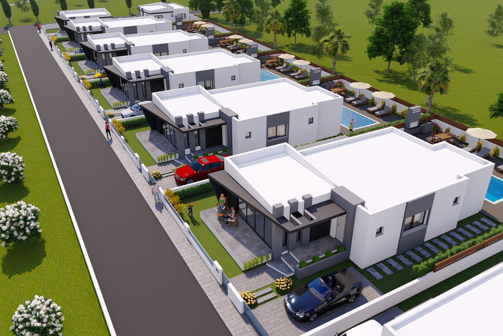 Situated in Mutluyaka area, modern, luxury and high-quality structure, single-story detached villas with large gardens with pool / without pool options, 5 of them are  2 + 1 and the other 5 are 3 + 1 single floor detached villas. The 2-bedroom villas' area is 86 m2. The available garden areas ranging from 235-415m2. 3 bedroom villas with 155 m2, garden areas between 450-498m2.