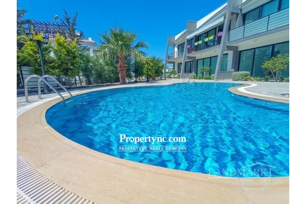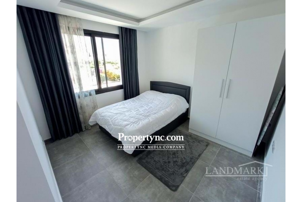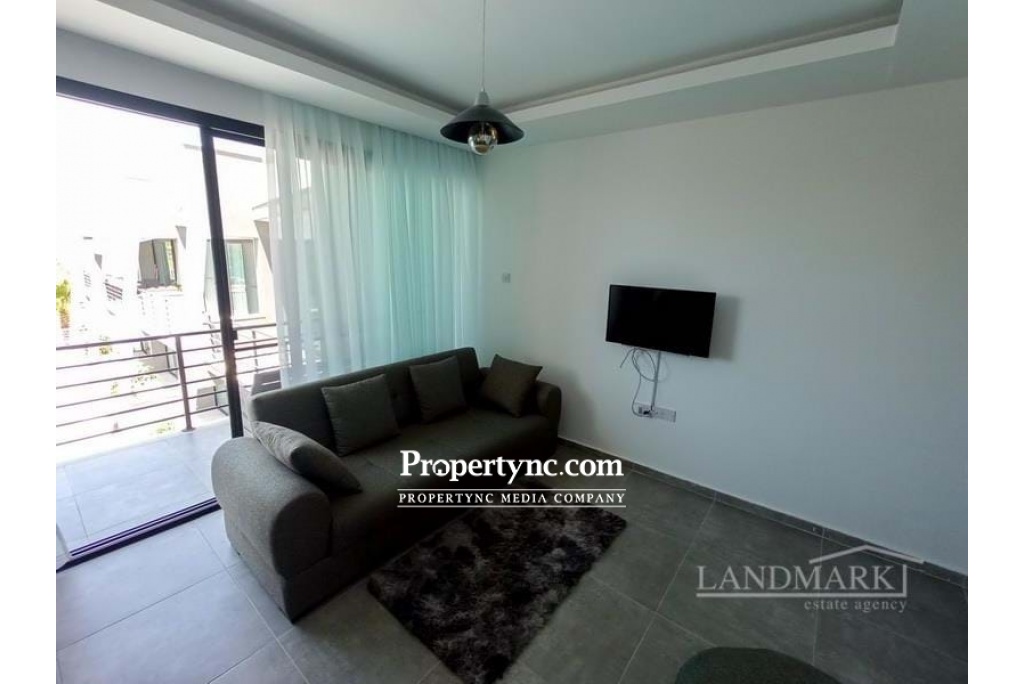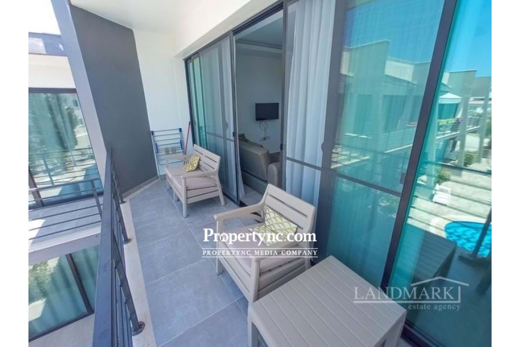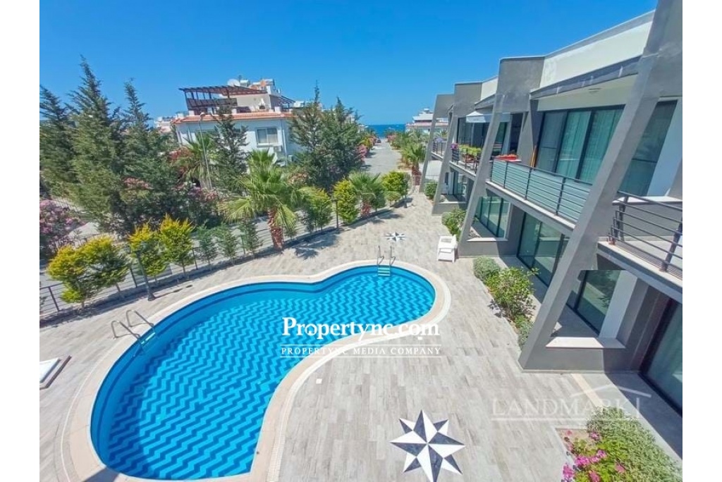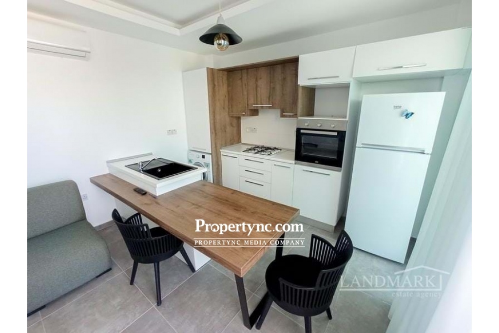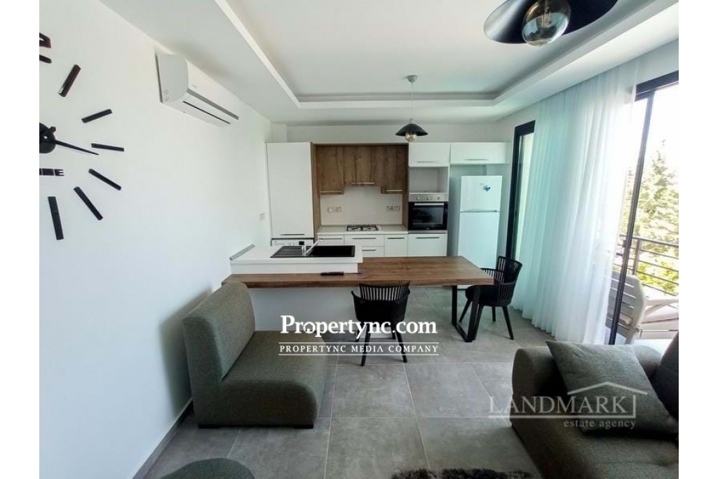 Look at this gorgeous apartment in a new complex located in Lapta area close to the famous walking trail. Water and electricity have been connected to the apartment. Apartment is located on the first floor and has its own private way to the roof terrace. Internally, there is an open plan kitchen combined with a cozy lounge which has a patio door leading to the terrace with direct sea view. There is one family bathroom and a bedroom with fitted wardrobe and a mountains view. 14 apartments on site 55m² internal size 20m2 roof terrace Exchange title deed VAT to pay Communal pool Completed 2019 Furniture negotiable 1 bedroom 1 bathroom Open plan lounge kitchen First floor apartment has front terrace with direct sea view 2 Air conditioners Parking area This is a respected building company and will give a 5 years building guarantee on all of their projects Walking distance to the sea - REF: 1635b-1