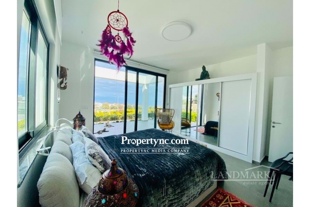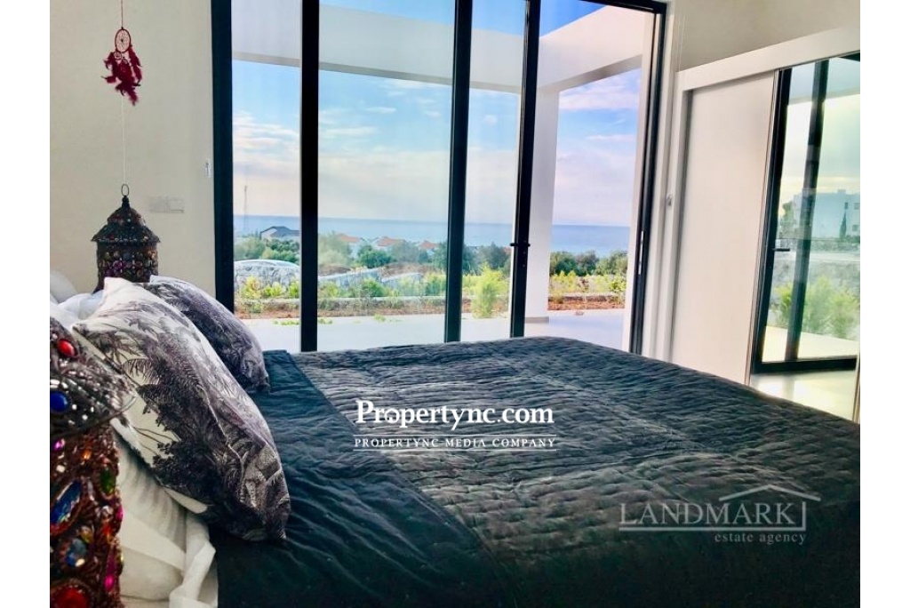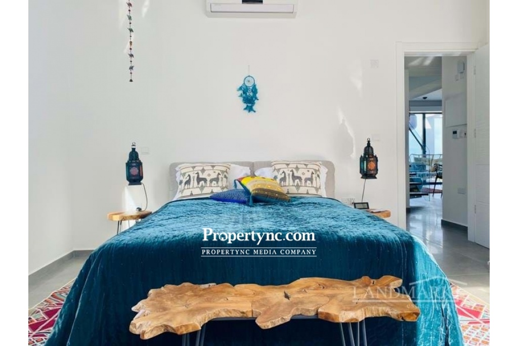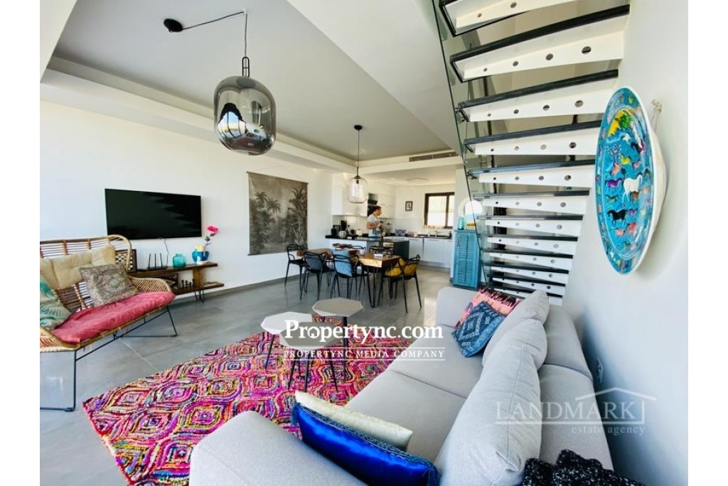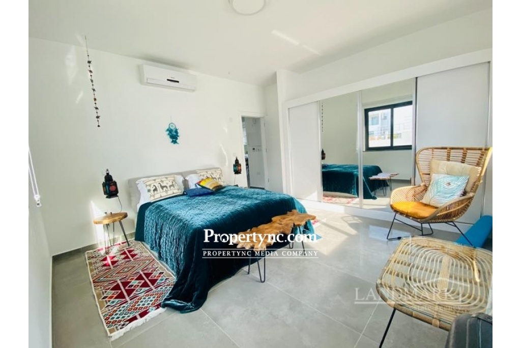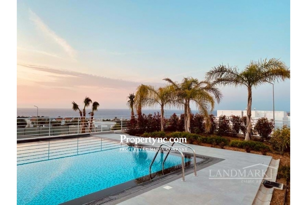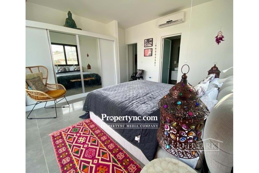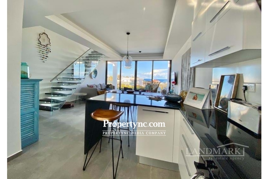 The penthouse has a breathtaking roof terrace with a granite outdoor bar kitchenette and an outdoor shower. At ground level you can enjoy the unobstructed view of the Italian Garden and the sea through the huge, ceiling-high Schüko sliding window elements on another terrace. The large living room with open kitchen and dining area also has a sea view. The stylish glass granite staircase leads from the living room to the roof terrace. When you enter the apartment, the hallway leads to the 2 large bedrooms and the 2 shower rooms. Both bedrooms are very spacious and have a large, white built-in wardrobe with 2 mirror elements. The master bedroom again has floor-to-ceiling sliding elements that also lead to the terrace with a sea view. The kitchen is equipped with all appliances and a fine granite plate and additional seating. The penthouse is fully furnished and can be bought that way. Location The penthouse in the high-end resort & spa area is about 5 minutes by car from the mountain village Esentepe and 15 minutes from the enchanting port city of Kyrenia in the middle of pine and olive groves. In Kyrenia and on the way there, you will find restaurants & bars mainly in the historic oldtown with the harbor promenade and its countless shopping opportunities. 1-storey property 104 qm Rooftop 104 qm with kitchen and shower plus 4 community pools Exchange title deed, VAT payable Furniture is negotiable 2 bedrooms 2 toilet & baths Terraces to beautiful garden 45 qm Beautiful landscaping sea and mountain - REF: 208u