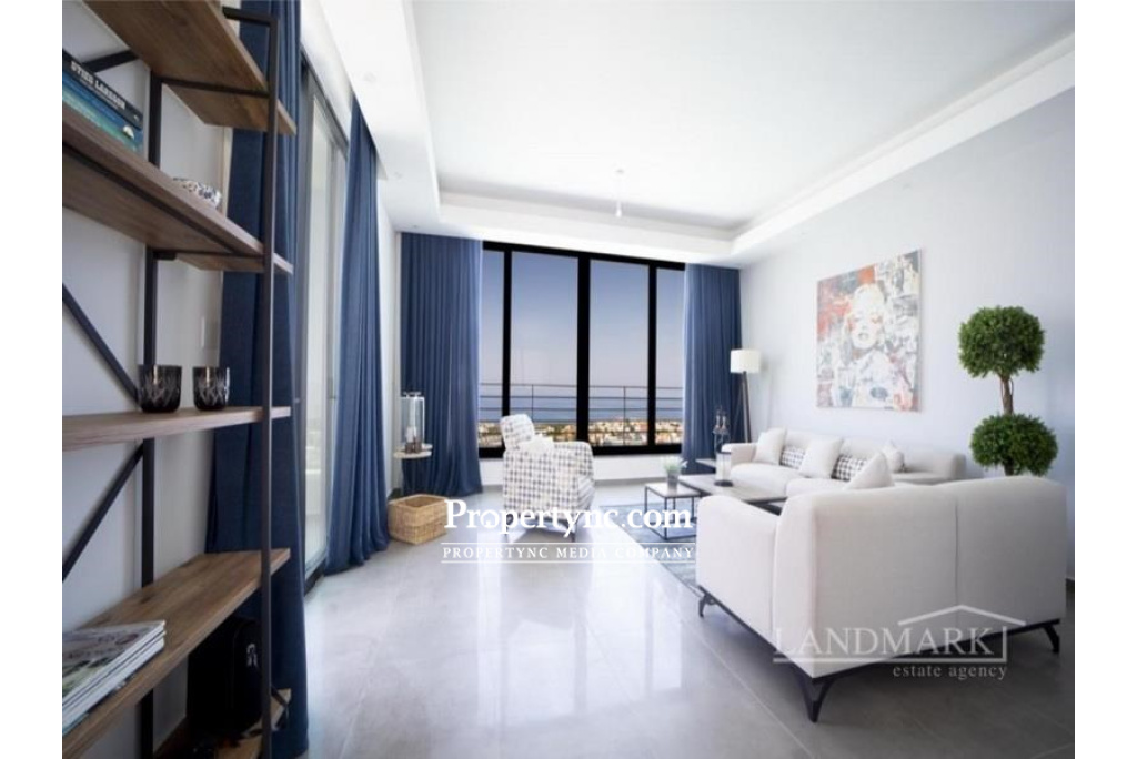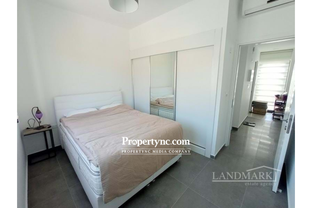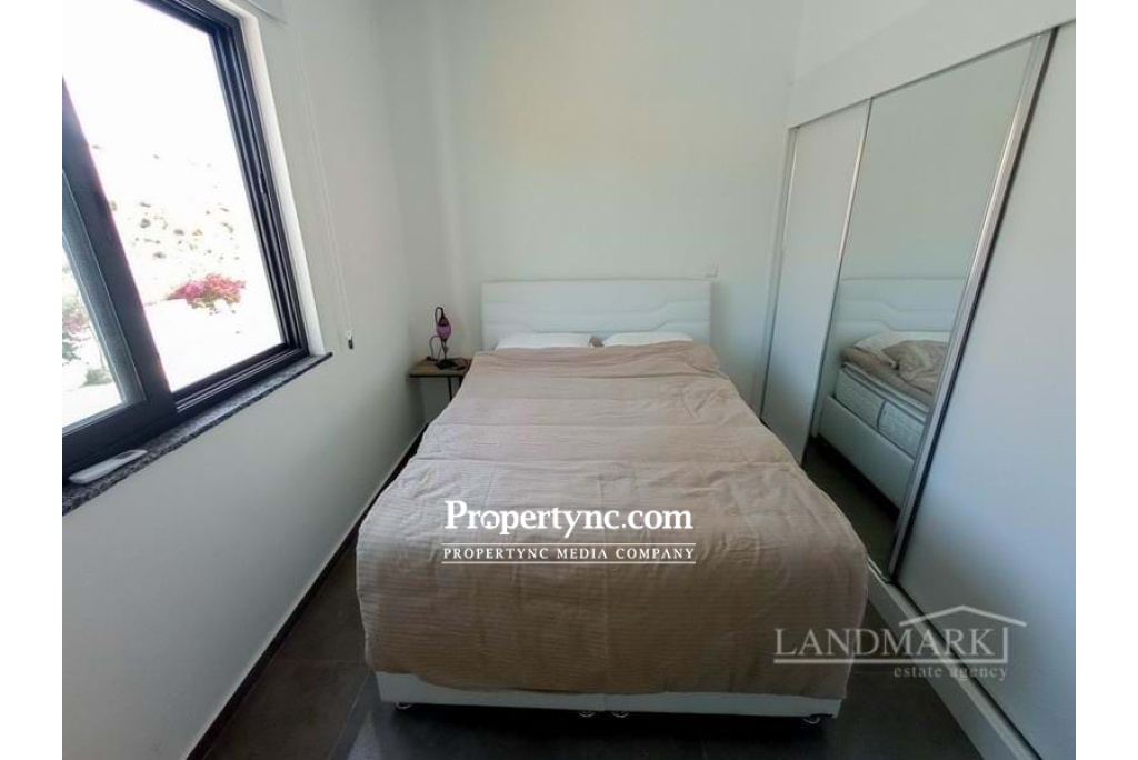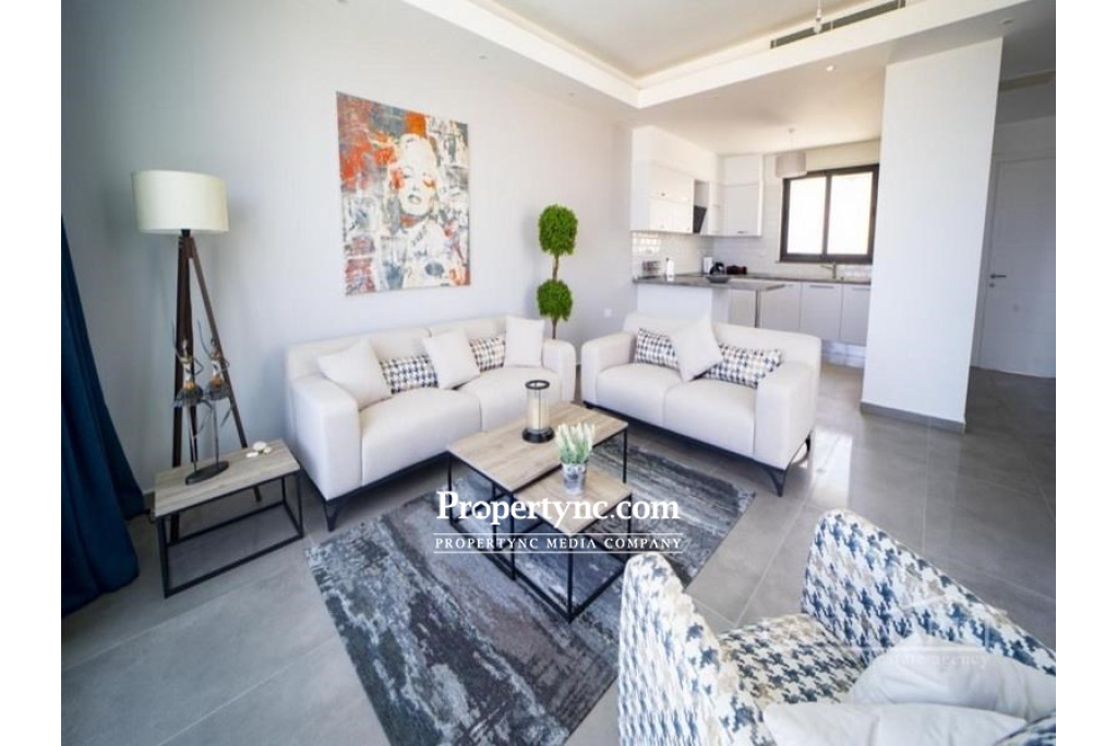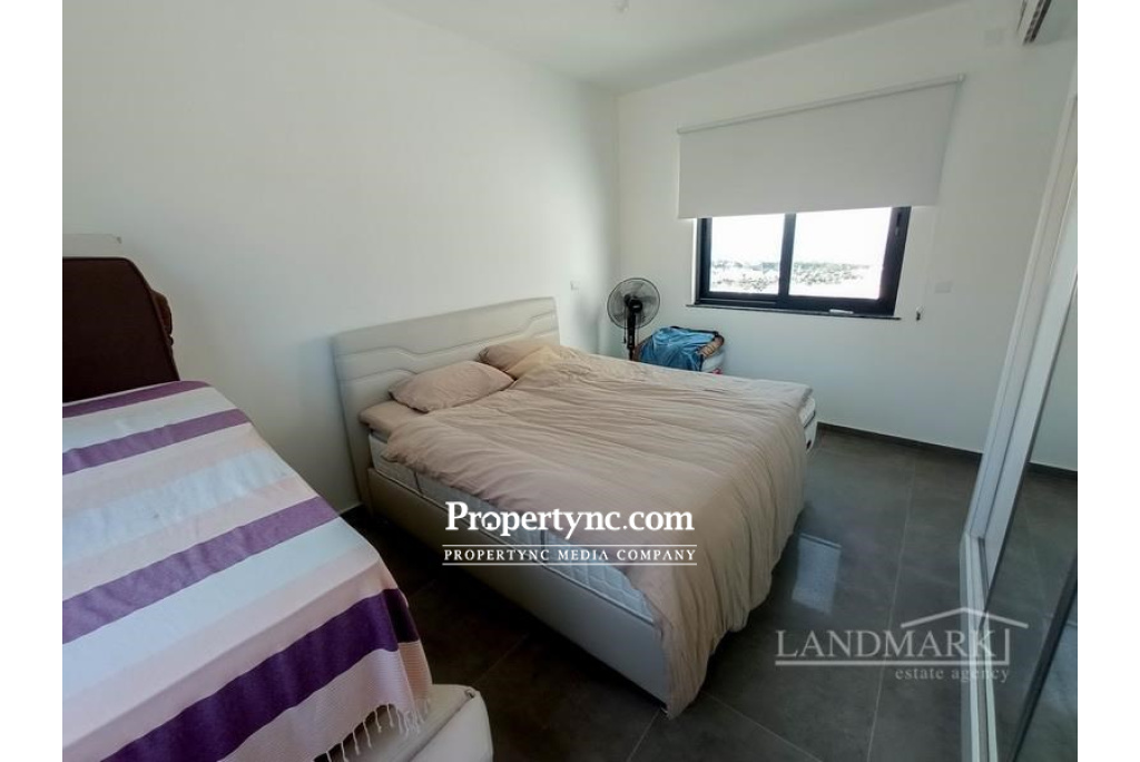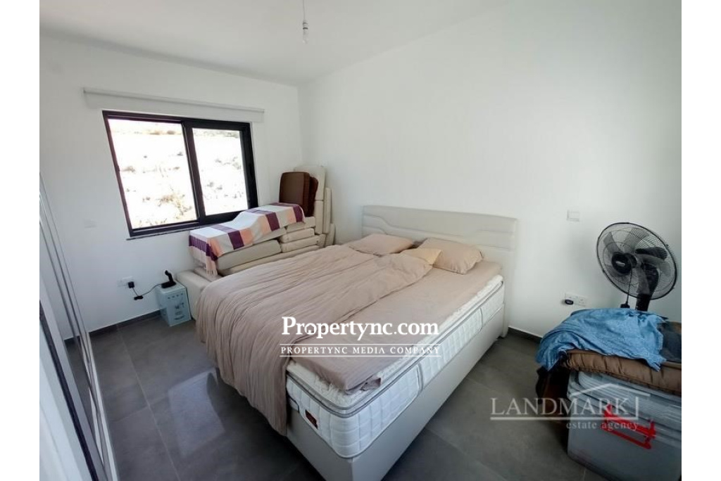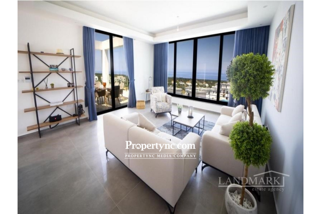 At ground level you can enjoy the unobstructed view of the sea through the huge, ceiling-high Schüko sliding window elements on another terrace. The large living room with open kitchen and dining area also has a sea view. When you enter the apartment, the hallway leads to the 2 large bedrooms and the 2 shower rooms. Both bedrooms are very spacious and have a large, white built-in wardrobe with 2 mirror elements. The kitchen is equipped with all appliances. The penthouse is fully furnished and can be bought that way. The penthouse in the high-end resort & spa area is about 5 minutes by car from the mountain village Esentepe and 15 minutes from the enchanting port city of Kyrenia in the middle of pine and olive groves. In Kyrenia and on the way there, you will find restaurants & bars mainly in the historic old town with the harbour promenade and its countless shopping opportunities. The sea and the Kyrenia Five Finger Mountains seem to be within reach everywhere here. One of the most beautiful natural beaches, the "Alagadi Beach" also called Turtle Beach, is only 5 minutes by car from the penthouse. 104m2 internal area 21,5m2 terrace 100m2 roof terrace Exchange title deed Title deed on the builders name, VAT to pay Fully furnished Communal swimming pools 2 bedrooms Family bathroom En-suite in the master bedroom Ceramic flooring Fully fitted kitchen VRF cooling system in the lounge and kitchen 2 air conditioners in the bedrooms Fitted wardrobes Dark double glazed aluminum windows Restaurant Tennis court Wellness center Maintenance fee: 125 GBP month Beautiful landscaping sea and mountain - REF: 208z