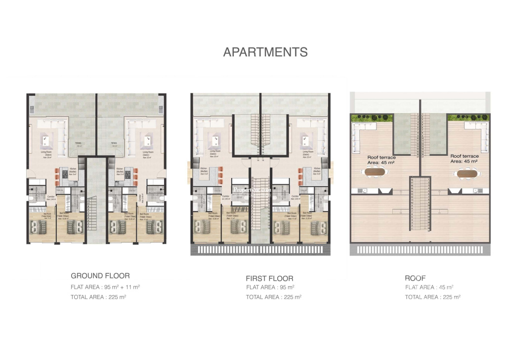 This is a brand new, off plan project that is being built in a great area of Lapta where you will find a number of beaches and restaurants all along the coast within just a 5 minutes drive. On the site, there will be 20 x 2 bed, 85m2 apartments in 5 blocks sharing a communal swimming pool. 12 x 4-bedroom row villas with 200m2 & 220m2 internal site and roof terrace and 14 x 4-bedroom exclusive villas with 255m2 & 265m2 internal size and roof terrace, all the villas will include a private 40m2 swimming pool. The 2-bed apartments will all have an 85m2 internal. The ground floor with a 10m2 balcony and a private garden. The top-floor apartments will have a 45m2 roof terrace. Internally, they have an open plan lounge, kitchen, 2 bedrooms, master bedroom with ensuite and there is a family bathroom. Top-floor apartments will have a roof terrace. The project is in close proximity to a beautiful beach bay called Sarduna Beach where you can go to sunbathe and have lunch with family and friends enjoying the fantastic view of the Med. Sulars and Jessics are also in the vicinity as is the Silver Rocks Restaurant and you are only a few minutes drive to the Lapta strip where you have an array of other restaurants and beaches to enjoy. You are also close to all other amenities such as chemists, supermarkets, banks and a whole selection of shops which runs into the neighbouring village of Alsancak. The area has become a very popular residential area and has a mix of locals and ex-pat communities. 85m2 internal area Ground floor 10m2 balcony + private garden Top floor will have a 45m2 roof terrace VAT to pay Completion in 2025 Communal swimming pool 2 bedrooms Master with ensuite Family bathroom Open plan, lounge kitchen Balcony Ground floor apartments have a garden Top-floor apartments have a private roof terrace High quality fitted kitchen & wardrobes & sanitary ware shower & bathrooms VRF heating & cooling system Cafe, terrace cafe, Gym and Spa Tennis court Trafo fee £1500 extra Maintenance TBC 5 Year Building Guarantee Optional extras: White goods and furniture packages are available if required Rooftop BBQ can be added if required Optional solar energy infrastructure Payment plan: 35% down payment 25% when concrete structure finishes (if finished, then 60%) 25% when under structure, floor handle, brickworks and plasterwork finishes (if this stage has been completed, then 85%) 15% when the villa is completed and its surroundings, site road pavements clean soil finishes and deed transfer - REF: 1904d