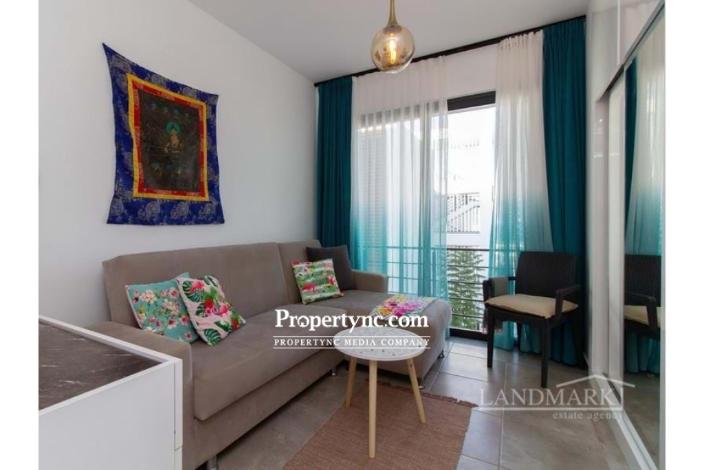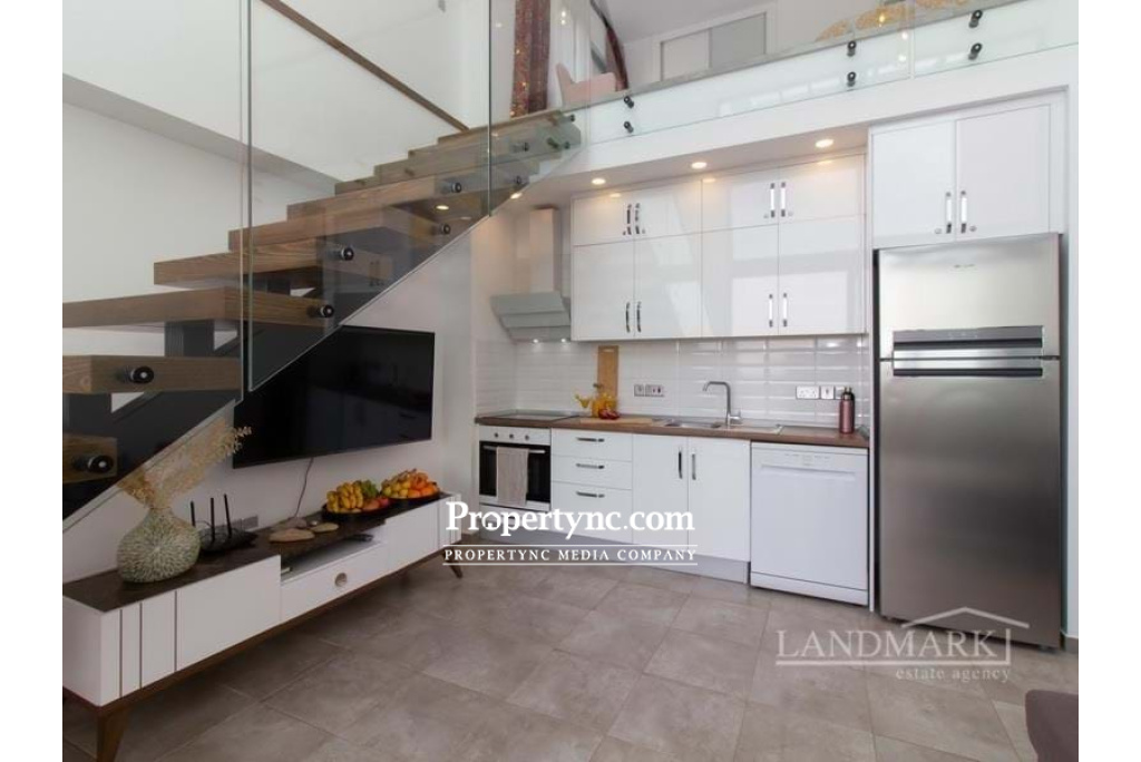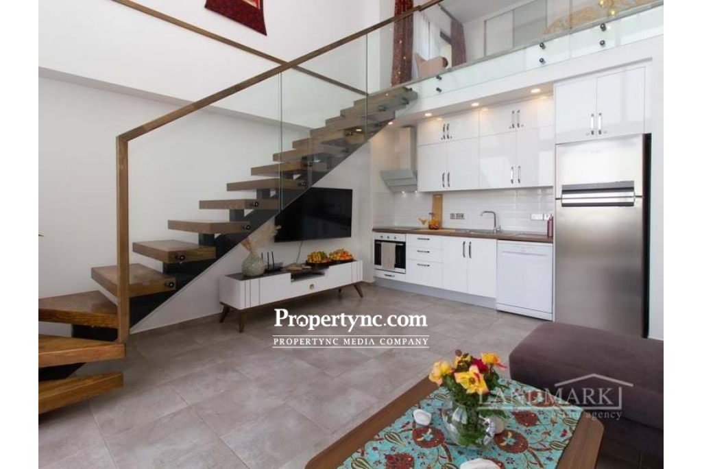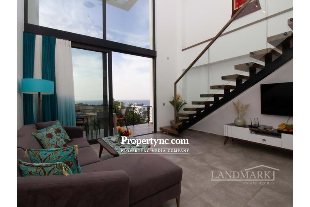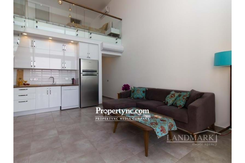 2-bedroom modern LOFT penthouse apartment + fully furnıshed + roof terrace + communal swimming pool + bar + walking distance to the beach and supermarket + sea and mountain views