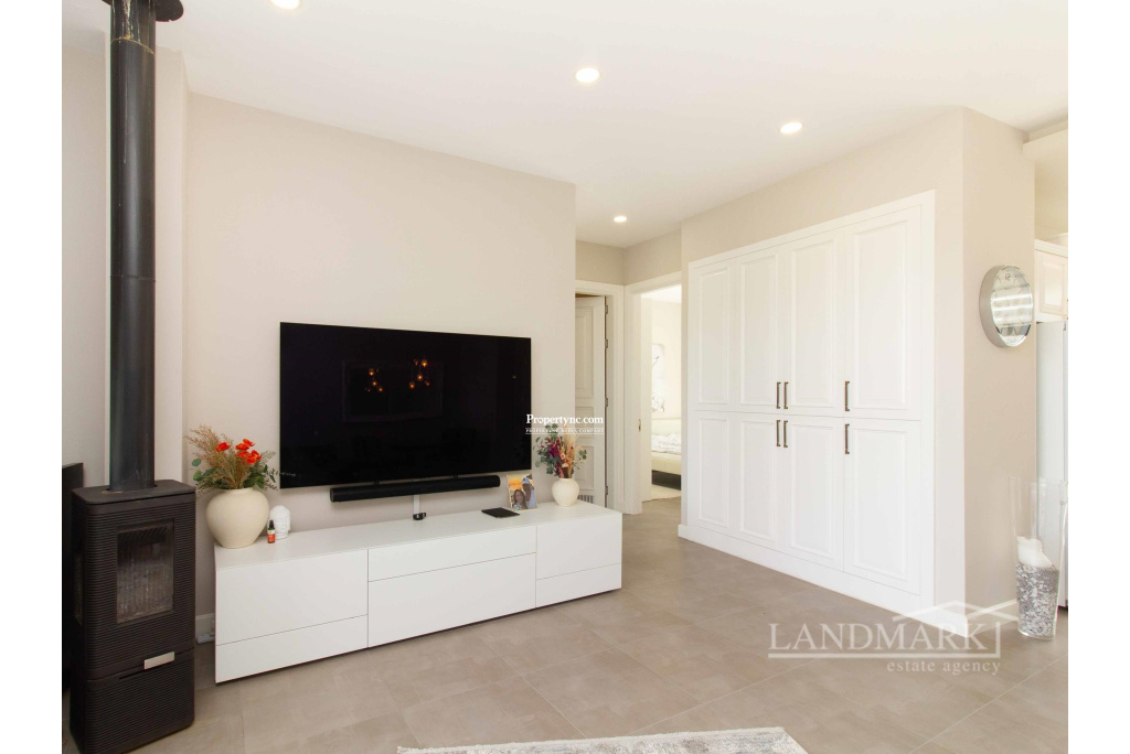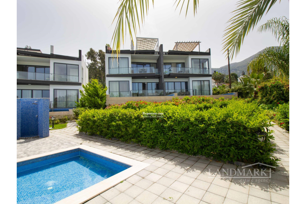 As you step into the apartment, you're immediately embraced by an air of sophistication and luxury. On the right side you will see the chic kitchen with white high-gloss units with white granite countertops as well as high quality. The residents will have the perfect mountain views while cooking through the balcony in the kitchen area. Moving inside of the apartment, spacious living room with unique log burner creates a cosy environment. Additional dining area space adds practicality to the house. Large floor to ceiling windows helps the room to fill with light as well as access to the large balcony area with uninterrupted views of the Mediterranean Sea. As the residents move further in, they will find a spacious bedroom with floor to ceiling white high-quality wardrobes. The bedroom has large windows with breath taking mountain views. At the end of the corridor the master bedroom features floor-to-ceiling wardrobes and windows that offer uninterrupted views of the sea and Kyrenia city. The sleek bathroom has a luxurious walk-in shower with brown stylish tiles, adding a touch of indulgence to everyday routines. Large private roof terrace with toughened glass balcony, which provides unsurpassed views over to the sea and mountains. It is a perfect space to use for gatherings and barbecue events. 120m² internal area 20m² balcony 120m² roof terrace Exchange title deed VAT to pay Communal Olympic pool Seranit brand luxury porcelain flooring 2 bedrooms 1 family bathroom 1 en suites with walk-in shower Fully fitted kitchen with white hardwood cupboards and white granite countertops Bosch white goods Bosch air conditions x3 Log burner LED inset spot lighting in the living room Video intercom entry system Irrigation system in the communal garden Open parking space Stone wall surround the site 24 7 security and cameras around the site Distance to: Kyrenia Harbour 5 km, (15 min drive) Nicosia Centre 35km (45 min drive) Ercan airport 38km (40 min drive) Larnaca airport 80 km (1 hr 15 min drive) Korineum Golf and Beach resort 20 km (20 min drive) Karpaz Gate Marina 95km (1 hr 20 min drive) - REF: 1873a