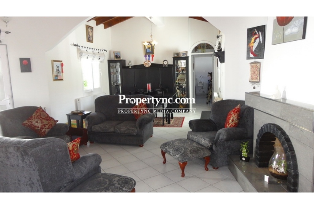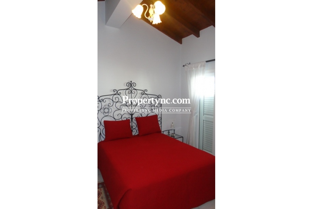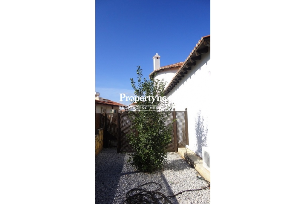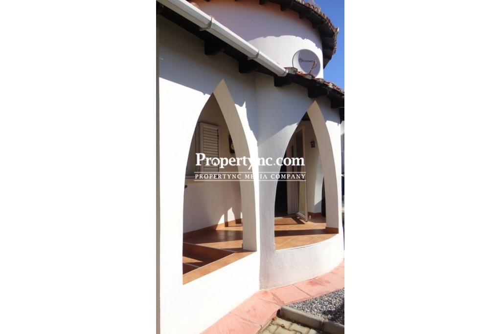The property has a unique shape and you enter the property in to its spacious circular shape lounge with featured wooden circular ceiling. The lounge has an open fire place and is open plan to the kitchen which includes a granite sink and kitchen appliances. There are 2 bedrooms with wooden vaulted ceilings, fitted wardrobes and the master bedroom has en-suite bathroom with towel rail. There is another family shower room and if you have guests staying it can closed to make a private en-suite shower room. One side of the property has access to a long covered terrace area which has access from both bedrooms and lounge. The outside has been made easy maintenance with pebble stones and has its own olive trees. To the rear of the property the owners have made a lovely pergola seating area were you also a traditional clay oven and BBQ for summer evening and entertaining. The owners also changed the entrance and have built a lovely ottoman arched porch and also installed a car port.