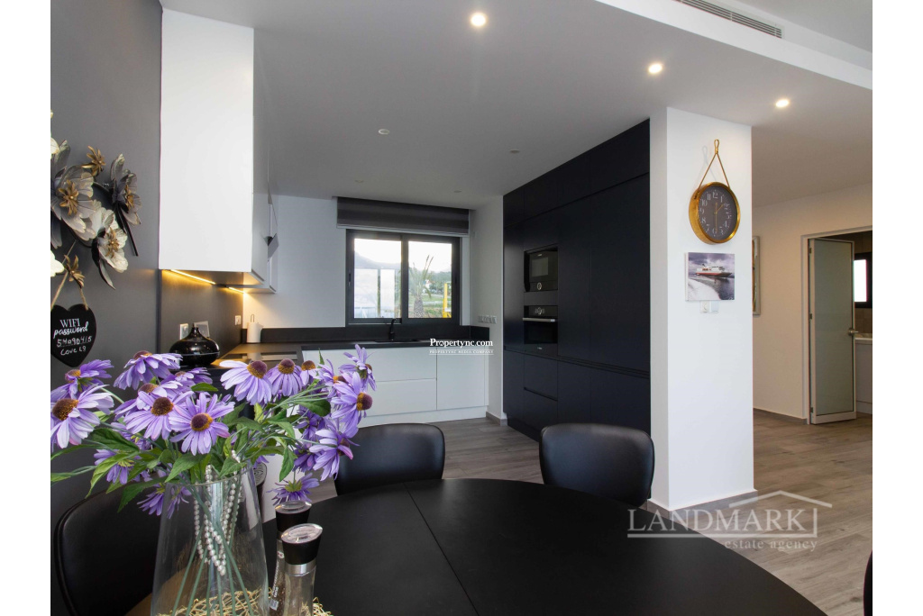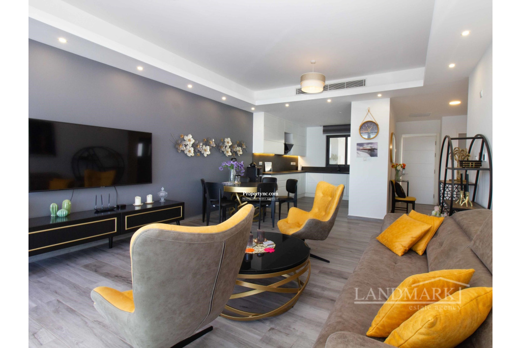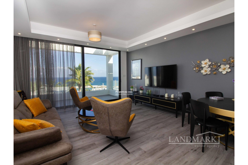 This exquisite seaside apartment offers an unrivalled location right on the seafront, providing captivating sea views. Part of an idyllic holiday complex, it provides a perfect escape from city life. The complex exudes tranquility and beauty with well-maintained gardens bursting with color. The communal pool invites relaxation and fun, while the on-site restaurant caters to all tastes. A picturesque seafront garden provides a peaceful retreat, and a tennis court serves sports enthusiasts. A beautiful cove, equipped with beach facilities for a delightful seaside day, is a stone's throw away. The apartment's modern elegance is immediately apparent. A spacious lounge, which leads to a front terrace, greets you upon entering. This outdoor space, perfect for enjoying sea views over coffee at sunrise or wine at sunset, enhances the apartment's appeal. The modern kitchen boasts sleek appliances that will please any home cook. The apartment features two comfortable bedrooms, each with fitted wardrobes for ample storage. The master bedroom offers private access to the front terrace, providing a personal space to enjoy the stunning sea view. One of the apartment's highlights is the expansive roof terrace, ideal for sunbathing, entertaining, or dining under the open sky, with views of the beautiful neighborhood and the glistening Mediterranean. In conclusion, this apartment is not only a perfect holiday home but also a promising investment opportunity, thanks to its desirable location and high-quality amenities. 95m2 internal size 25m2 terrace 85m2 roof terrace VAT payable Competed 2022 Communal swimming pool Furnished 2 bedrooms 1 family bathroom Bedrooms with High quality fitted wardrobes Fully fitted kitchen Highest quality kitchen appliances Air conditioning x 3 Floor heating throughout Spotlights with dimmers in the ceiling in the living room, kitchen and hallway. LED-light over the kitchen counter and bedroom wardrobes Irrigation system Parking place Landscaped garden Restaurant Tennis courts Equipped sandy beach in walking distance There will be a marina built and will be completed in 2024 when completed it will boost the investment return. The builder offers a shuttle service to their other sites where you can use the facilities, such as the restaurant, the soon to be completed indoor pool with sauna & gym and their property management offices - REF: GR208m-6