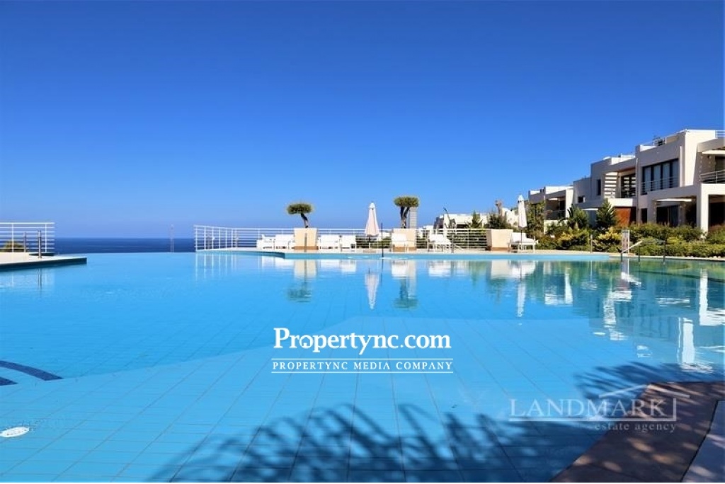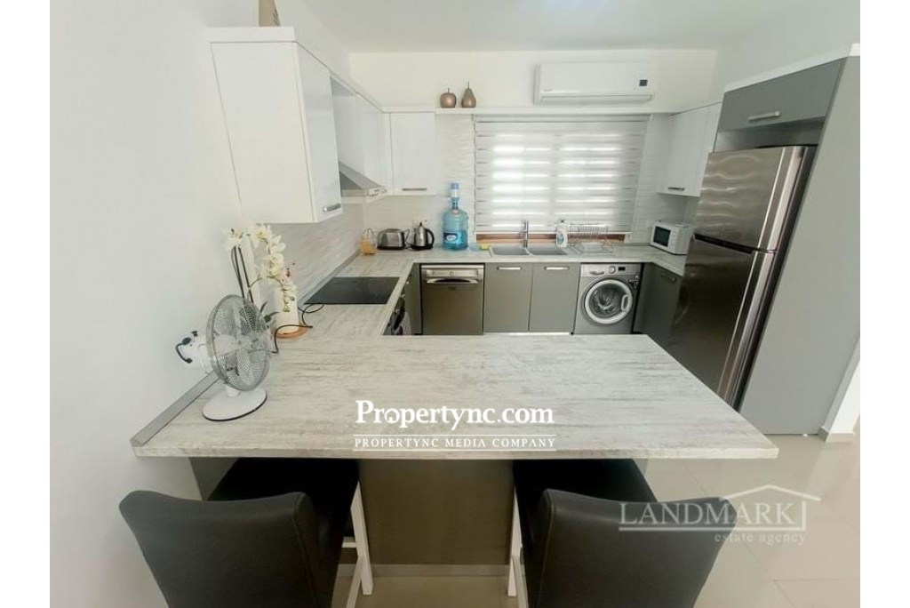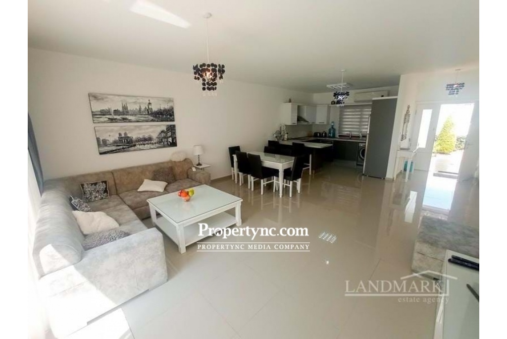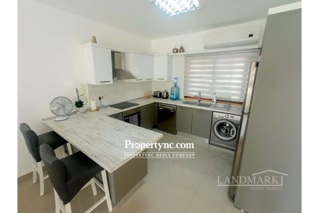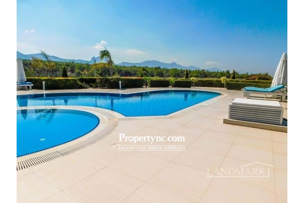 This lovely garden apartment is a fantastic opportunity to purchase a holiday home for luxury living at an affordable price. It is a part of a newly constructed estate consisting of 4 apartments in each block all sharing a communal pool. Apart from 3 double bedrooms, open-plan kitchen and lounge it benefits from spacious terrace with great views. The apartment has high quality furniture included in the price. The kitchen is fully fitted including the appliances. Inverter air conditioners are throughout and all bedrooms have fitted wardrobes. The site benefits from two overflow communal pools, beautiful landscaped garden, a gym, spa, restaurant, children play ground and tennis court and has a property management office. It is place to relax, a place to enjoy peace, quiet and relaxation. The site is about 20 minutes drive from Kyrenia and situated around the corner from Korineum Golf course. 133m² internal size approx. 30m² terrace Exchange Title deed Title deed on owner's name, VAT paid Communal swimming pools Fully furnished 3 bedrooms Master with en-suite shower Family bathroom with shower Fitted wardrobes Fitted kitchen with white goods Inverter air conditioners throughout Parking space in front of the block Beautiful large communal garden with a mix of plants and trees Fully equipped site (gym, sauna, restaurant, children play area) Property management office on site Shuttle service to nearby beach Maintenance: £145 - REF: 208v