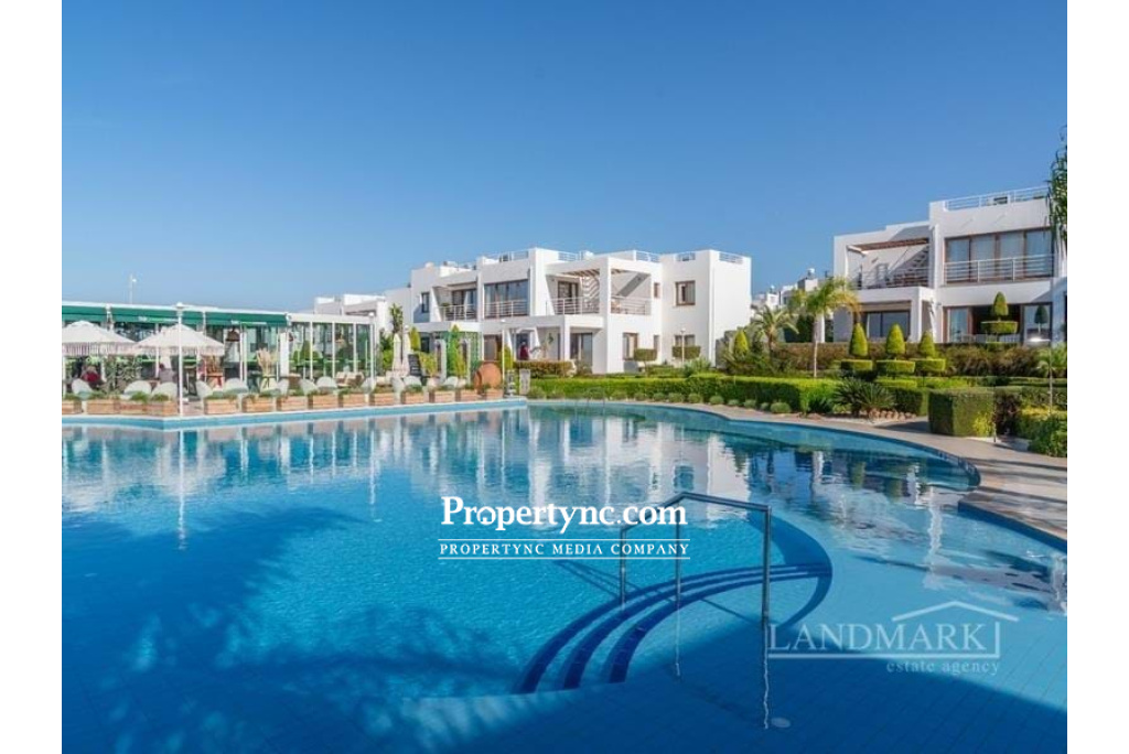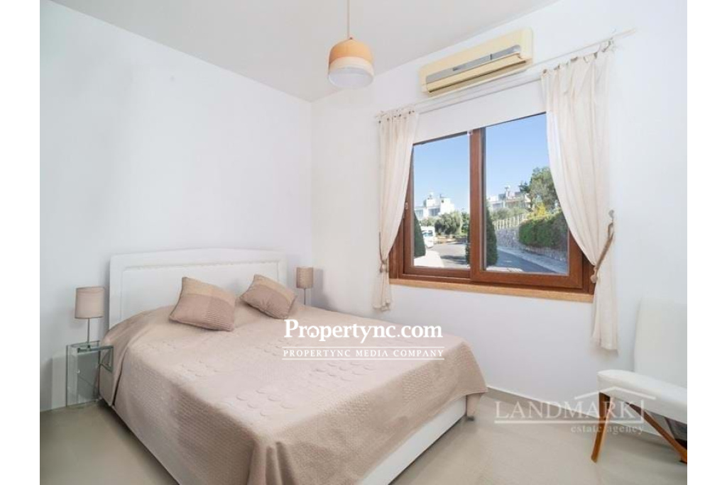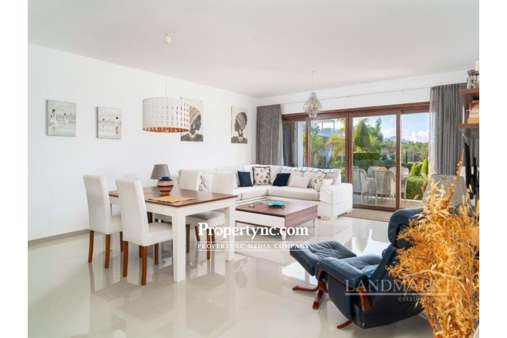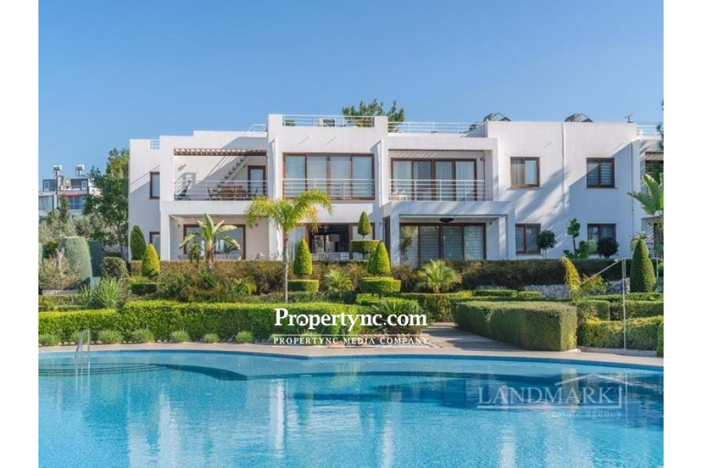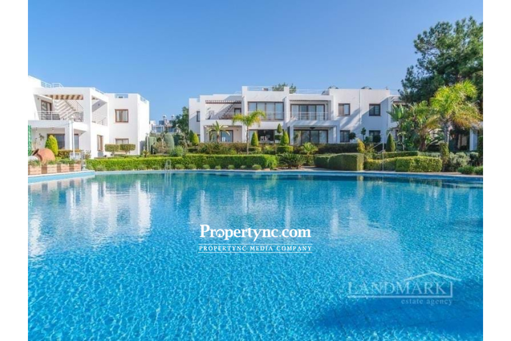 This lovely garden apartment is a fantastic opportunity to purchase a holiday home for luxury living at an affordable price. It is a part of a newly constructed estate consisting of 4 apartments in each block all sharing a communal pool. Apart from 3 double bedrooms, open-plan kitchen and lounge it benefits from spacious terrace with great views. The apartment has high quality furniture included in the price. The kitchen is fully fitted including the appliances. Fitted wardrobes are throughout and all bedrooms. The site benefits from several overflow communal pools, beautiful landscaped garden, a gym, spa, restaurant, children play ground, heart centre and tennis court and has a property management office. It is place to relax, a place to enjoy peace, quiet and relaxation. The site is about 20 minutes drive from Kyrenia and situated around the corner from Korineum Golf course. 136m² internal size approx. 30m² terrace Exchange Title deed Title deed on owner's name, VAT paid Communal swimming pools Fully furnished 3 bedrooms Master with en-suite shower Family bathroom with shower Fitted wardrobes Fitted kitchen with white goods Inverter air conditioners throughout Parking space in front of the block Beautiful large communal garden with a mix of plants and trees Bike rent Fully equipped site (gym, sauna, restaurant, children play area) Heart centre with additional gym, massage rooms, indoor pool and spa area Property management office on site Shuttle service to nearby beach 24 7 CCTV camera system - REF: 208r-2