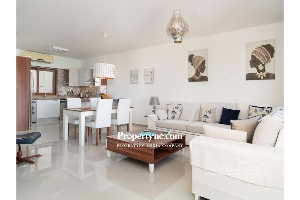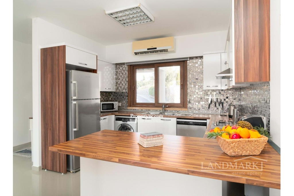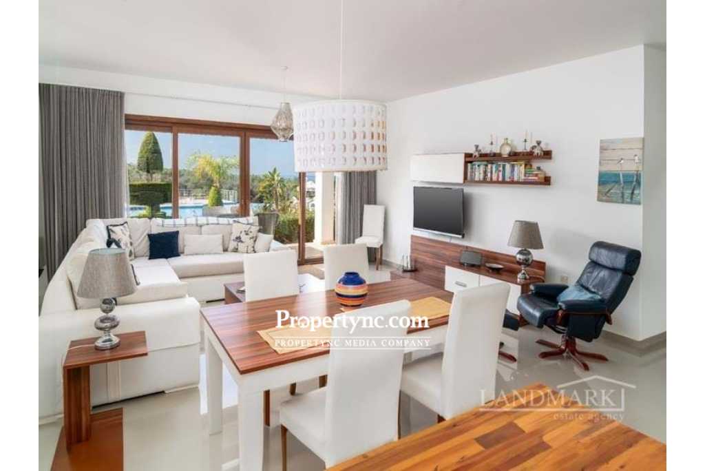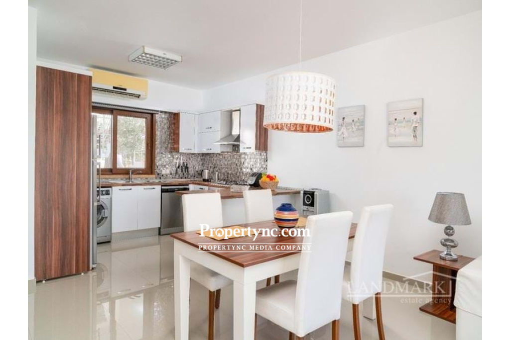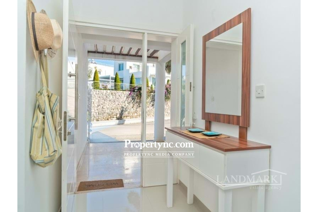 This lovely garden apartment is a fantastic opportunity to purchase a holiday home for luxury living at an affordable price. It is a part of a newly constructed estate consisting of 4 apartments in each block all sharing a communal pool. Apart from 3 double bedrooms, open-plan kitchen and lounge it benefits from spacious terrace with great views. The apartment has high quality furniture included in the price. The kitchen is fully fitted including the appliances. Fitted wardrobes are throughout and all bedrooms. The site benefits from several overflow communal pools, beautiful landscaped garden, a gym, spa, restaurant, children play ground, heart centre and tennis court and has a property management office. It is place to relax, a place to enjoy peace, quiet and relaxation. The site is about 20 minutes drive from Kyrenia and situated around the corner from Korineum Golf course. 136m² internal size approx. 30m² terrace Exchange Title deed Title deed on owner's name, VAT paid Communal swimming pools Fully furnished 3 bedrooms Master with en-suite shower Family bathroom with shower Fitted wardrobes Fitted kitchen with white goods Inverter air conditioners throughout Parking space in front of the block Beautiful large communal garden with a mix of plants and trees Bike rent Fully equipped site (gym, sauna, restaurant, children play area) Heart centre with additional gym, massage rooms, indoor pool and spa area Property management office on site Shuttle service to nearby beach 24 7 CCTV camera system - REF: 208r-2