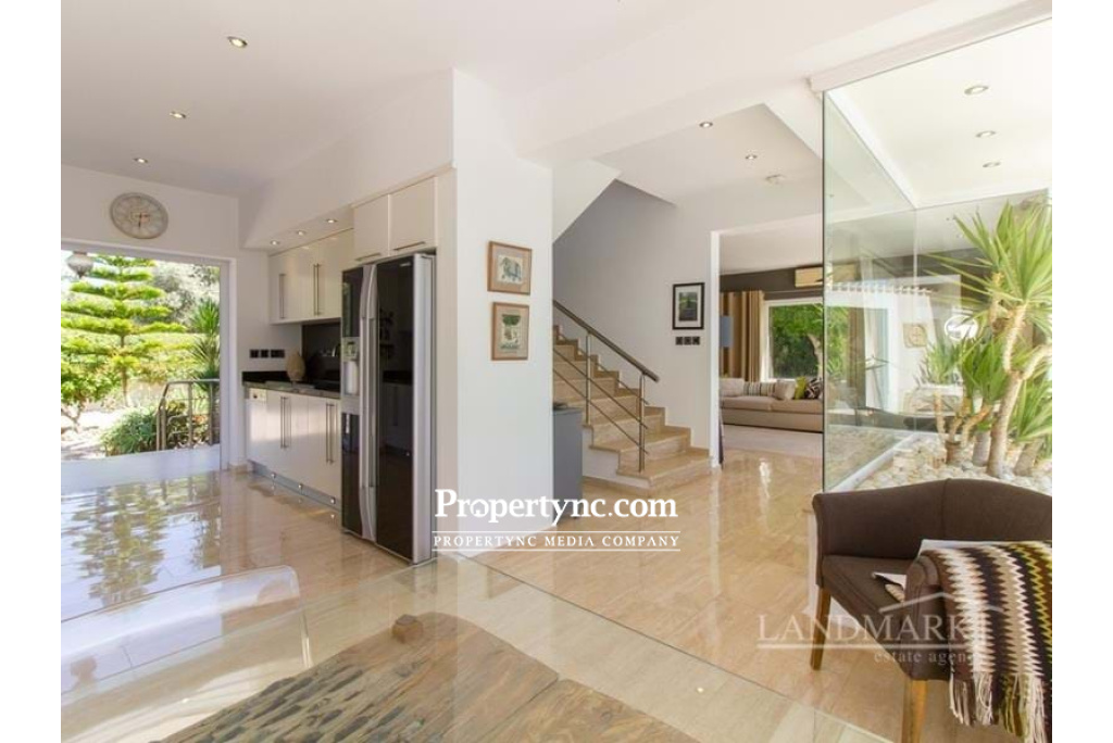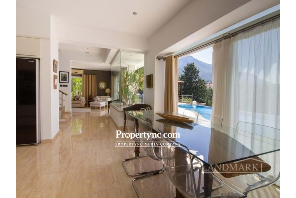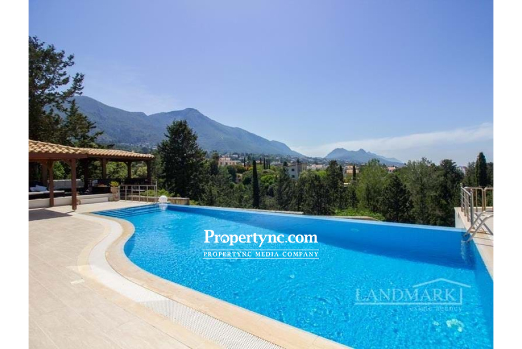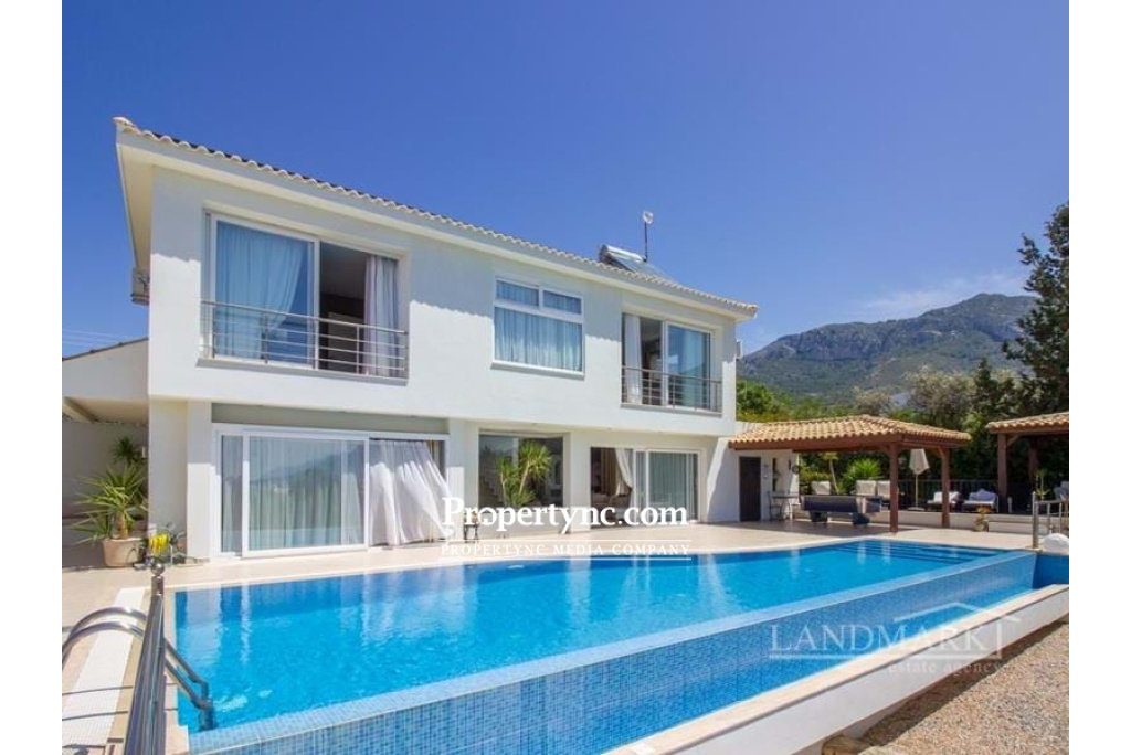 This exquisite luxury villa is located in the most sought-after area of Kyrenia, the Bellapais region, bordering Ozankoy and Catalkoy. The villa is elevated and has incredible panoramic views overlooking an unspoilt ravine, the coastline of Kyrenia and its mountain range, as well as the famous Bellapais monastery. Walking through antique wooden doors, you enter into a beautiful courtyard. On the left side there is a stone seating area, and walking forward there is a huge terrace and infinity pool with breath-taking views. From the courtyard are the main villas double doors and entrance to one of the cottages. You enter the main villa directly into the dining and kitchen area, which includes integrated kitchen appliances and granite worktops. From the kitchen, there is access to a lovely outside seating area which can be transformed into an outdoor cinema in the warmer months. Further down the hall past a planted atrium there is a spacious living room area which is surrounded by glass windows and sliding doors that lead out to the terrace and the pool. On the ground floor, there is also a utility closet and w c. The floors throughout are ceramic and the open stairs are travertine marble leading up to the 1st floor. The master bedroom has an ensuite shower room, a walk-in wardrobe with a private French balcony, and an elevated round bath looking out the window to a panoramic view over Bellapais. 2 other bedrooms share a family bathroom and have fitted wardrobes. The property includes 2 x self-contained cottages. Each has an ensuite shower room, bedroom area, fitted wardrobes and kitchenettes, as well as separate private entrances and a private balcony overlooking the ravine. These cottages could be used for personal use or can also be rented out separately. The garden is fully landscaped with pebble stones and a mixture of mature trees, fruit trees, flowers and plants. There are numerous outdoor seating areas. The villa is surrounded by a natural stone wall. There is an outdoor storage area, as well as a spacious storage room underneath the pool that can be used as a workshop. 250m2 internal area 270m2 including terraces 919.93m2 plot size Exchange title deed Completed 2011 Title deed in the owners name VAT paid Shaped infinity swimming pool with LED lights Courtyard with stone seating 5 bedrooms (3 in the main villa, 2 in the cottages) 4 shower rooms in total Fully fitted kitchen Kitchen appliances Air conditioning x 5 (including 2 inverted) Central heating with combi boiler Utility room Outdoor living room Raised decking with 2 wooden pergolas. 2 x 15 tonnes water tanks 5 KW Photovoltaic system with battery backup (solar). Natural stone wall surrounding the villa Mature established garden - REF: 2011