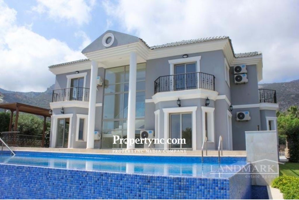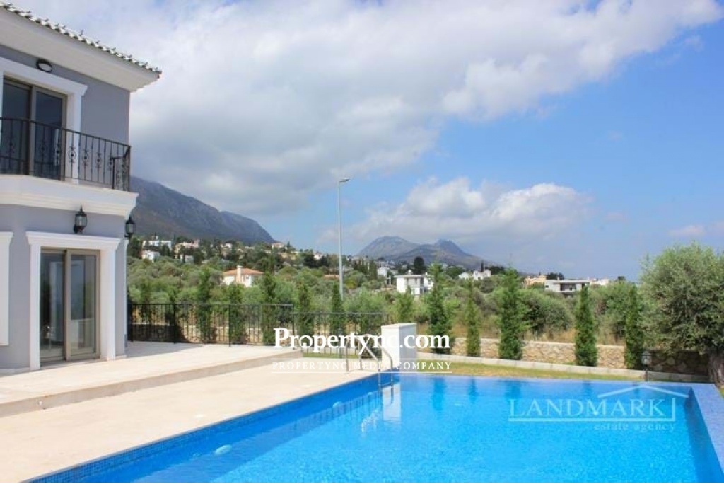 Located in the most sought-after area of Bellapais is this 3 bedroom luxury villa with a swimming pool, landscaped garden, and wonderful views of the sea and mountains. The house is really spacious, located in an elite area within a quiet neighbourhood. On the ground floor, you enter into a roomy entrance hall with floor to ceiling built-in cupboards, a storage area with shelves, and a guest WC. There is a double-sized lounge that has access to the main terrace which is overlooking the pool with wonderful sea views and to the side is another terrace taking advantage of its mountain views. The kitchen is on the opposite side to the lounge and is separate with a modern fitted kitchen having an integrated cooker, hob, extractor, and a quartz worktop. The dining area is open to the kitchen and has two accesses to the terraces, one is to the main front terrace, the other one leads to the side terrace. There is marble flooring on the ground floor, laminate flooring in all bedrooms, and ceramics in the bathrooms. Air conditioning, central heating, and spotlights are throughout. There is a marble staircase with a huge window overlooking the pool. On the first floor are all 3 bedrooms. The master bedroom is with en-suite bathroom with a bath, a walk-in wardrobe, and a balcony with amazing views. Two more bedrooms have fitted wardrobes and there is one further en-suite shower bathroom. There is a separate utility laundry room with built-in wardrobes leading to a family bathroom with a bath. Outside is a lovely swimming pool which is infinity on 2 sides and the patio area leading directly to the house. The villa is set on a large plot size it has been beautifully landscaped with grass and paths and includes 5 olive trees. There is a large paved entrance drive with a garage and the whole plot has a stone wall surround. 330m2 internal area 1338m2 plot size Exchange title deed Completed 2020 Title deed ready to transfer VAT payable Infinity swimming pool 5m x 10m 3 bedrooms all with fitted wardrobes 3 bathrooms, 2 en-suites, one family bathroom, plus a W C 1 double sized lounge Open plan kitchen with oven, hob, and extractor Quartz worktops Gas central heating Air conditioning throughout, 8 units Spotlights throughout Double glazed metal colour aluminium windows Utility laundry room Terraces on the ground floor to the pool area 5 tonnes water tank Paved car parking Garage Stone wall surround Landscaped garden with grass. 5 olive trees and a fig tree - REF: 1793