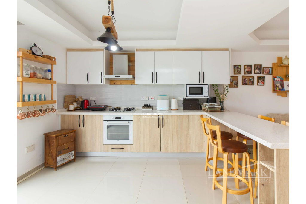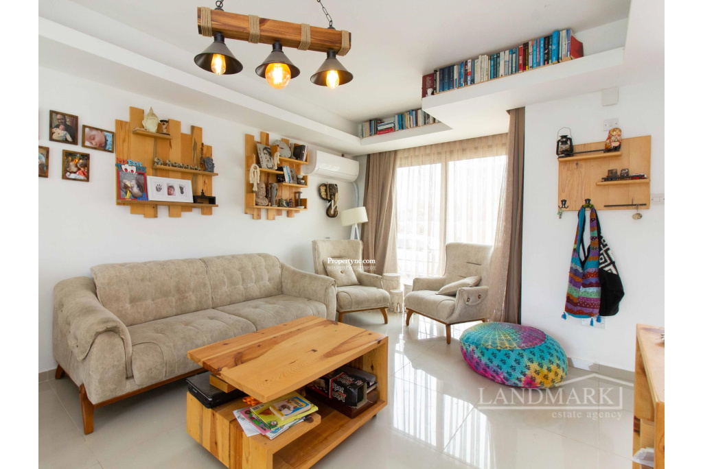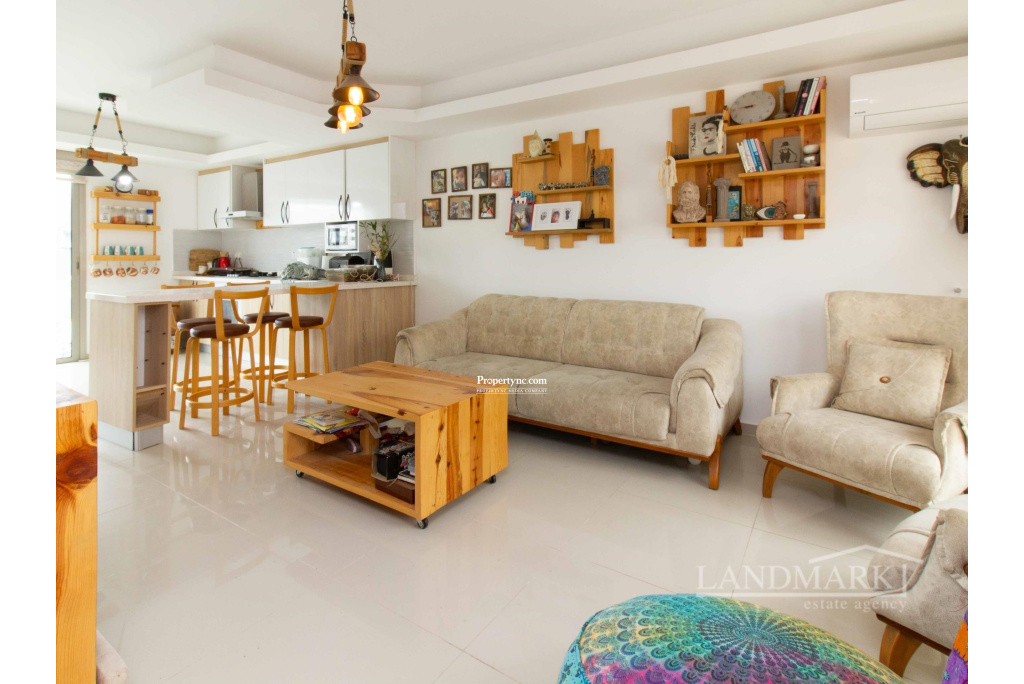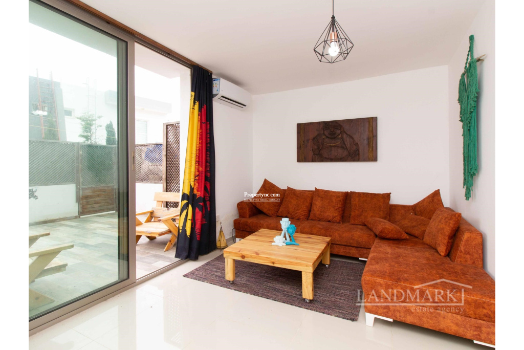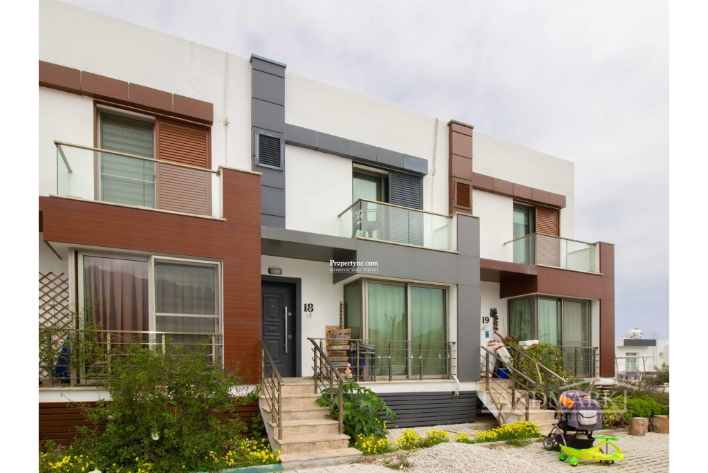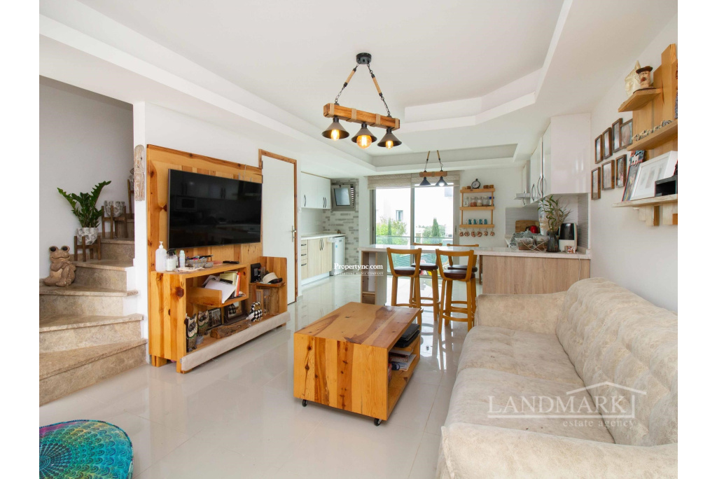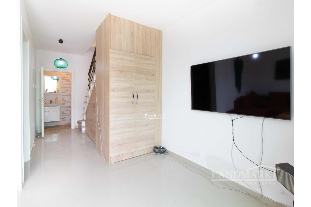 Upon entering this exquisite triplex townhouse, you're immediately welcomed by an open-plan kitchen and living area as well as stairs that go to the first floor. The blend of modern design and cozy comfort is both inviting and relaxing. The kitchen features elegant wood cabinets and sleek white countertops, balanced by chic bar stools for casual dining. On the left side of the kitchen there is a door that opens up to the stairs that go down to the lower level. Moving down to the lower level, a thoughtful layout maximizes privacy and convenience. A nearby toilet adds comfort and accessibility. To the right, a spacious bedroom with floor-to-ceiling wardrobes offers ample storage without sacrificing style. Further exploration reveals a secondary living room that opens to a large terrace. Floor-to-ceiling windows fill the room with natural light. Furnished with plush couches, this space is perfect for quiet moments of privacy. On the first floor, you'll find the ultimate luxury with two ensuite bedrooms, each with its own unique charm. Balconies offer breathtaking views of mountains from one room and the serene sea from the other. In this triplex townhouse, attention to detail and thoughtful design combine to create a comfortable living experience, filled with warmth and sophistication. 135m² internal area 155m² including terraces Exchange title deed Completed in 2021 Title deed in the owners name VAT paid Common swimming pool 2 en-suite bedrooms all to the first floor with showers 1 bedroom to the lower floor 2 living room one on the ground floor and one on the lower level 1 W C to the lower floor Fully fitted kitchen Kitchen appliances 5 tonnes of water storage Open parking space Terrace on the lower floor - REF: 2148