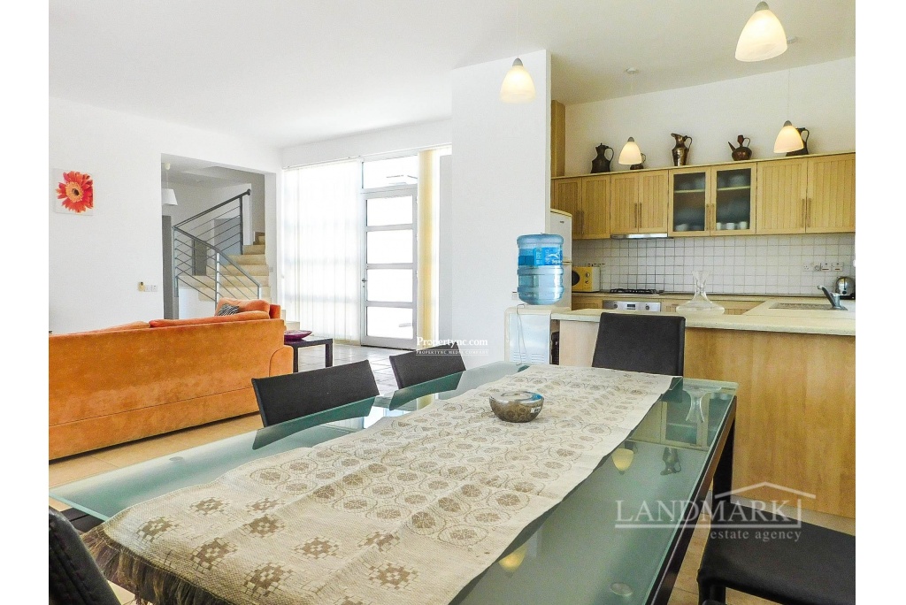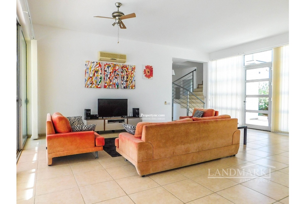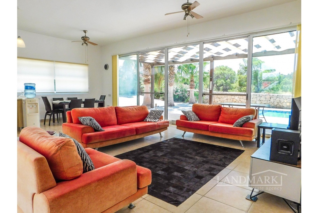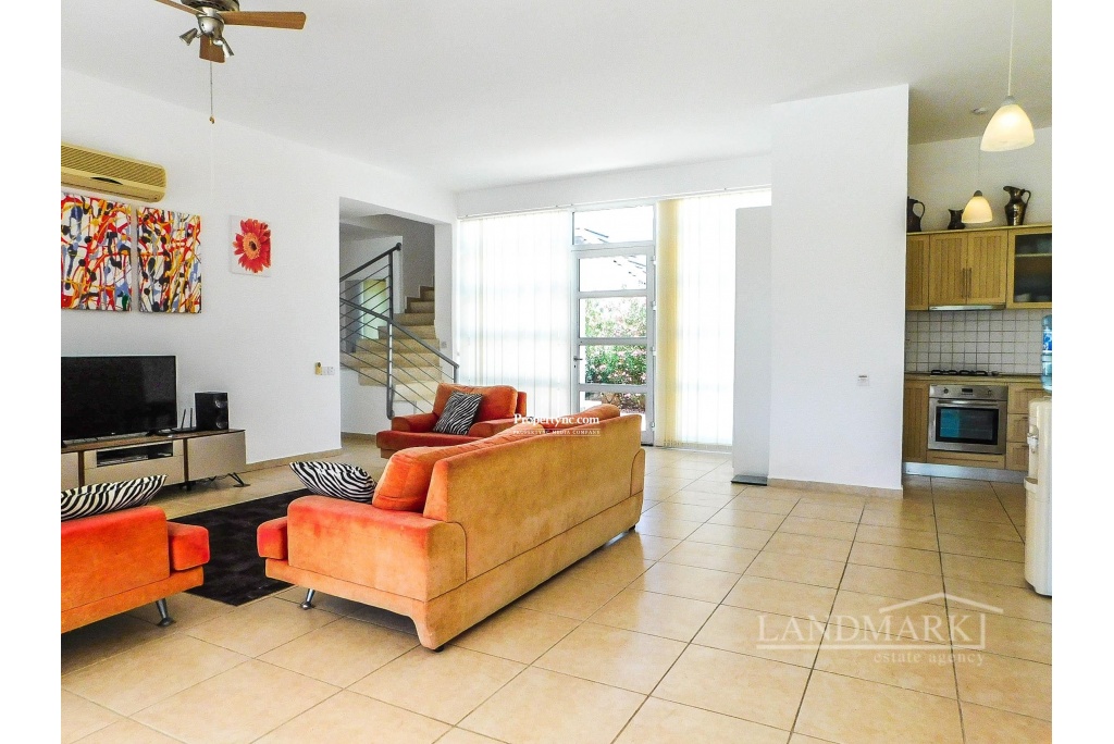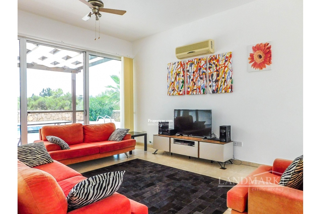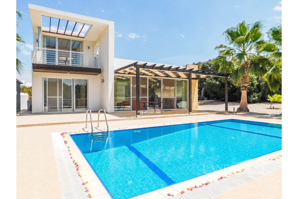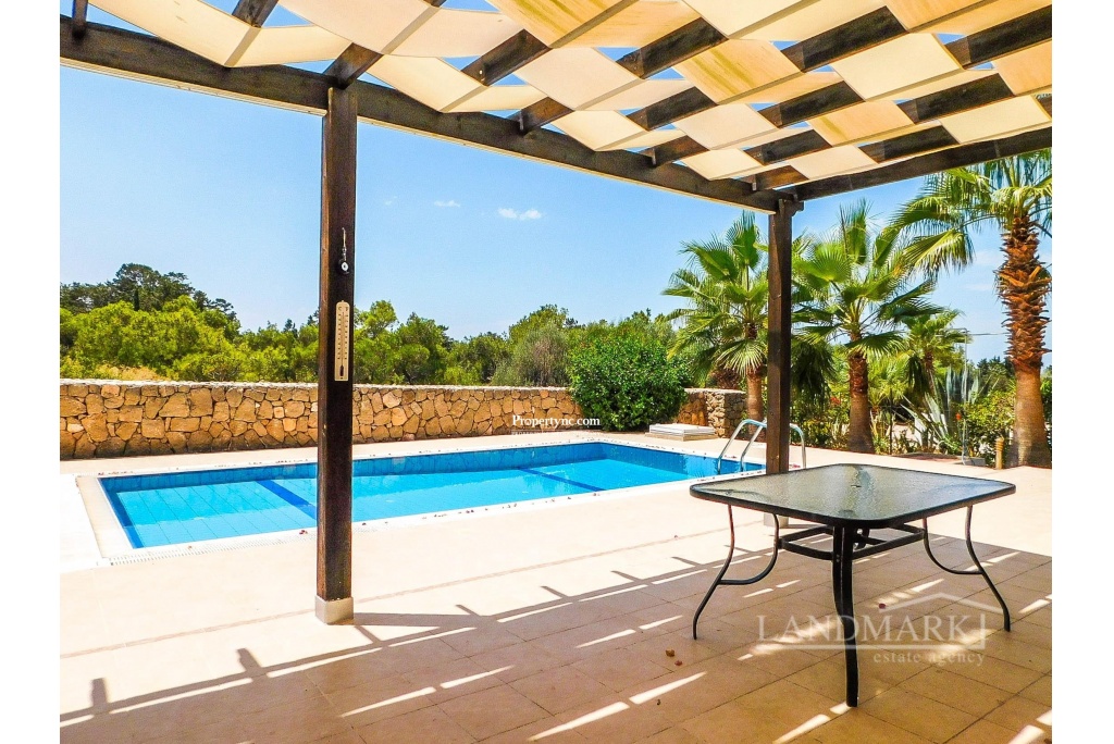 This beautiful villa is located at close proximity to the Mediterranean Sea in a lovely resort area and is ready to move in. To the ground floor the villa comprises of a spacious lounge, open plan kitchen and wide patio doors which lead to a spacious terrace overlooking the pool area with a view to a pine forest. There are 2 bedrooms on the ground floor, sharing one bathroom. The master bedroom is on the first floor and has an en suite bathroom and there is extra storage on the landing. The villa is fully air conditioned, equipped with modern kitchen appliances and every bedroom has wardrobes. The garden is landscaped and pebbled for easy maintenance. The villa is part of a development with tennis court, 7 communal swimming pools, 2 bars, 1 restaurant and gym. The villa is only few minute walk to a private beach which is also part of the development. 165m2 internal approx. 700m2 land size Exchange title Title deed on owners name, VAT paid Completed in 2005 10m x 5m pool 3 bedrooms Master with en suite Family bathroom with bath Kitchen appliances Air conditionings x 3 Central heating infrastructure Excellent area to purchase a home Close to the beach Roof terrace Stone wall surround Fully furnished - REF: 104t
