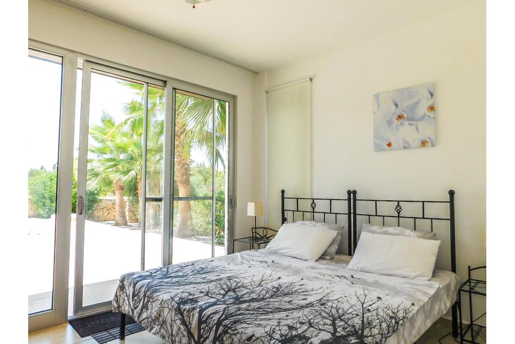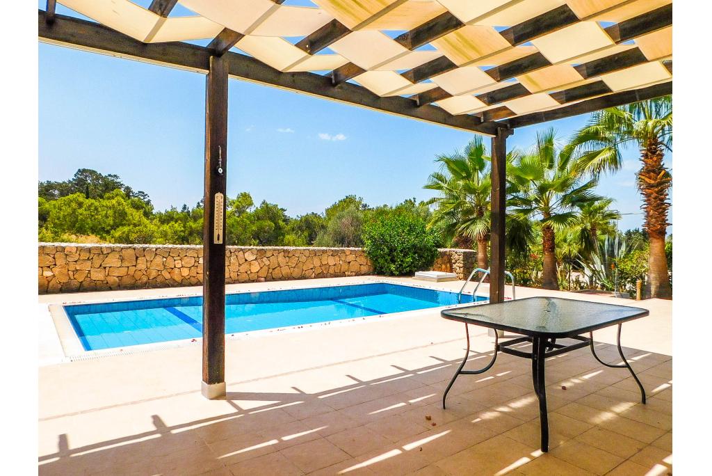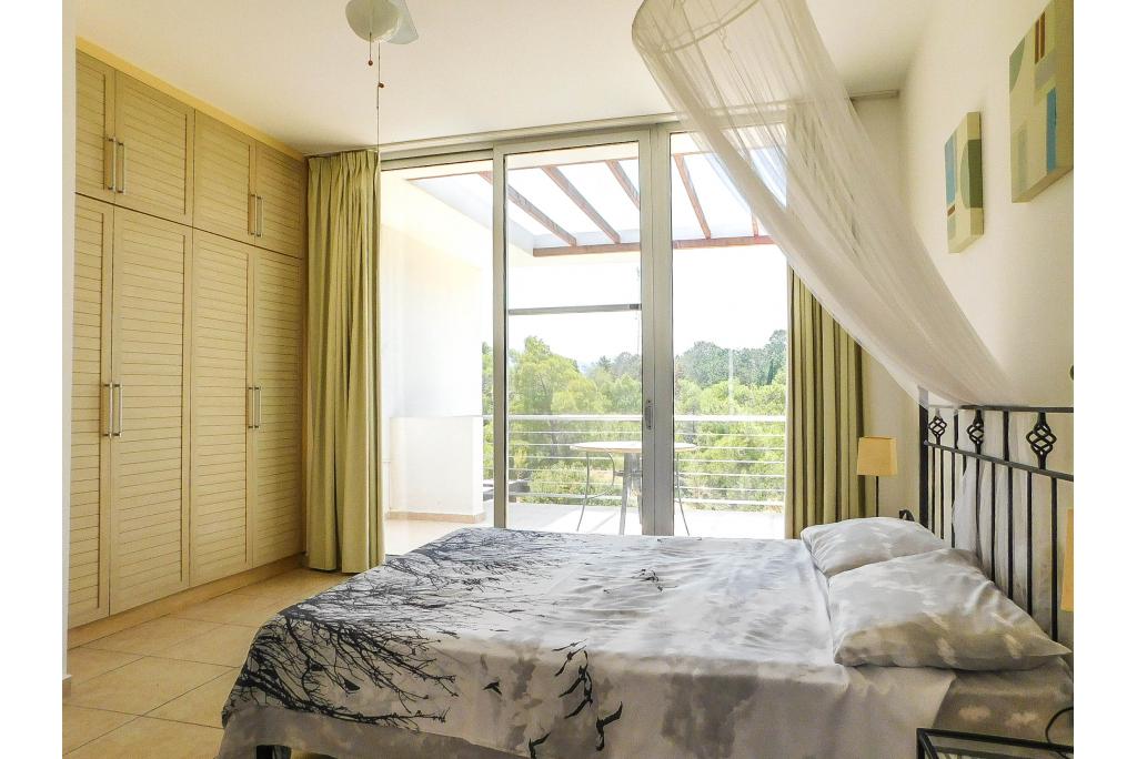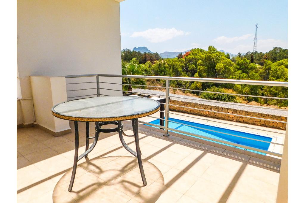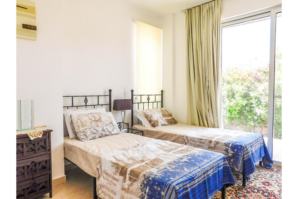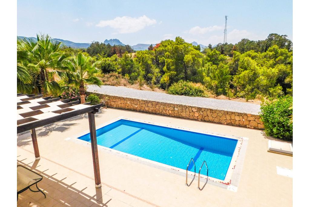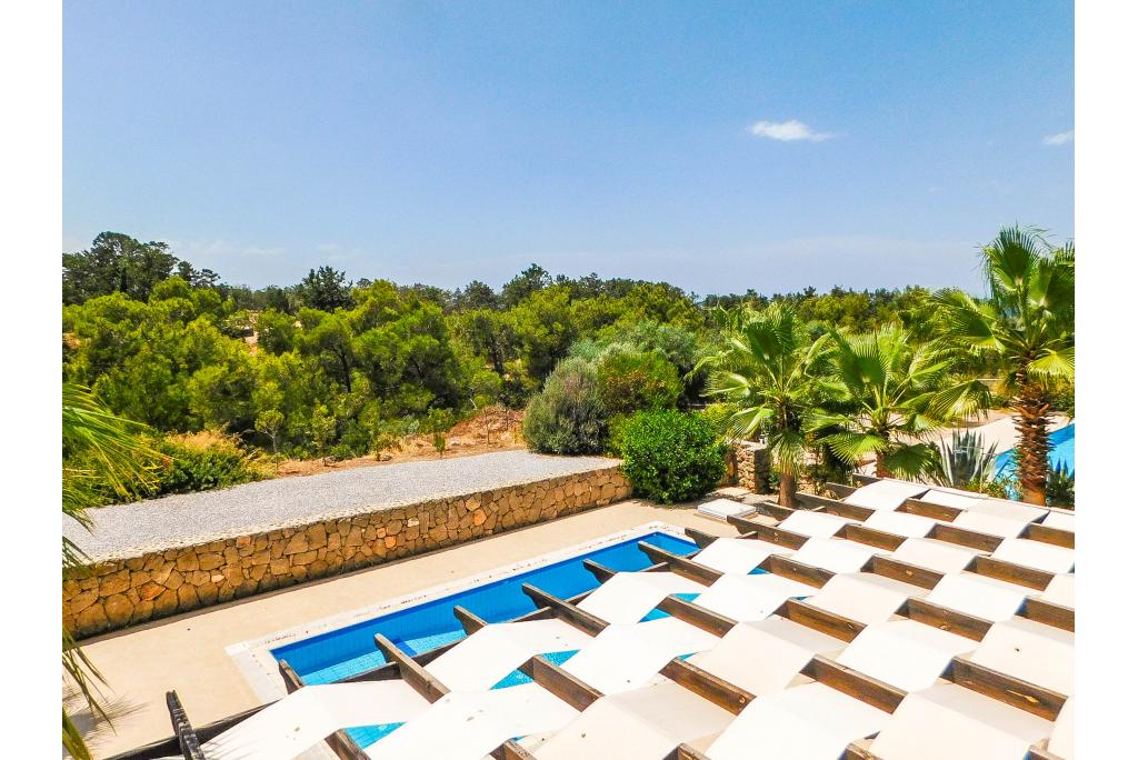 To the ground floor the villa comprises of a spacious lounge, open plan kitchen and wide patio doors which lead to a spacious terrace overlooking the pool area with a view to a pine forest. There are 2 bedrooms on the ground floor, sharing one bathroom. The master bedroom is on the first floor and has an en suite bathroom and there is extra storage on the landing. The villa is fully air conditioned, equipped with modern kitchen appliances and every bedroom has wardrobes. The garden is landscaped and pebbled for easy maintenance.