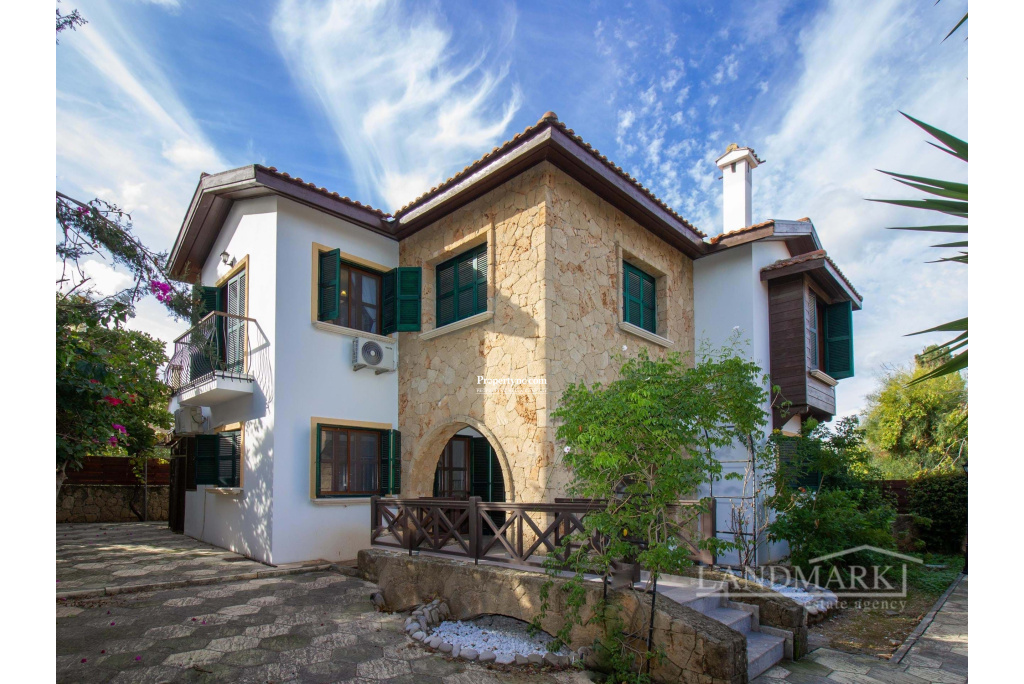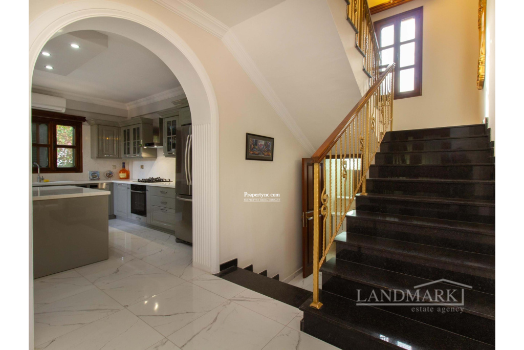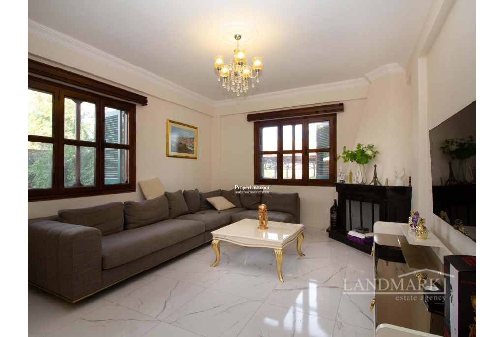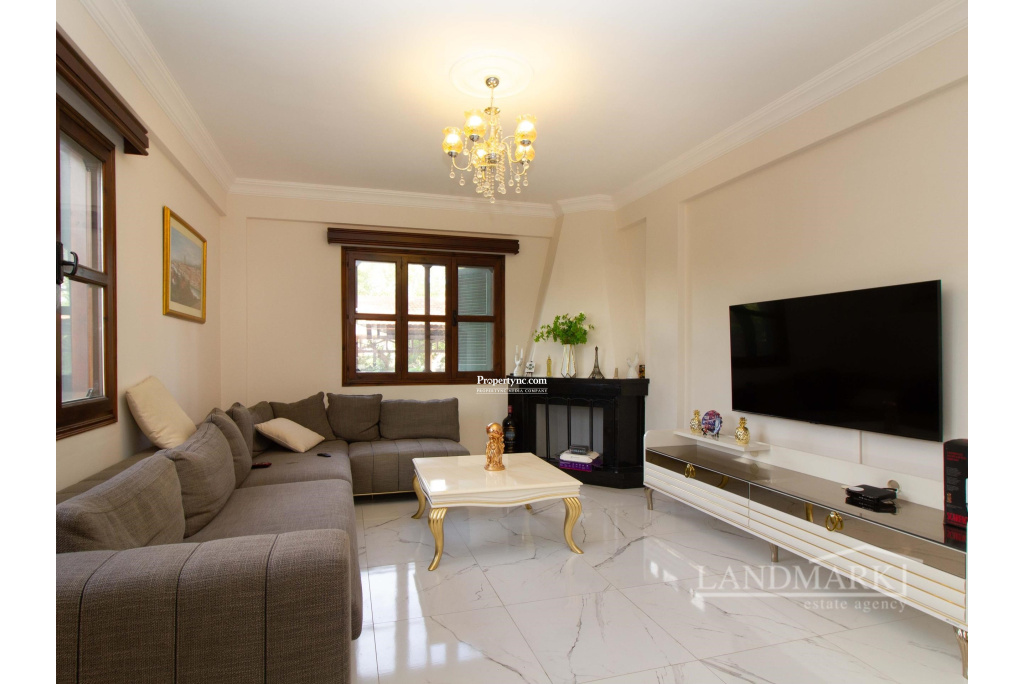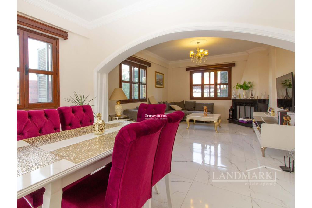 This villa, located in a prime spot in Catalkoy, is within walking distance of shops and on a bus route. Enclosed by mature trees, the house offers excellent privacy. The well-maintained garden, filled with a variety of trees and plants, is a fantastic starting point for gardening enthusiasts. The property features a covered garage for two cars, surrounded by a garden, and a BBQ area in the back garden with a mountain view. The interior begins with an open-plan layout, including a tastefully furnished lounge and dining area. A covered terrace with garden furniture off the dining area provides an ideal spot to enjoy the morning sun. The well-equipped kitchen includes modern white goods and opens onto a front terrace overlooking the garden. The first floor consists of three bedrooms. The master bedroom features an en-suite bathroom and full-length mirrored wardrobes, and opens to a balcony. The other two bedrooms are spacious and include large, fitted wooden wardrobes. The family bathroom features a shower cabin with a stylish gold and marble design. Given its prime location by the main road, the house could be an excellent candidate for conversion into an administrative building. The vacant land in front of the house could serve as a parking area. Overall, this is a charming house with significant investment potential. - REF: 2090