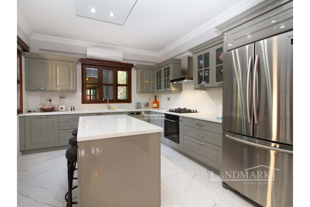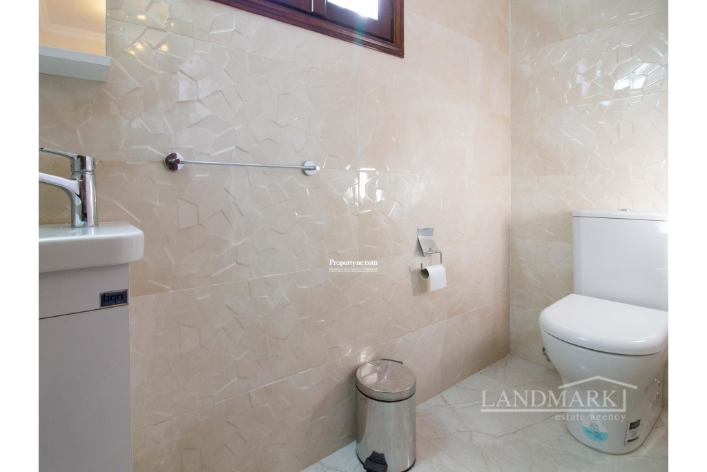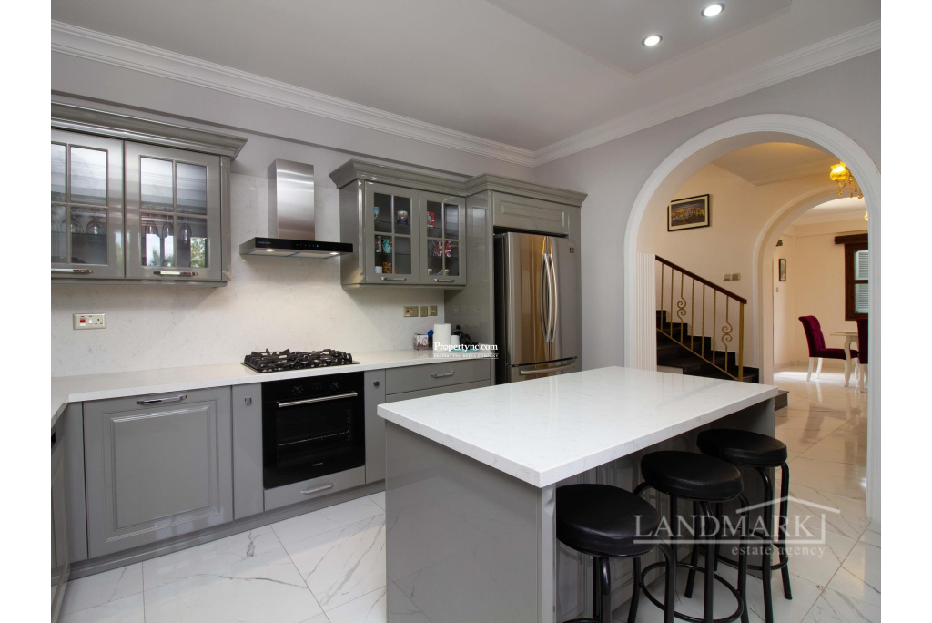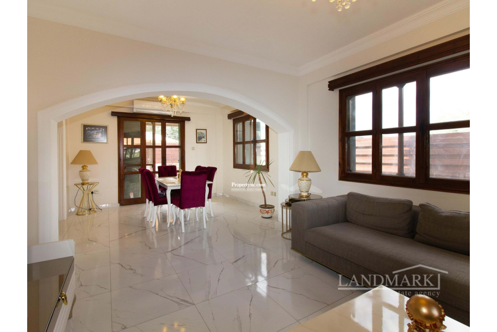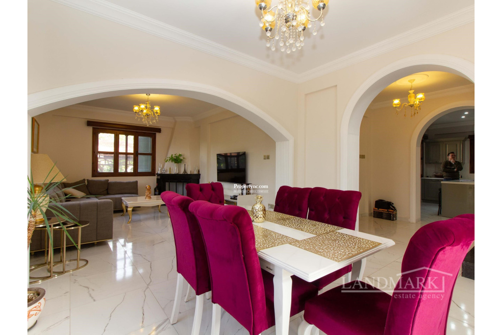This villa, located in a prime spot in Catalkoy, is within walking distance of shops and on a bus route. Enclosed by mature trees, the house offers excellent privacy. The well-maintained garden, filled with a variety of trees and plants, is a fantastic starting point for gardening enthusiasts. The property features a covered garage for two cars, surrounded by a garden, and a BBQ area in the back garden with a mountain view. The interior begins with an open-plan layout, including a tastefully furnished lounge and dining area. A covered terrace with garden furniture off the dining area provides an ideal spot to enjoy the morning sun. The well-equipped kitchen includes modern white goods and opens onto a front terrace overlooking the garden. The first floor consists of three bedrooms. The master bedroom features an en-suite bathroom and full-length mirrored wardrobes, and opens to a balcony. The other two bedrooms are spacious and include large, fitted wooden wardrobes. The family bathroom features a shower cabin with a stylish gold and marble design. Given its prime location by the main road, the house could be an excellent candidate for conversion into an administrative building. The vacant land in front of the house could serve as a parking area. Overall, this is a charming house with significant investment potential. - REF: 2090