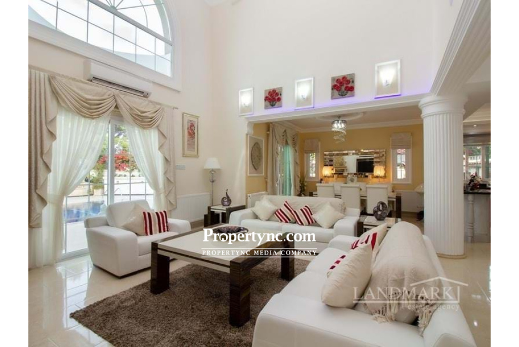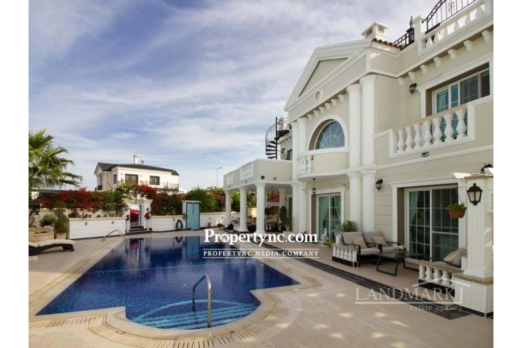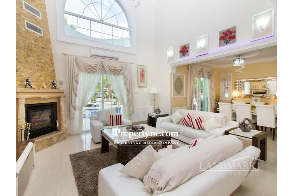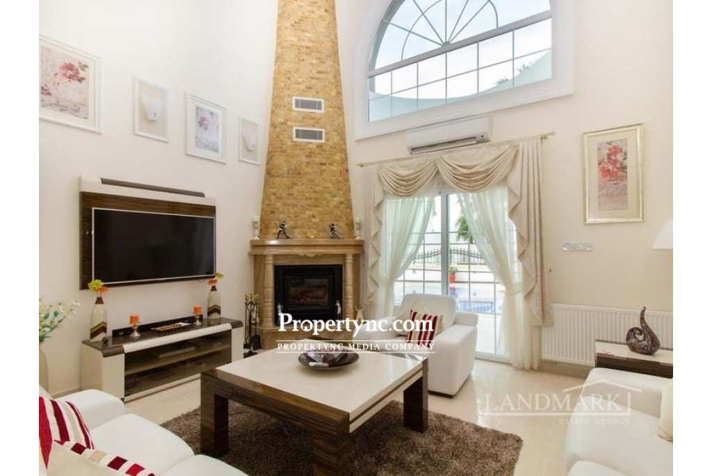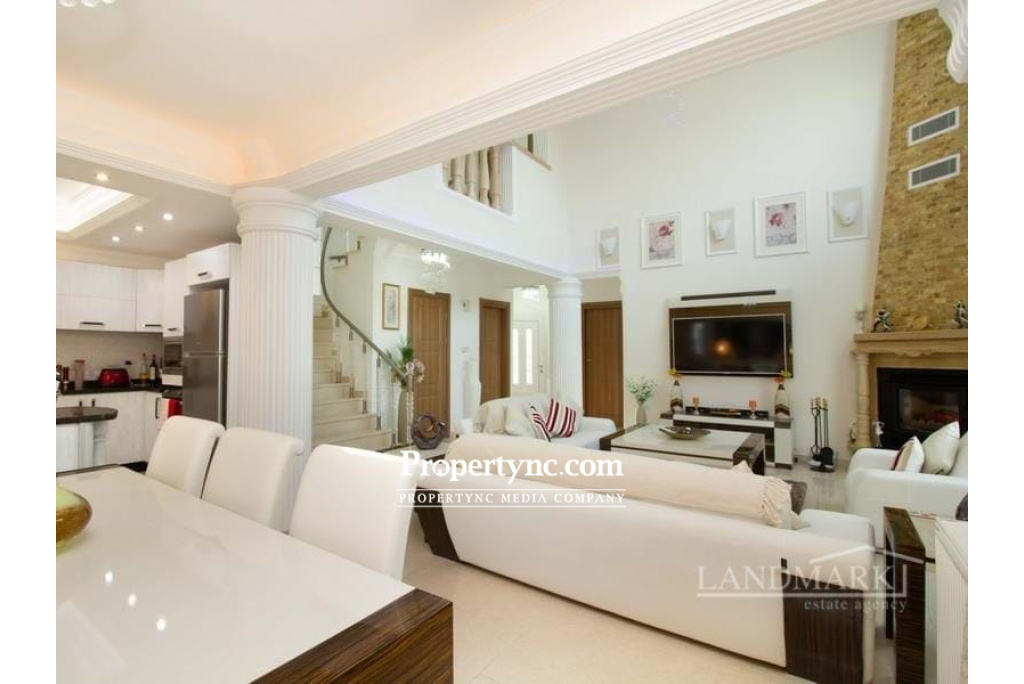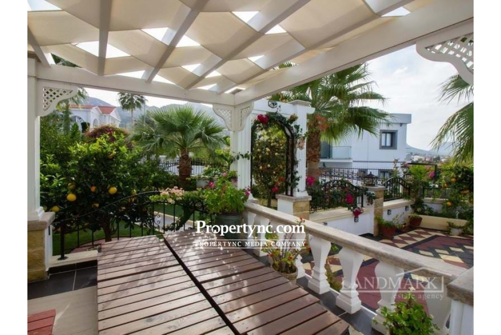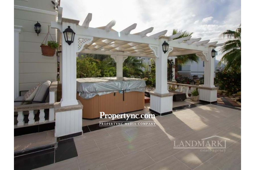 This spacious 3-bedroom villa is very modern and at the same time has a classic roman look! It is situated in one of the most demanded areas of Catalkoy, at the edge of a ravine, offering uninterrupted amazing views to the sea and mountains. The house comprises to a ground floor of a large modern living area with a high ceiling and a gallery landing. The lounge with a fireplace is open plan to a luxury kitchen dining area. Sliding doors are leading to a beautiful spacious terrace area, all around the villa, with a large private pool, outdoor jacuzzi, a BBQ area and a gazebo, as well as a beautiful landscaped garden area, which offers absolutely breath-taking views to the whole Kyrenia coast line. This modern designed villa has double glazed windows, lots of glass hand rails and glass balustrades at the landing and the pool area. On the ground floor is one bedroom and family bathroom with shower and an in-house garage. To the first floor you will find 2 double bedrooms all with fitted wardrobes, en-suite bathrooms and balconies with amazing sea and mountain views. Two bedrooms are benefiting of en-suite bathrooms. From the master bedroom there is private access to a rooftop terrace which includes built in seating areas and a storage facility. 3 bedroom villa 2 en suite bathrooms +1 family bathroom 165m2 internal size approx 700m2 approx plot size Exchange title deed Title deed in owners name, VAT paid Completed in 2013 5m x 10m swimming pool with marble overflow Fitted luxury open-plan kitchen with granite worktops Aluminium double-glazed windows Fireplace Ceramic flooring In-house car garage Landscaped garden Outdoor Jacuzzi Outdoor bar including 2 fridges BBQ Gazebo Water fountain 2 x Water Tanks Utility room Stunning views of the Kyrenia coast line and Besparmak mountains - REF: 2083