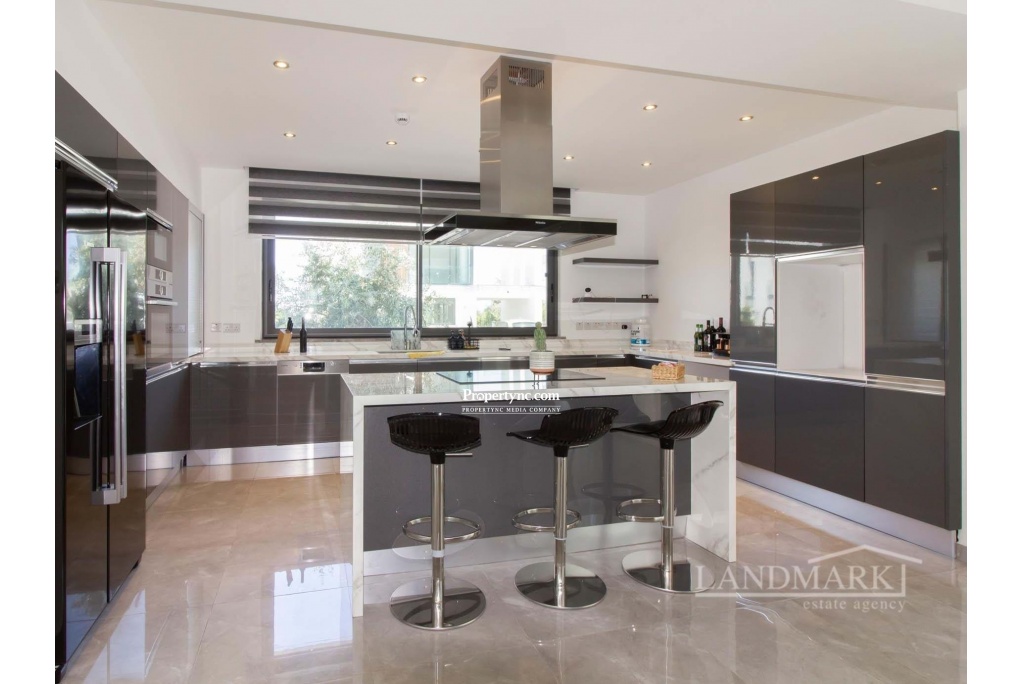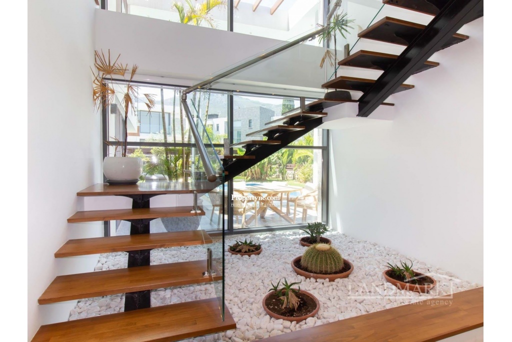 Internally the villa is very spacious and has been designed for convenience, completed using top quality, stylish and tasteful materials the villa is harmonious throughout. The entrance hall is an open space with a wooden staircase with a glass balustrade leading to the first floor and there is a huge glass-windowed wall overlooking the garden and pool. The lounge which includes a fireplace has a modern interior and is open plan to a well-equipped kitchen with a porcelain effect island and worktops and has high-quality white, silver, and black goods. The lounge has large sliding doors that can be moved completely to the side and offers great views into the beautiful landscaped garden and terrace area with all kinds of fruit trees, such as pomegranate, mango, orange, cumquats, bananas, and cactus. There is also a utility room and a family bathroom on the ground floor. Through a locking door, there is access to a closed garage. On the first floor, there are 4 bedrooms, of which two are currently used as a gym, and a study. The large-sized master bedroom is with a cloakroom and an en-suite. Again all windows can be opened completely by moving them to one side. The study has access to a lovely terrace with cosy furniture and a sea view. The house has an integrated cooling and heating system, surveillance cameras, and alarm system. This modern stylish luxury villa is ready to move in and you can enjoy your Mediterranean lifestyle from day one! 295m2 internal area 580m2 plot size Pre 74 Turkish title deed Completed 2020 Title deed in the owners name VAT paid 8m x 4m swimming pool Furnished 4 bedrooms upstairs in total 2 bedrooms with fitted wardrobes 1 bedroom used as gym 1 bedroom used as a study 1 guest bathroom to the ground floor Master bedroom with walk in wardrobe and en-suite Fully fitted modern kitchen High quality kitchen appliances Utility room Integrated cooling and heating system Open fire place Air conditioning x 6 Fly screens throughout Automatic curtains Smart online Irrigation system Designers wooden-glass staircase 3 tonnes of water storage Garage with automatic door Stone wall surround with entrance gate Alarm system with surveillance cameras Mature established garden with exotic plants - REF: 1771a