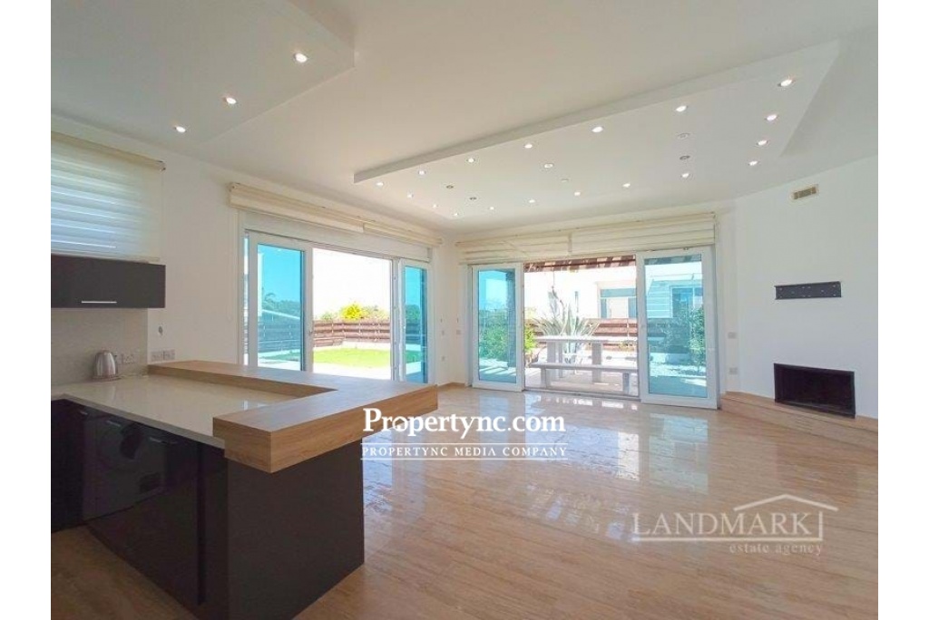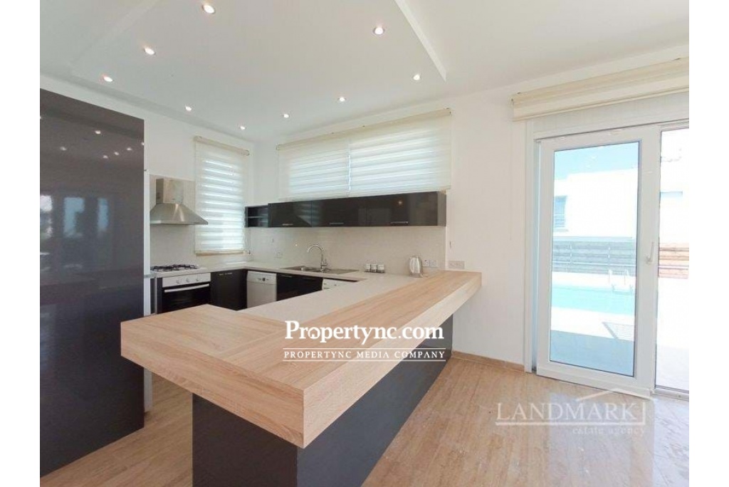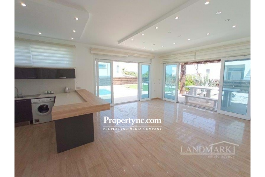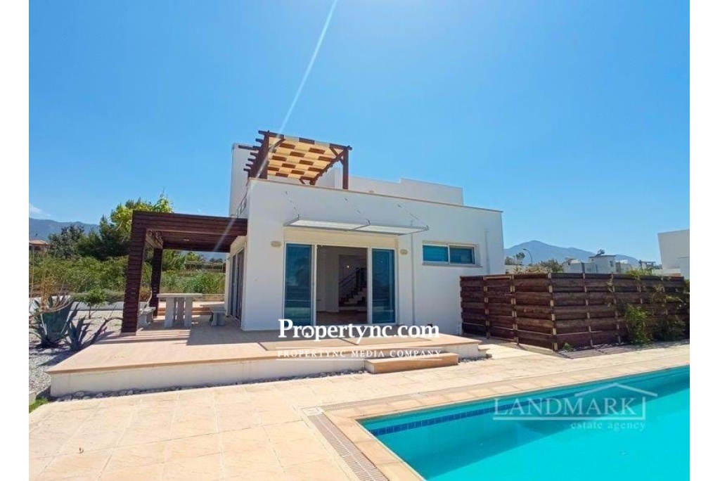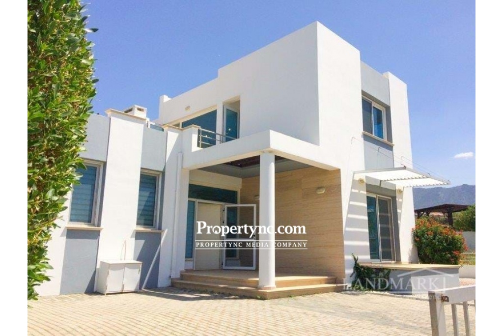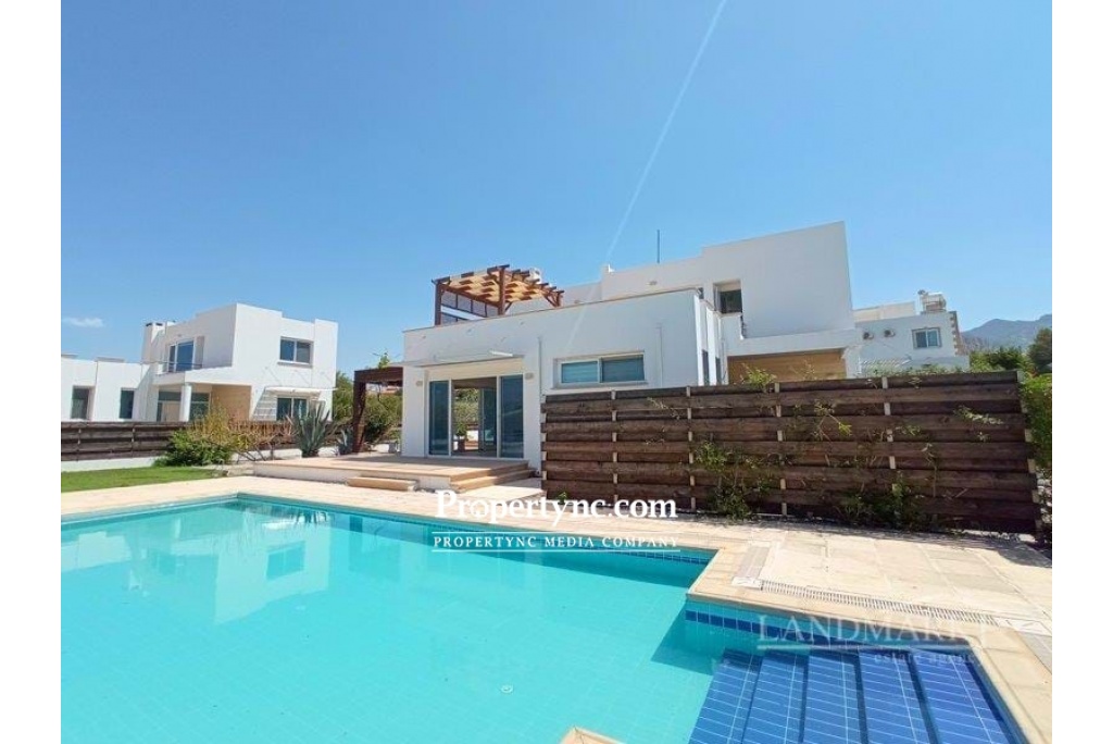 This amazing seaside-located villa has just been newly renovated so everything inside is ready for the new owner to move in. The villa is on a gated community with a large garden and a private swimming pool and is situated in a quiet picturesque area of the popular village Catalkoy. It has beautiful views of the sea and mountains. The sea is within a short walking distance and offers a private jetty and a small bay for swimming. On the ground floor, there is a spacious lounge with a fireplace. From the lounge, there is access to two big terraces with charming views of the swimming pool and of the garden overlooking the mountains. The garden terrace is equipped with a marble table and benches. It has a wooden pergola shade covered with a grapevine and gives shade bringing a pleasant coolness on a hot sunny day. The open plan kitchen has fully fitted kitchen units, high-quality modern white goods and limestone worktops. There are two bedrooms on the ground floor, with fitted wardrobes. Every bedroom has access to a terrace through a patio door. One bedroom has an en-suite bathroom, the second bedroom has a family bathroom nearby. Travertine staircase leads to the first floor with two more good sized bedrooms and a large terrace with a sitting area and a covered wooden pergola. Both bedrooms have en-suite bathrooms and built-in wardrobes with access to the main terrace having a wonderful view of the swimming pool and the Mediterranean Sea. This stunning home is ready to move in and offers a great rental potential as well! · Internal size 180m2 approx · 700M2 plot size approx · Exchange title deeds · Title deeds ready to transfer · VAT to pay · Completed 2009 · Swimming pool 10m x 5m · Fully furnished · 4 Bathrooms (3 en-suites), · 4 Bedrooms 2 beds up, 2 beds down · Open living area with access to the terraces and pool area · Fire place · Fitted Kitchen units · White goods · Fly screens · Spot lights · Unique seafront location · Spectacular Sea and Mountain views · Double Glazing Windows · High-Quality Materials · Big Landscaped Garden · Quiet and Peaceful Neighbourhood · Less than 100m distance to the sea & beach with jetty - REF: 208s