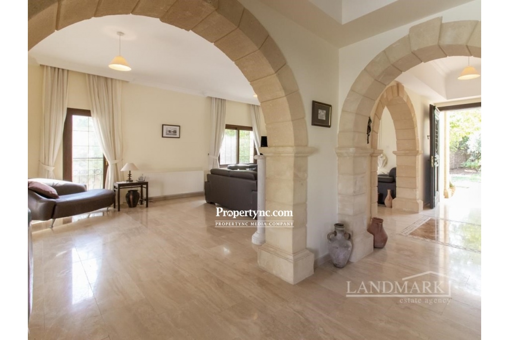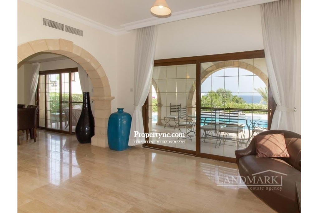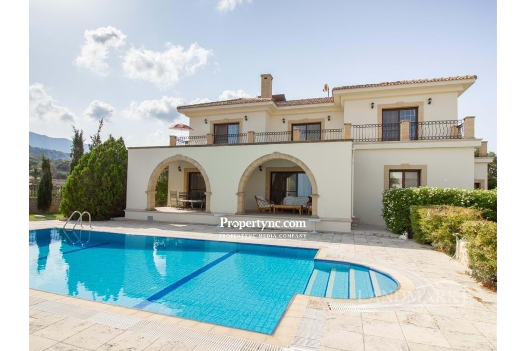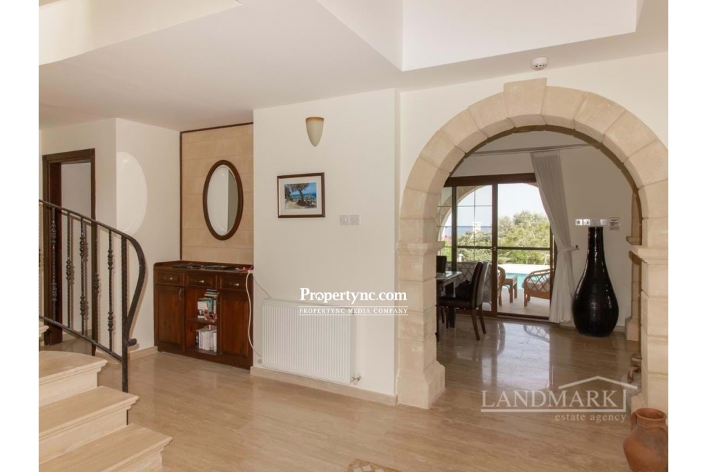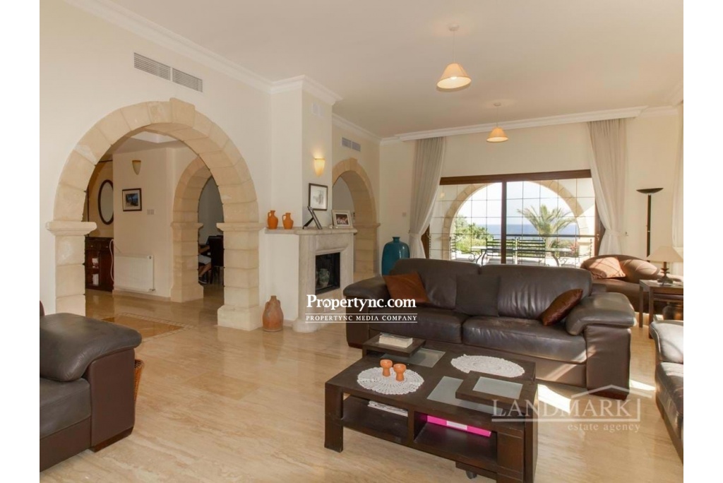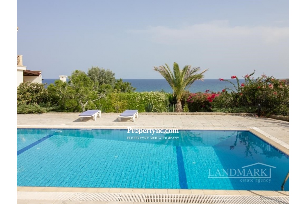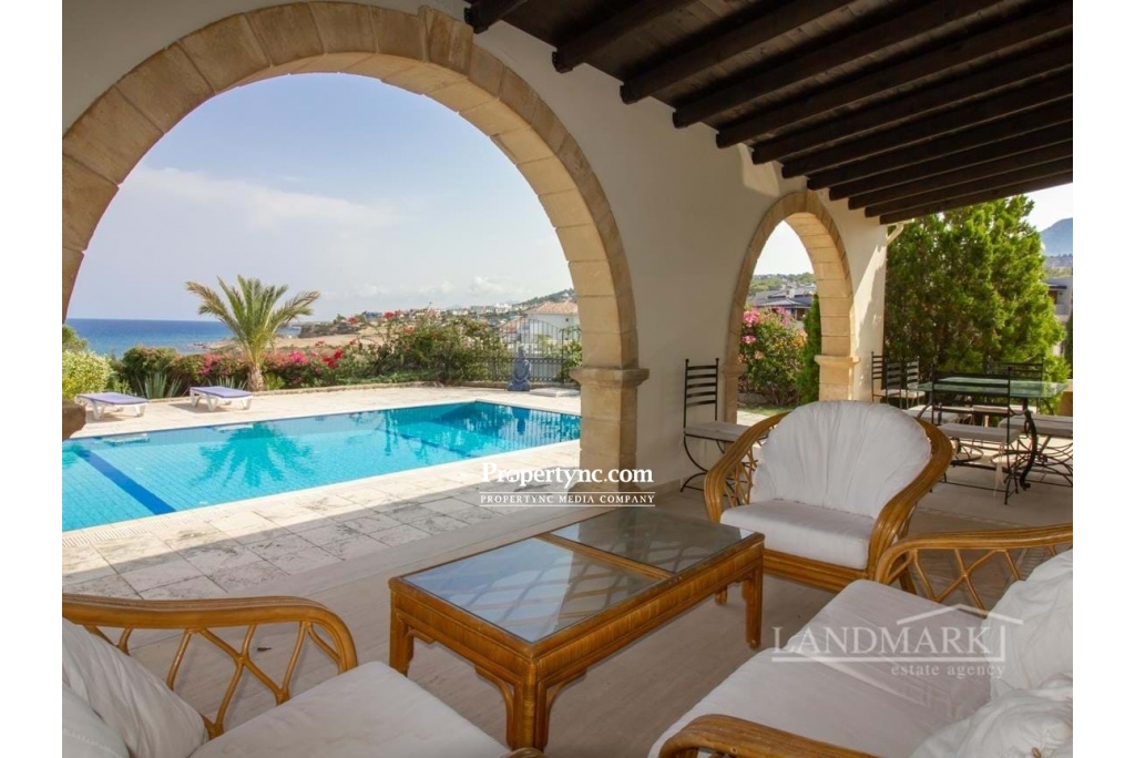 If you are looking for a perfect family home, then this is the right property for you!!!! This 4 bedroom resale Mediterranean-style designed villa is part of a small complex of seafront luxury villas with its own access to the beach! All villas are elevated and are located at the edge of a cliff and ravine which offers fabulous views of the sea, coastline, and mountains! The garden and pool area are very charismatic, overlooking the beach, and offer a fantastic outside living style. On entering the property you come to a hall with all the rooms coming off it, starting with the good size lounge with an open fireplace and is leading out onto a great covered terrace area facing the sea. Stone arches are dividing the lounge from the dining area. The kitchen is spacious and includes all integrated white goods. A utility room is attached to it and offers lots of space for storage. One double-size bedroom and one family bathroom are located on the ground floor. A sweeping staircase leads upstairs to the first floor where 3 bedrooms with en suites are located. They all benefit from fitted wardrobes and access to the large terrace area. The garden has been beautifully landscaped and includes established flowers and trees, surrounded by pebbled stone, which makes the garden easy to maintain. The villa is ready to move in and is a perfect holiday home for your family! Internal size 250 m2 Plot size: 1230m2 3 evlek, 2500 Ay Completed 2006 Exchange title deed Title deed in the owners name VAT paid 5m x 10m overflow pool Furniture's negotiable 4 bedrooms with fitted wardrobes 4 bathrooms - 3 en suite + 1 family bath Gas central heating system Central air conditioning system Open fire place in the lounge All silver white goods integrated Siemens Handmade wooden entrance door Internal wooden doors Brown PVC double glazed windows Partly mosquito screens Travertine marble floors Coving to all rooms Utility room 8 tonnes water storage Generator Water irrigation system Parking space Electric gate to driveway Garage with electric doors Natural stone walls around the property Landscaped garden with pebble stones 5 minutes from the acclaimed Korineum golf club - REF: 576f
