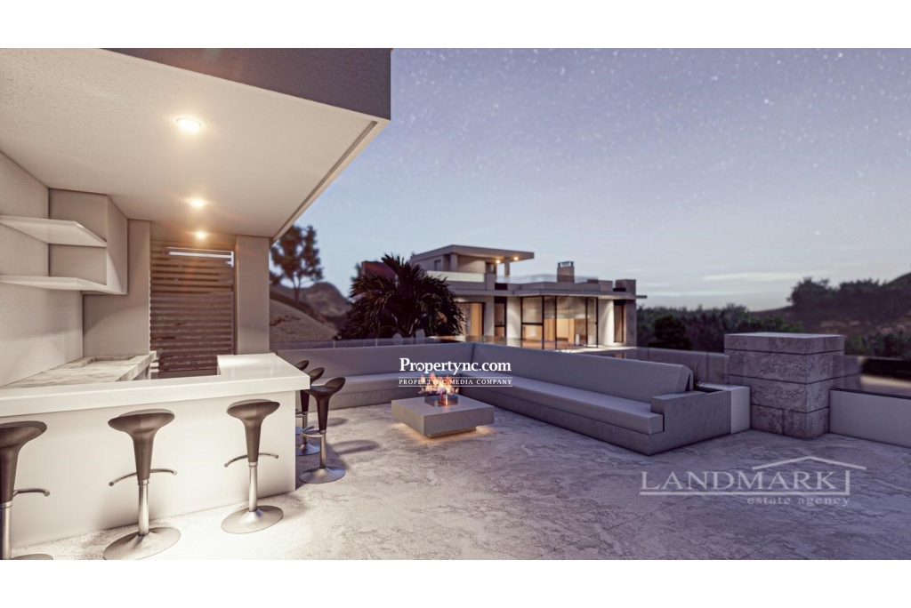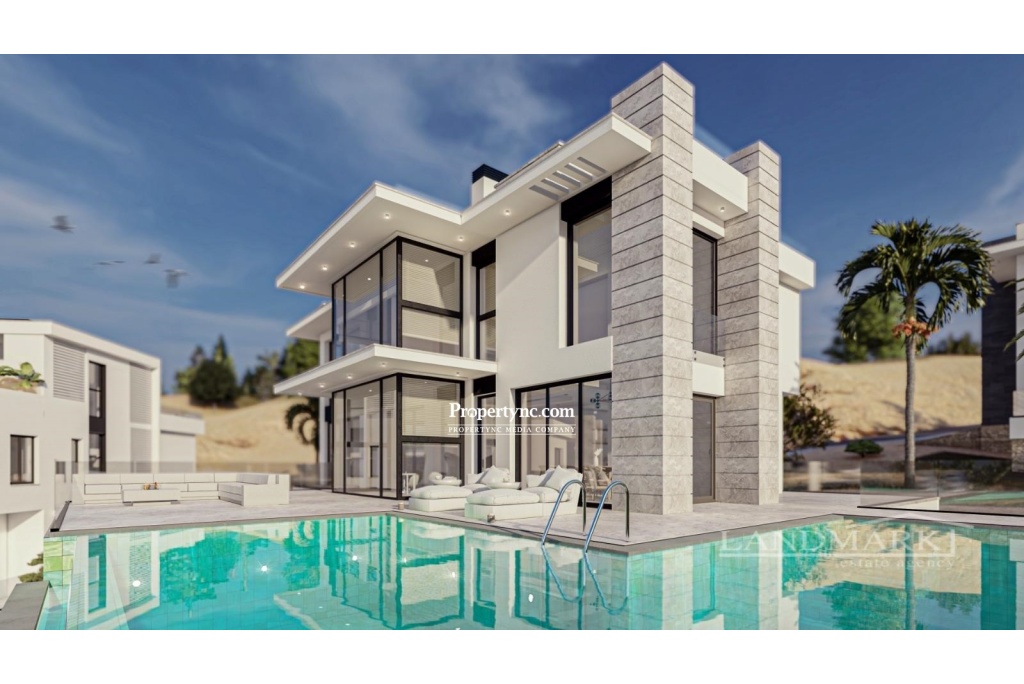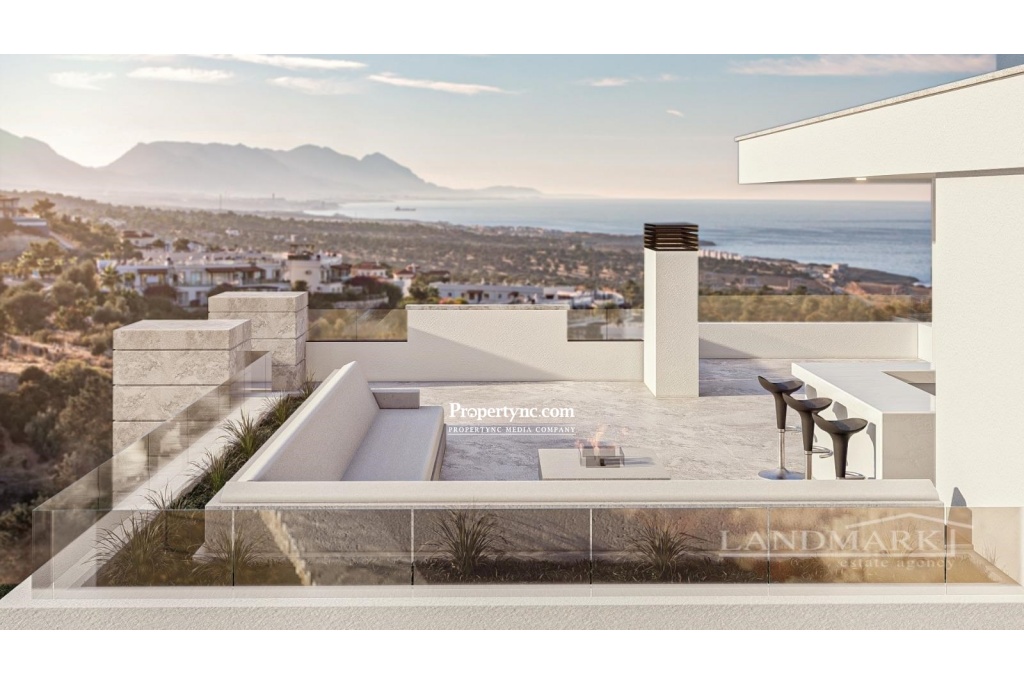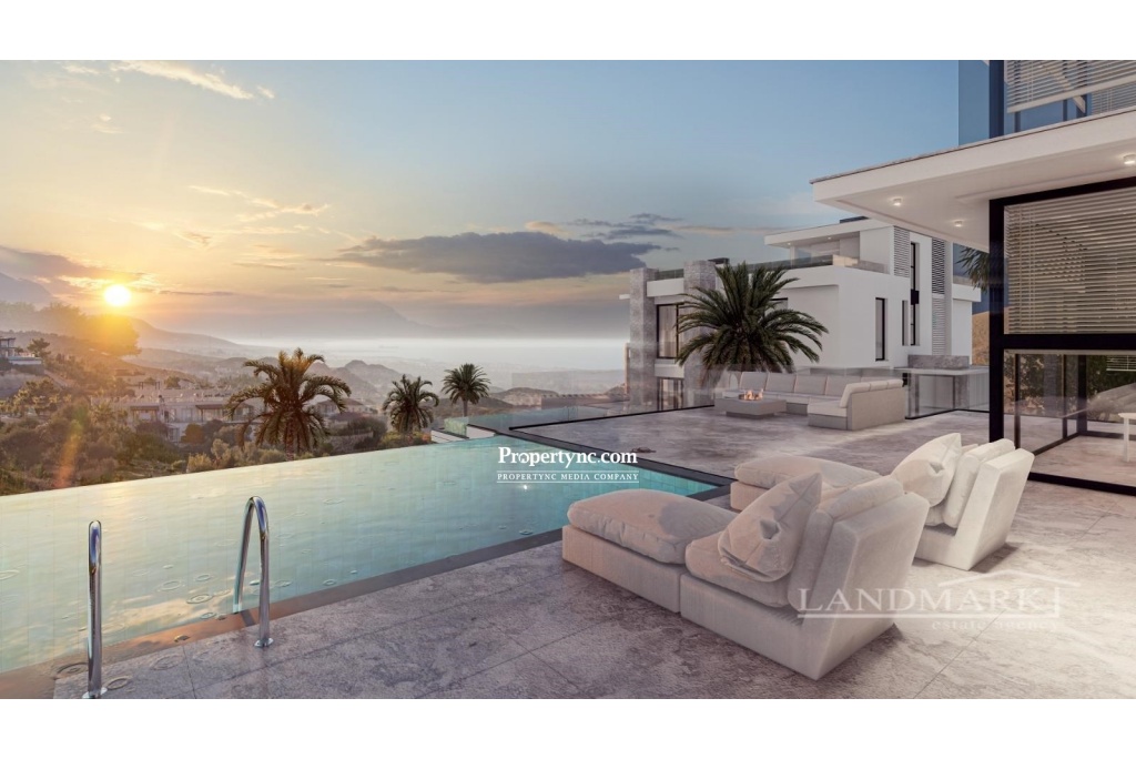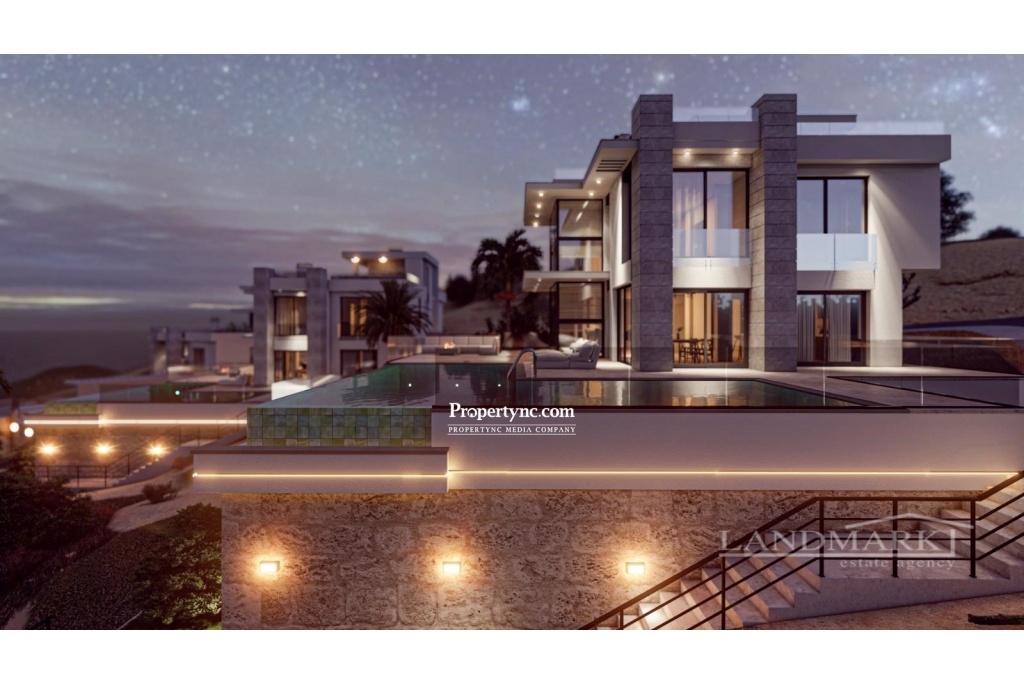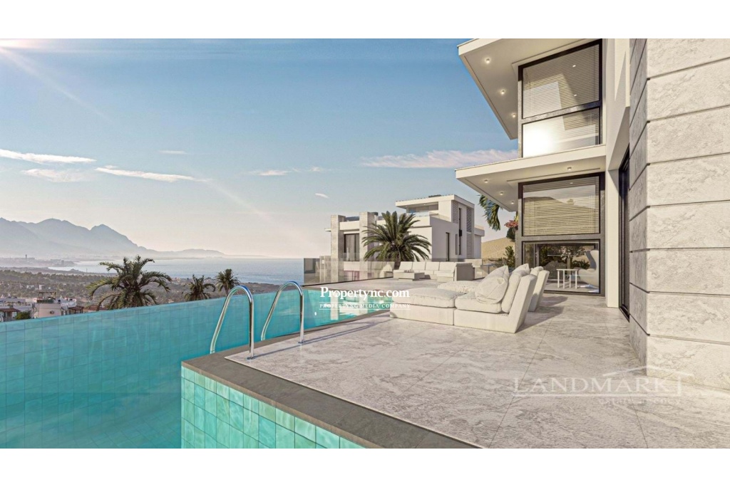 This outstanding project will have only four luxury villas and they are going to be built situated in a picturesque and tranquil village in Esentepe. All villas will have stunning sea views and coastal views of Girne Kyrenia. Each villa will have 320m2 internal size and will be built over 3 levels on a 840m2 plot size and each will have a roof terrace and garage. Built on a hillside with unobstructed views of the Mediterranean Sea views and mountain views at the same time. They will be exceptional in quality and design. 320 sqm on three levels 63.65 sqm infinity pool 109.95 sqm terrace 4 bedrooms with 3 shower rooms plus 1 bath and shower room 1 guest toilet Extra guest toilet 140 sqm roof terrace with a bar kitchen Covered area on the roof terrace 24.25 sqm garage Two integrated lounge areas 842.91 sqm plot Separate utility room on 2nd floor High quality heating cooling system On request underfloor heating extra with heat pump heat pump new generation Indoor garden The villa was built and equipped to the highest quality standard. Entrance door with wood panelling Electric garage door in the large garage with storage space The entire front of the house on the slope side is glazed. Fantastic view from all rooms Stylish hanging fireplace from the ceiling. Rotates in just the right position Natural stone marble sandblasted in the living area and on the outdoor terrace High-quality modern tiles for the pool area The kitchen has a cooking island with an integrated extractor Natural stone worktops The kitchen is fully equipped with branded appliances from Silver Line (built for Miele) Faucets by Hans Grohe, concealed Toilets are by Philip Stark Design The master bath has a free-standing bath and a large shower with a glass wall The entire living area has a built-in high-quality heating cooling system The utility room on the upper floor allows convenient washing and drying of the laundry Dimmable indirect lighting on the lower and upper floors Wi-Fi system infrastructure 10 tons of water reserve storage room 2 There is a lounge area on the terrace On the roof terrace there is a bar kitchen for grilling and enjoying with guests A lounge area on the roof terrace to chill out A room on the roof terrace offers space for cushions and other patio furniture Underfloor heating on both levels. On request. Guest toilet downstairs An additional toilet is located in the pool basement. There is also an additional storage space Hot water with heat pump boiler. - REF: 1858