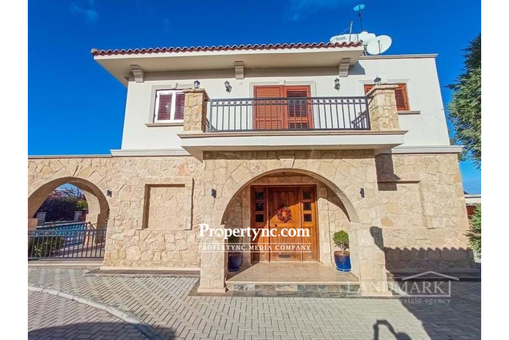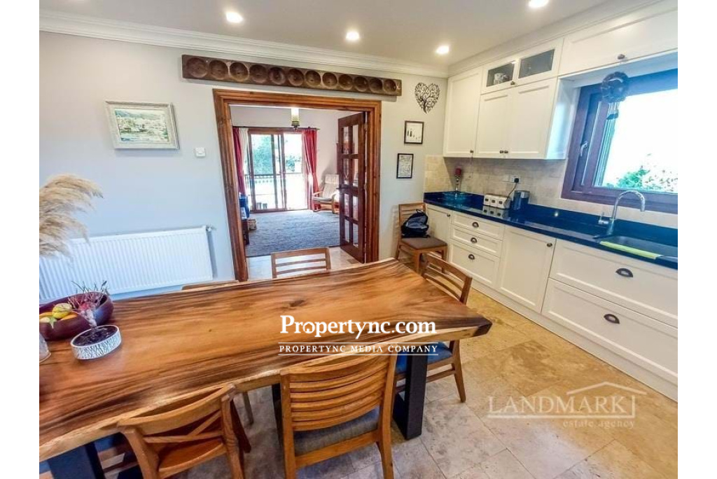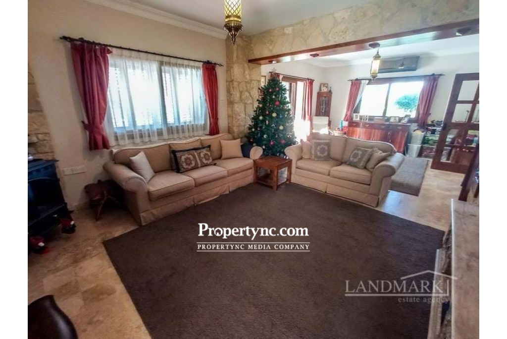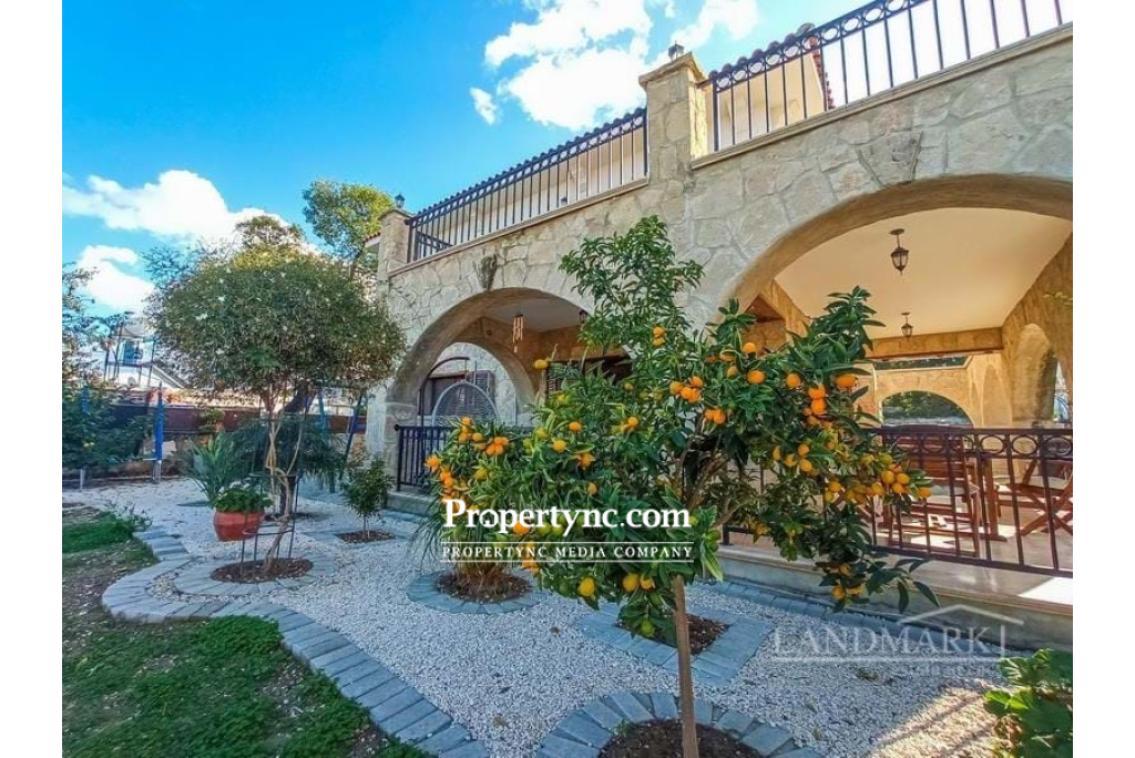 This impressive unique villa is located right in the heart of the quaint Cypriot village of Ozankoy, in Kyrenia. Its location is perfect with views of both the mountains and the Mediterranean Sea. Internally there is a spacious lounge with nature stone and wood features. A beautiful log fire which fuels the boiler and gas central heating. Patio doors are leading to the large covered terrace area with stone arches, facing into the spacious garden area with private pool making this a property for all seasons. The glass double doors lead to the spacious and beautiful, bespoke solid wood designed kitchen, with corner optimisers and granite work tops. All white goods are quality Bosch products. One bedroom is located downstairs with access to the family bathroom there are further 3 bedrooms upstairs all having air conditions, radiators and fitted wardrobes. The Master Bedroom is extremely spacious with a walk-in wardrobe and ensuite shower room, all in marble with under floor heating and heated towel rails. With access to the wrap round terrace, and its stunning sea views, overlooking the landscaped garden and pool. Further there is a family bathroom tiled entirely in travertine, with a bath, underfloor heating and a large storage cupboard. From the landing area you have access to a second balcony with views towards the mountains. The impressive marble stairway leading to the first floor has a large feature window and natural stone wall. The landing provides access to a sizeable loft. The whole house is insulated. The spacious garden is beautiful landscaped with some grass and a mixture of mature fruit trees and shrubs and includes a water storage in the style of a water well and irrigation system, plus the covered pergola sitting area with BBQ. There is a large double garage with electric roller door which can also be used as a gym, man cave or office. The property is further enhanced by automatic entrance gates to the fully enclosed garden, and home alarm system. Truly a stunning family home ready to move in! 280m2 internal area 1 donum 2100 Ayak Kare Completed 2017 Pre 74 title deeds Title deed in the owners name VAT paid Title deed has the house registered on it including the pool, walls and garage Roman swimming pool 10m x 5m overflow Non-slip around the pool areas Marble surround grating for the swimming pool 4 bedrooms 1 ground floor, 3 first floor 2 bathrooms 1 with bath and 1 with shower, 1 en-suite under floor heating and heated towel rails 1 W C to the ground floor with shower Master with walk in wardrobe and two others with floor to ceiling wardrobes Fully fitted bespoke solid wood kitchen Bosch appliances Utility room Fully insulted house Gas central heating Open fire place (log burner) which also does the heating and water without using the gas Air conditioning x 6, plus one in the garage Under floor heating in the both bathrooms upstairs and dressing room and corridor from dressing room to bathroom Travertine flooring throughout the whole house, including the patio Attic with loft ladder to get into the attic with electric and fully sealed roof. 10 tonne tank under the ground and 1 tonne on roof and 2 tonne downstairs Water filter system to clean the water before it comes into the house Garage with automatic door Stone wall surround with automatic electric gate and side gate with camera system so you can see the person at the gate and open it from inside the house. Mature landscaped garden - REF: 1749