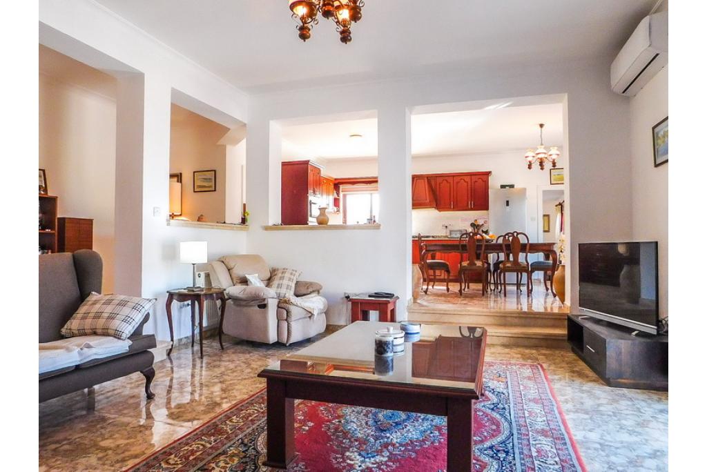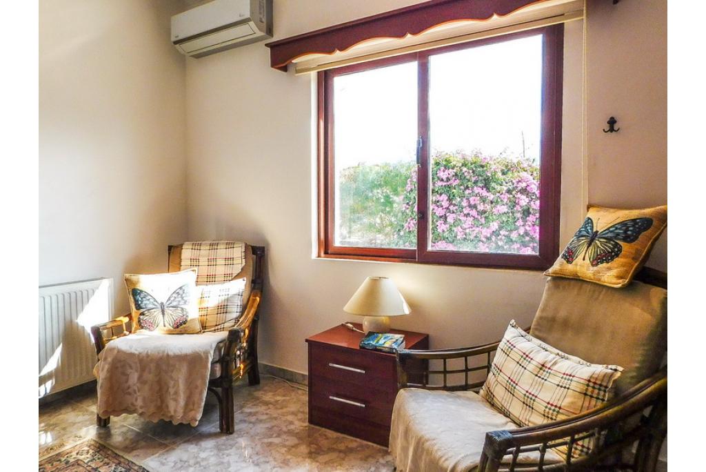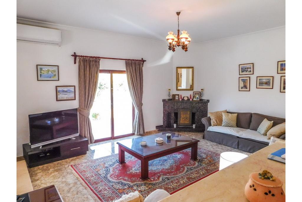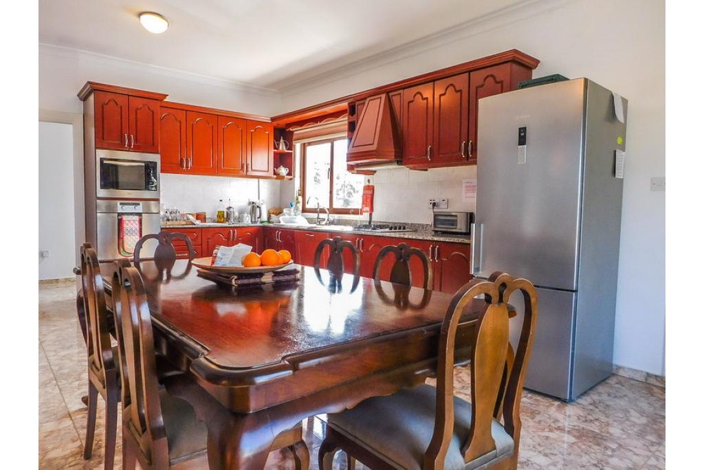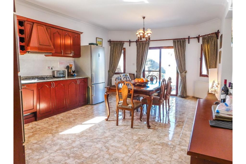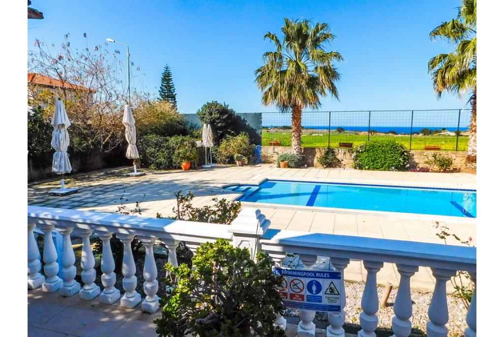 Spacious sunken lounge with open fire place and double patio doors looking over the pool area and to the sea. The kitchen/dining area is fully fitted with units and white goods which is also having patio doors out to the terrace area. Leading from the kitchen is a utility room with access to the outside.