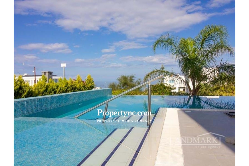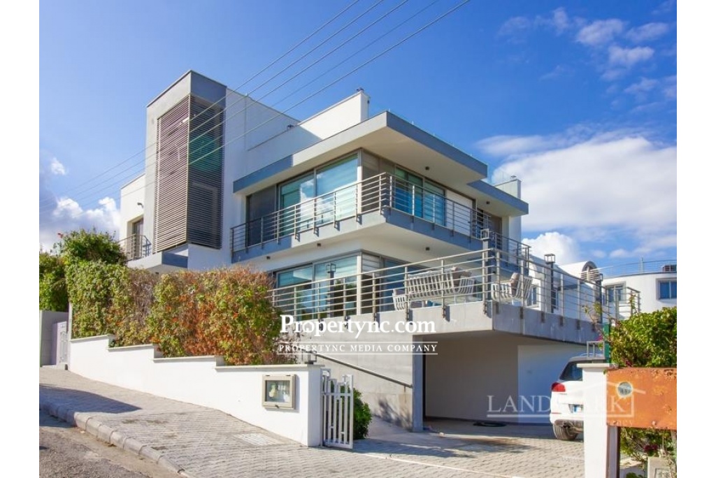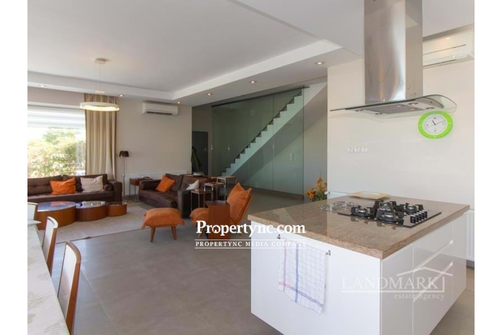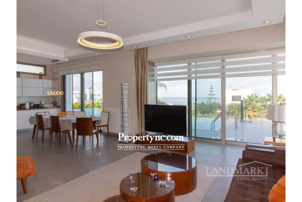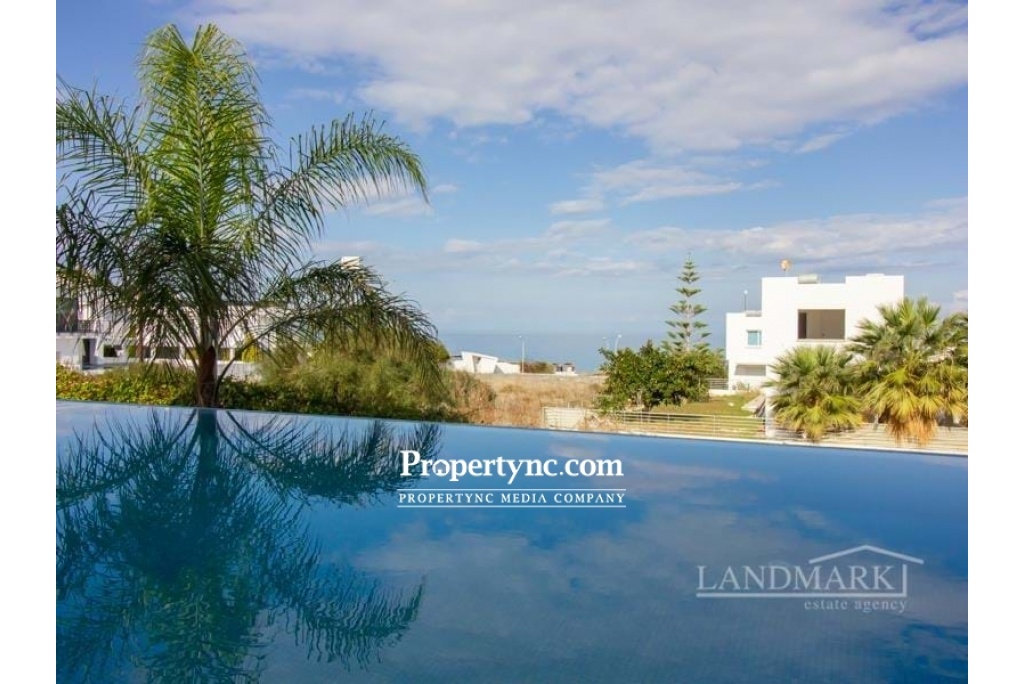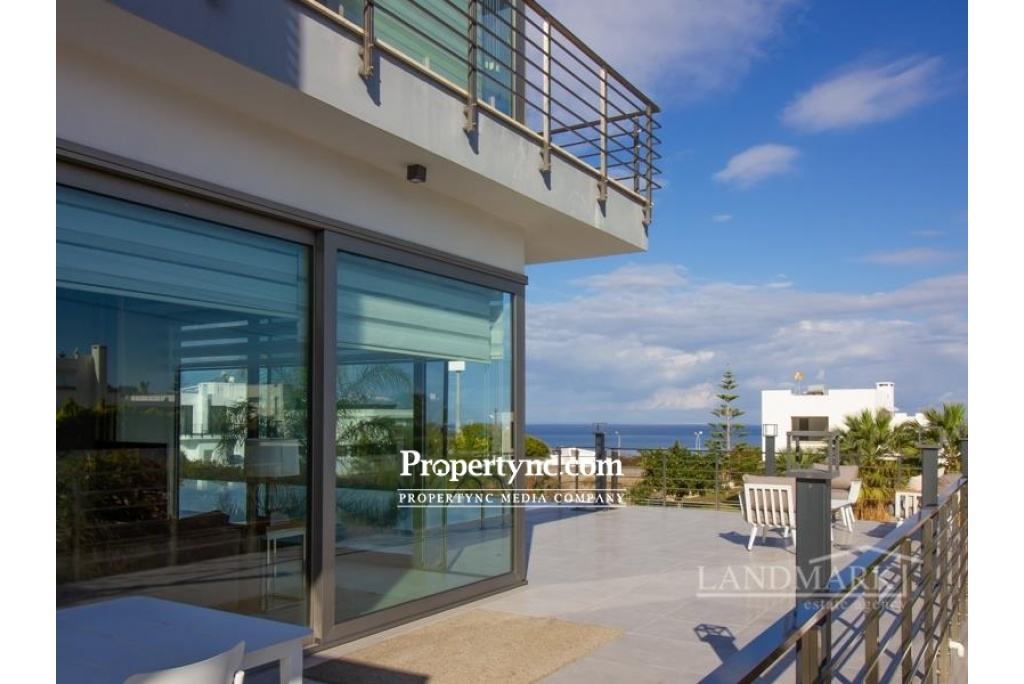 This is a rare opportunity to purchase this amazing tailor-made contemporary designed villa only 100 m away from the sea! Located in a quiet, secluded area, walking distance to a popular beach club and restaurant. The villa was designed and perfectly build by a well-known engineer for himself, with the utmost care into details, using top quality materials only! The villa has been built on 4 levels, which are all connected with an elevator (from the garage floor all the way up to the stunning roof terrace! The ground floor benefits of a spacious living room with a well-equipped open plan kitchen and dining area with a breakfast bar. Huge sliding glass windows lead to the large front terrace area, offering great views of the sea and a great L shape swimming pool & kids pool, and BBQ area. In summer, the glass doors can be fully opened, which unites the living room with the terrace into one space. Also, on the ground floor, there is a very tasteful furnished bedroom and a modern bathroom. Marble stairs with a glass balustrade are leading to the upper floors and to the basement. On the second floor, there are three spacious bedrooms, all with fitted wardrobes and well-equipped modern en suites. The master bedroom has access to a balcony with stunning sea views. It also has a sliding glass door system that slides widely to unite the bedroom and balcony into a single space. On the third floor, there is a fantastic spacious sunbathing terrace, which invites you to enjoy the mild weather most months of the year! All modern-designed bathrooms are of a good size and have stylish fittings, walk-in shower rooms with rain showers, and towel heaters. On the lowest basement floor, there is a large guest bedroom with an en suite bathroom, as well as other utility rooms (which could be an entertainment, sport, or office area or one more bedroom and access to the garage. This villa is distinguished by the exceptional quality of construction and has been tastefully furnished and decorated. The garden area has been beautifully landscaped with pebbles stones, palm trees, and fruit trees. 260 m2 internal size with 250 m2 basement and terrace 580 m2 plot size Exchange title deeds Titles deed in the owners name VAT paid Completed in 2015 Swimming pool 11m x 5 m + 3m x 3m kids pool Fully furnished 5 bedrooms all with en-suites + 2 large entertainment rooms + storage & technical room 6 bathrooms Utility room Automatically controlled Inverter Mitsubishi air conditions x 12 Modern integrated kitchen appliances Granite worktops Breakfast bar Spotlights in lounge & kitchen Buderus Gas heating system Water filter and Decalk system Anthracite gold aluminum double glazed windows Mosquito nets on most windows Marble and ceramic flooring 3 water tanks Elevator Automatic irrigation system Modern bathrooms with stylish fittings, rain showers, and towel heaters Terrace & balcony areas with glass balustrades Landscaped garden with fruit trees Closed garage with automatic shutter system Natural stone wall around partly fence - REF: 1833
