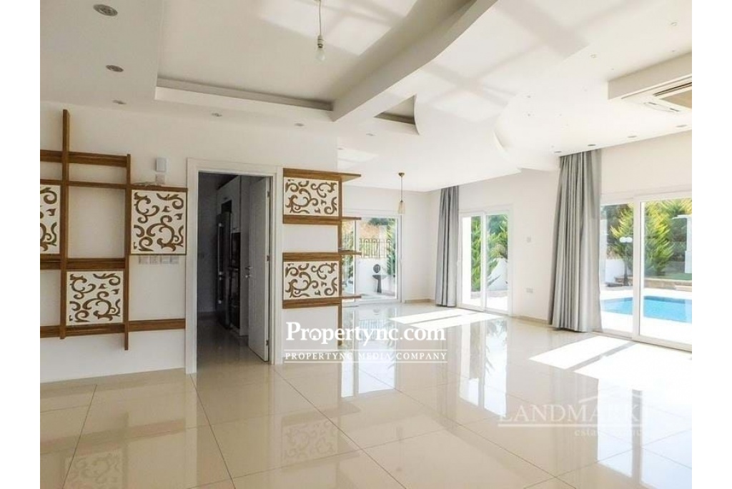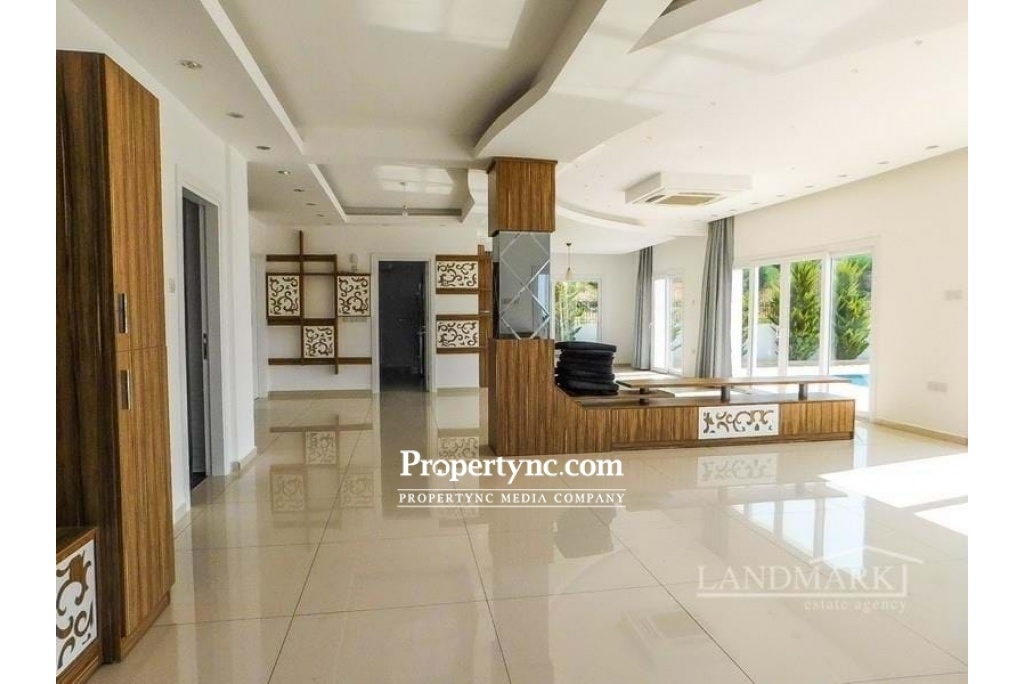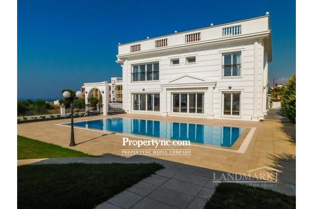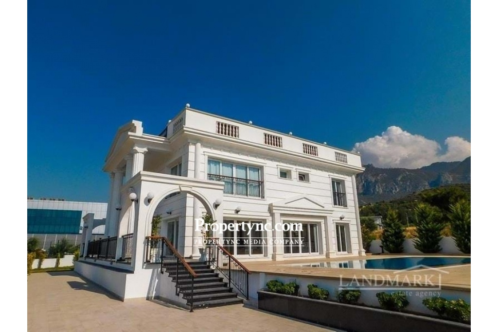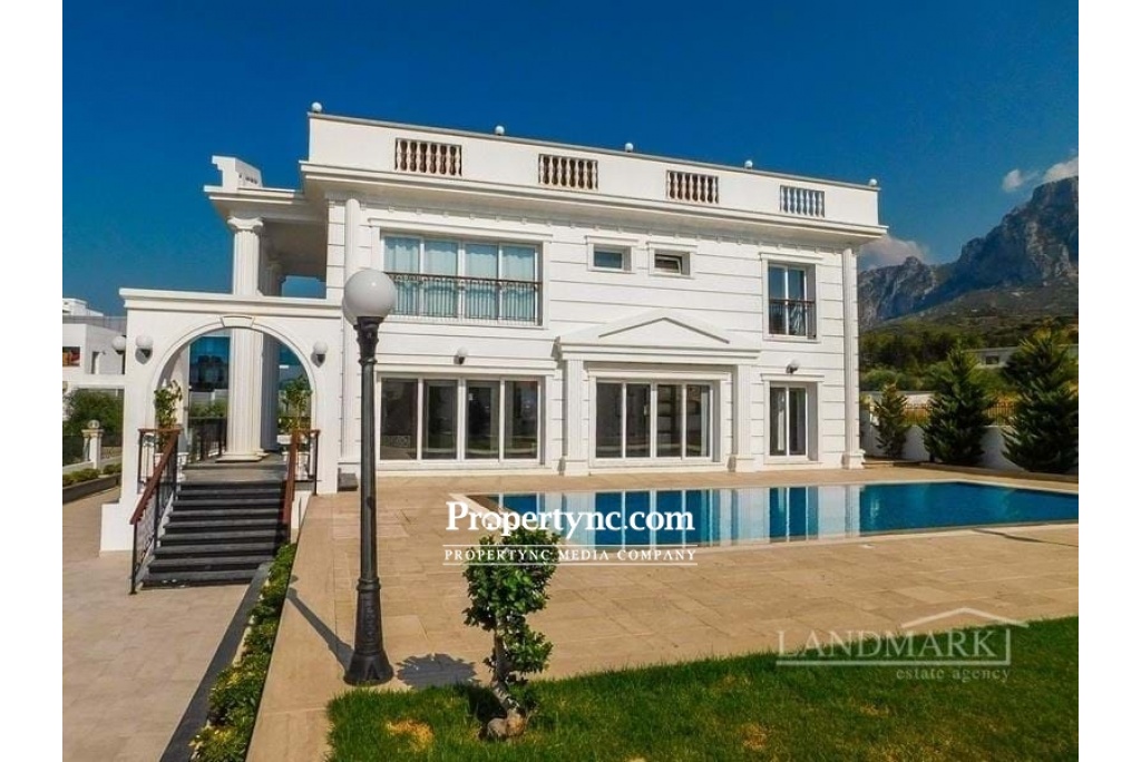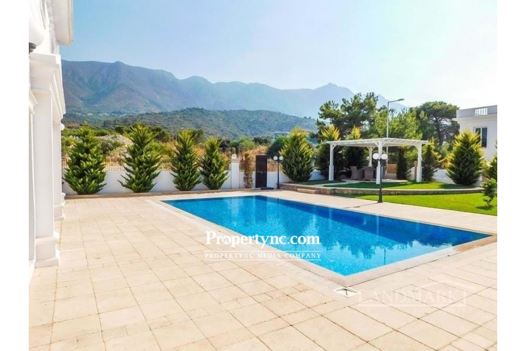 This stunning 5 bedroom villa in located at an exclusive area of Edremit, slightly elevated above the highway of Kyrenia with wonderful views to the Mediterranean Sea and mountains. Located only a few minutes away from the centre of Kyrenia it has easy access to Nicosia and to the west of Kyrenia. The surrounding area has a great choice of shops, restaurants and other amenities as well as many pristine beaches to choose from. To the ground floor is a huge lounge and diner with lots of built-in designer shelving and storing units. Kitchen is separate and has high spec white goods and granite worktops. One double bedroom is located on the ground floor and 4 others on the first floor. There are 3 en-suite bathrooms and 2 family bathrooms on both floors. The garden is beautifully landscaped and has irrigation system. There is enough space for multiple cars in the driveway. The pergola covers outdoor dining and it is positioned near the pool side. All outside decorations, garden lighting fixtures etc. are included in the sale price. House size 304m2 1 donum land plot Extensive terraces over 200m2 Title deed on owners name, VAT paid Completed in 2016 10m x 5m pool 5 large bedrooms with built in wardrobes 3 en-suite bathrooms 2 family bathrooms High end bedroom furniture and built-in shelving units will be included in the sale Fully fitted kitchen with granite worktop Ceramic and laminated flooring Air conditioning throughout White double glazed windows Parking place for multiple cars Stone wall surrounding with electric gates Irrigation system Extra 1 donum plot of land available for sale for £300,000 - REF: 1665