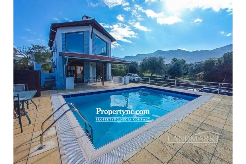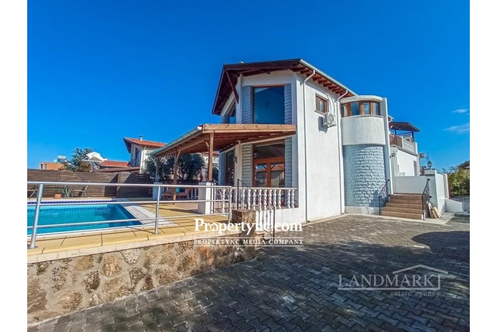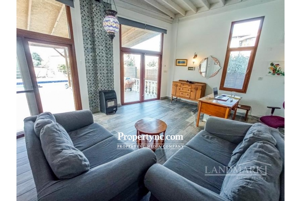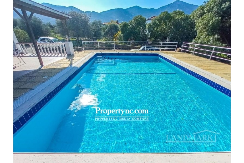 Landmark Estates are pleased to offer for sale this substantially sized 5 bedroom villa with private pool, just 5 minutes from the heart of Ozankoy village. Comprising internally of a spacious lounge dining area with an incredible feature vaulted ceiling made of white washed timber beams and black wrought iron cross beam. Downstairs bathroom, with 2 bedrooms (or they can be reconfigured into an office, gym or separate dining room), 3 further bedrooms upstairs with a second bathroom. Beautifully designed 'bespoke' wood kitchen with pewter handles. White goods include: Dishwasher, Fridge Freezer, Microwave, Oven, Hob and Extractor Fan. Feature spiral staircase enclosed to make an amazing glass walkway to the upper floor, inset with local handmade Cypriot tiles, and black wrought iron handrail. Air condition units throughout, ceramic tiled floors, vaulted Cypriot Ceilings. Outside Benefits from a terraced BBQ area leading from the kitchen, 8m x 5m private swimming pool, outside shower, large surround terrace area, low maintenance garden with a variety of fruit trees and mature established shrubs. On the first floor is a large terrace with lovely views of the surrounding mountains. 5 minutes from the heart of Cypriot village of Ozankoy, 10 minutes from Kyrenia centre with its variety of bars and restaurants, 10 minutes from local beaches and beach clubs, 40 minutes from Ercan airport and 90 minutes from Larnaca airport. Internal area 280m2 Plot size 780m2 Exchange title deed Fully furnished Completed 2008 8m x 5m swimming pool with outside shower 5 bedrooms, 2 on the ground floor 2 bathrooms, 1 on the ground floor Bespoke fitted kitchen White goods Air conditioners x 6 Ceramic flooring Garden with a variety of fruit trees and mature established shrubs Boundary wall BBQ Mountain & Sea views - REF: GR1757