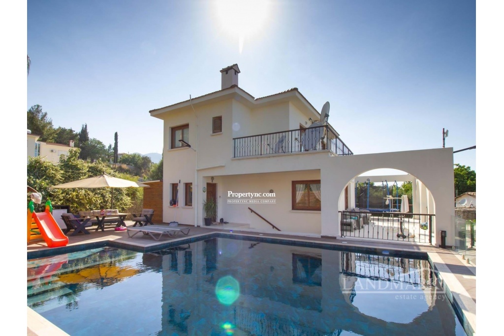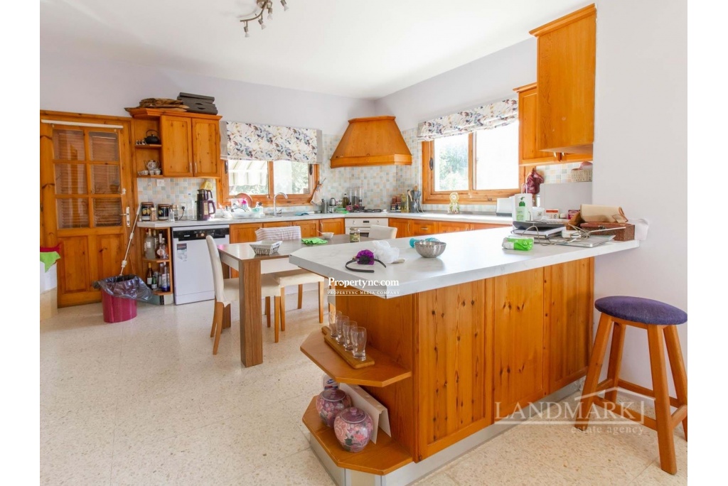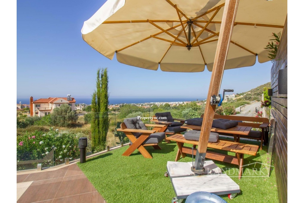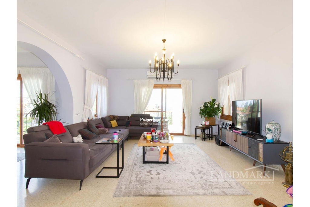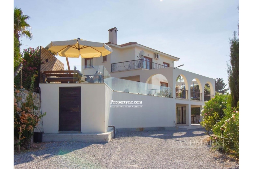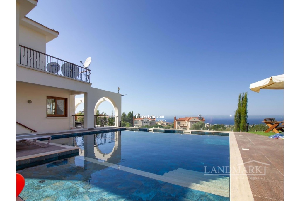 This lovely villa is situated in a picturesque area on the mountain side. The area is quiet with mostly villas in the neighbourhood. The villa has unobstructed sea views and a lot of green areas around the property. It is only 2 minutes drive from all the necessary amenities. The villa has 3 main bedrooms and there are 2 separate apartments for guests in the basement level. The guest apartments are furnished and have fitted wardrobes, bathrooms, and a terrace overlooking the garden. There is a lovely swimming pool with a childrens pool, sunbathing area with glass balustrade, and a nicely arranged sitting area all with an amazing view of the Mediterranean Sea. Internally, the house has a spacious lounge with a Both the lounge and the dining area have access to the large terrace with a sea view. The fitted kitchen units and the bar are made of natural wood. The kitchen has an access to the back terrace overlooking the garden area. There are 3 bedrooms on the first floor all with fitted wardrobes. The master bedroom is en-suite and has an access to the terrace with a wonderful sea view. The second bedroom has a fitted wardrobe and has an access to the balcony. The third bedroom has a fitted large floor-to-ceiling wooden wardrobe. The family bathroom is situated nearby the bedrooms. It is a lovely house for a big family to enjoy the friendly Mediterranean! 380m2 internal area 1444m2 plot size Exchange title deed Completed approx. 2005 Title deed in the owners name VAT paid 7.5m x 7.5m swimming pool 5 bedrooms in total 3 in the main villa and 2 bedrooms as quest houses 2 terraces & balcony 2 bedrooms as separate guests apartments with en-suites Master with en-suite 1 bathroom to the ground floor Fully fitted wooden kitchen Kitchen appliances Gas central heating Open fire place Air conditioning x 6 4 tonnes of water storage Generator Stone wall surround Mature established garden - REF: 1890
