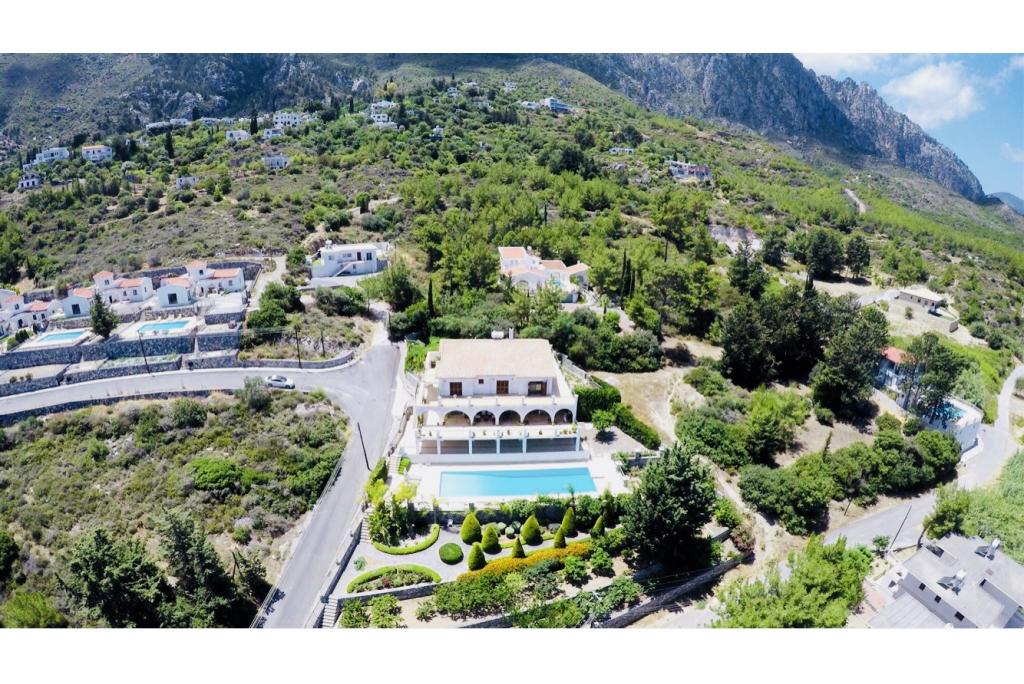 Meta Description : Within 2350 m2 Land 650 m² Indoor Usage Area Game room Living room Large Kitchen Pantry and Dining Area Study room Indoor Parking Area for 12 Cars Auxiliary House Storage Areas Private Changing Room and Bathroom for the Pool 18x8 Swimming Pool Large Terraces Unobstructed Mountain, Sea and St Hillerion Castle View Suitable for Tourism Purposes, Both as a Residence and Boutique Hotel REF KRM123