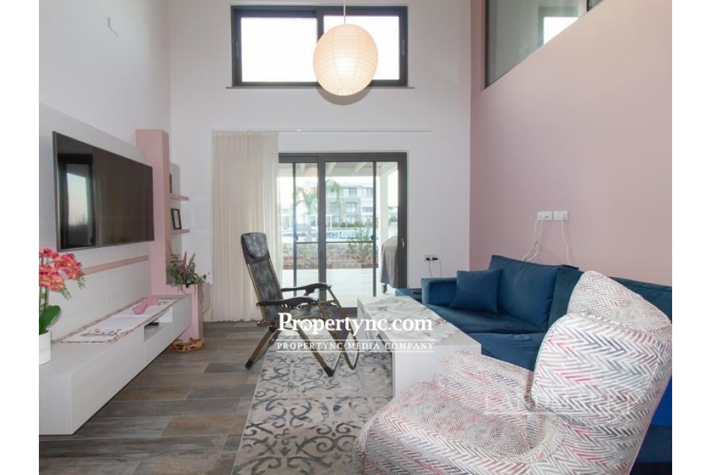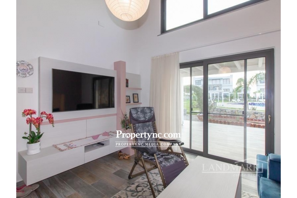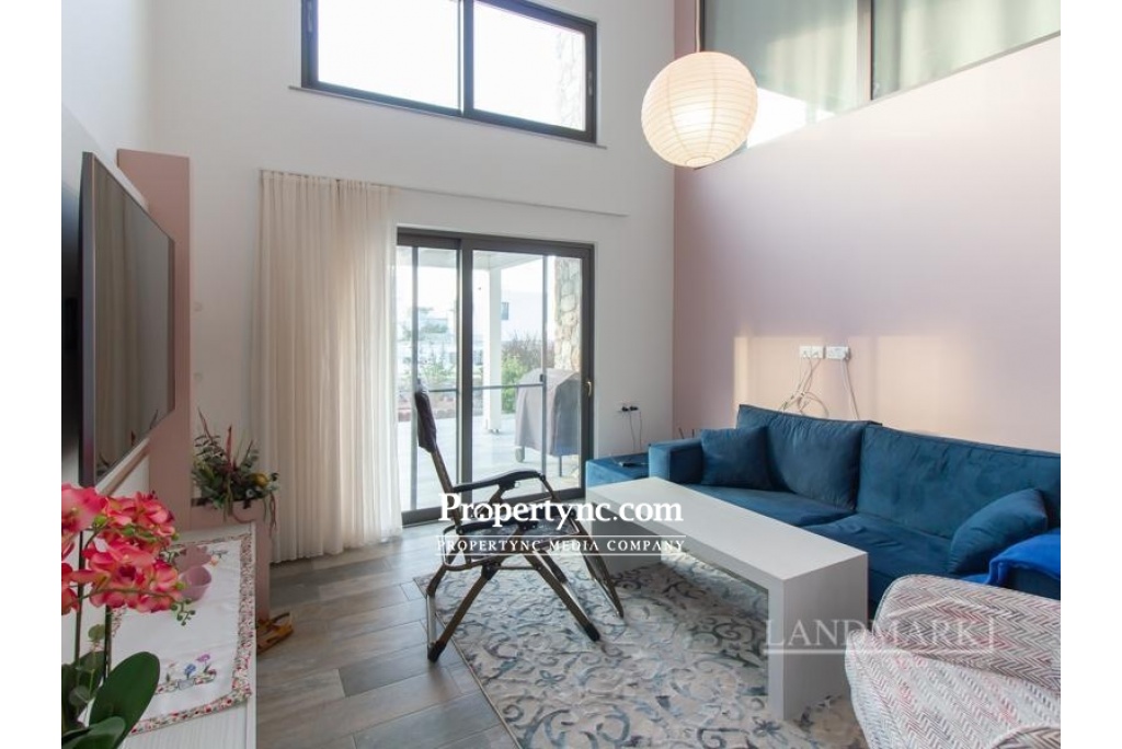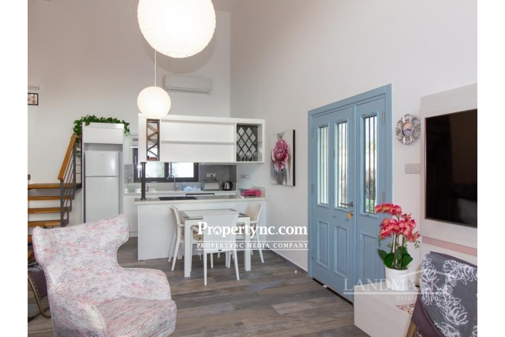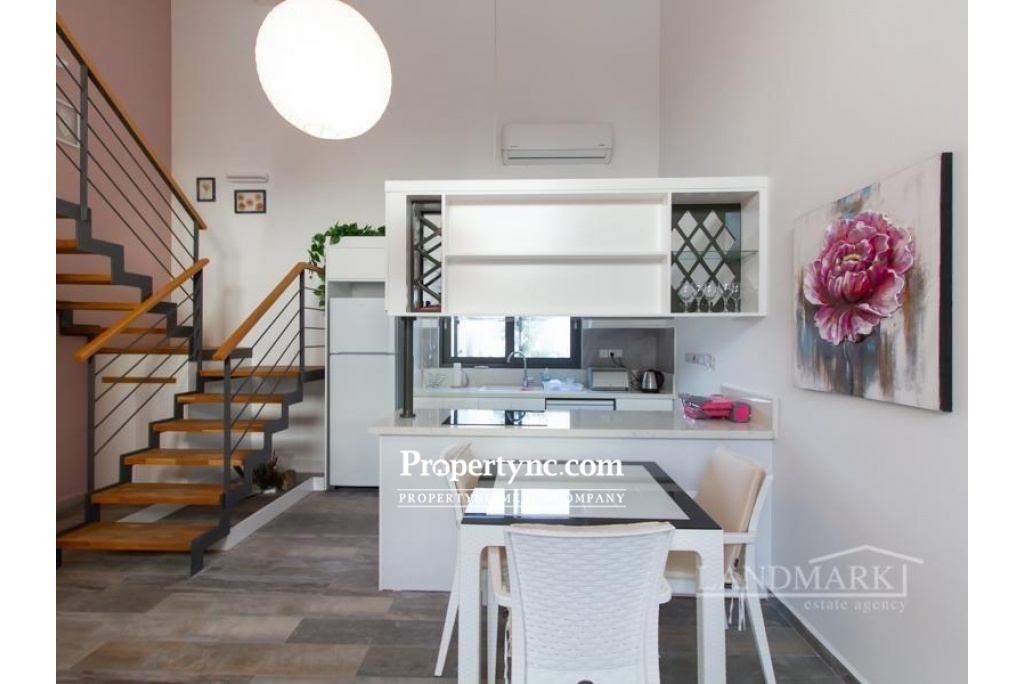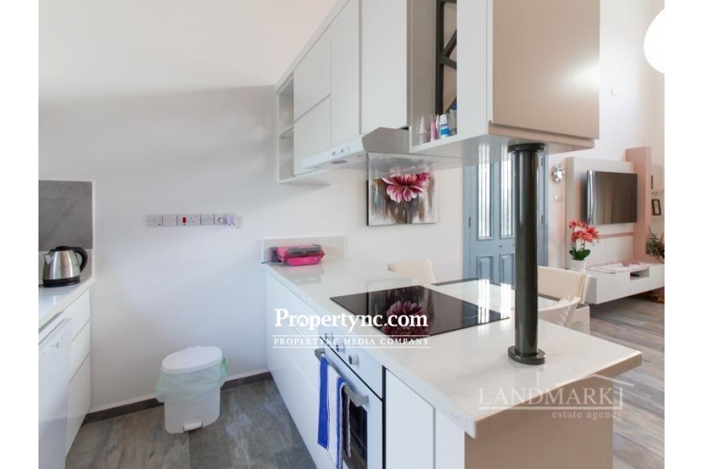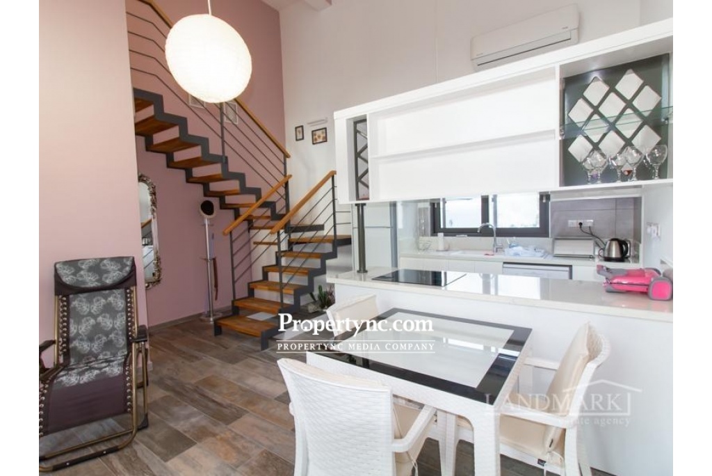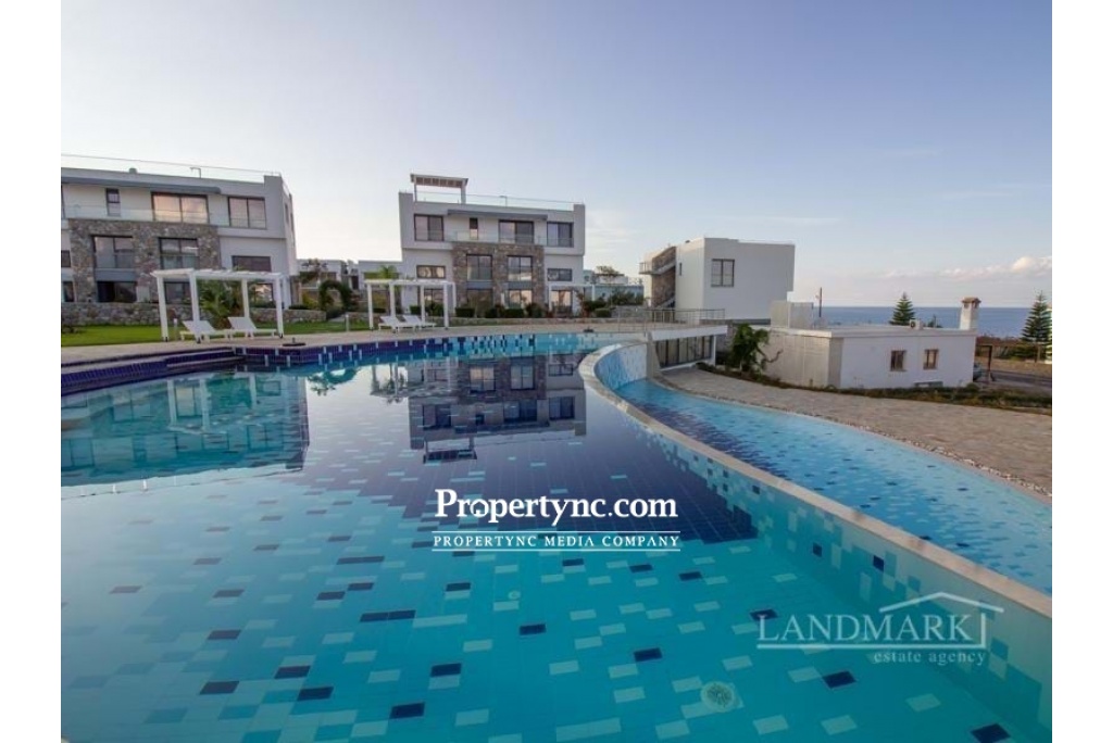 Internally the property has a large open plan living area which also includes a beautiful modern white fitted kitchen with built in dishwasher, oven, hob, extractor fan, and fridge freezer. One bedroom is on the ground floor, together with the downstairs shower room which also incorporates the washing machine. The spacious master bedroom is located upstairs with its own beautiful ensuite shower room with feature stone wall. Fitted wardrobes are in both bedrooms, plus air condition units throughout to keep this lovely apartment cool in summer and warm and toasty warm in winter. Outside a Large Terrace is the perfect place to enjoy the Mediterranean sun rises and sunsets, with some well-deserved al fresco outdoor living. With a beautiful Shared Swimming Pool, Amazing Front Line Sea Views, and Distant Mountain Views, this really is the perfect property for living the dream in North Cyprus. Located in Kucuk Erenkoy close to many natural beaches, and cosmopolitan new developments with their wide range of spas and restaurants, this is a great location for a relaxing holiday vacation or permanent home. Only 15 minutes from Esentepe village with its Local quality Cypriot restaurants, and bars. 30 minutes to the International Korineum Golf Course. 45 Minutes to Kyrenia City Centre with its Antique Harbour, Historic Castle, and World Famous Bellapais Abbey. 90 m2 internal area 10 m2 including terraces Exchange title deed Completed 2019 Shared pool 1 large terrace with sea and mountain views 1 bedroom on the ground floor and 1 on the first floor 1 en suite in the master 1 family bathroom on the ground floor Bedrooms have built in wardrobes Fully fitted kitchen Kitchen appliances Air conditioning throughout Beautiful internal stone wall feature Landscaped communal gardens with feature stone Communal gym - REF: GR 1837