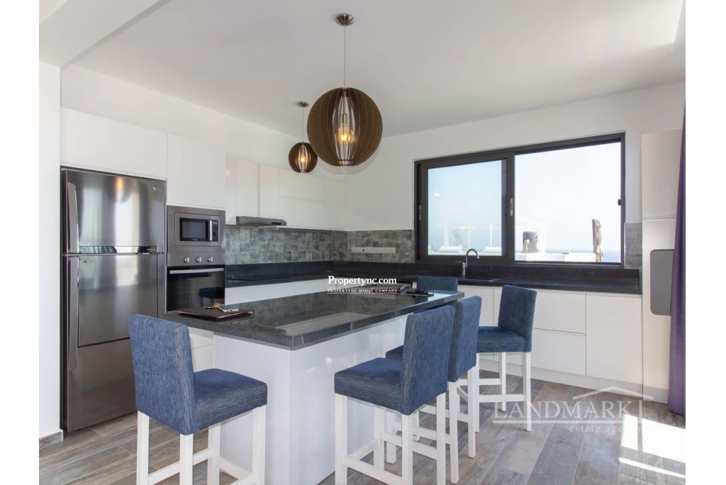 This 3 bedroom penthouse has it all - front line sea views, mountain views, 3 bedrooms, 3 bathrooms 2 en-suite and 1 family bathroom, beautiful fitted kitchen with upgrade addition of a central island, invertor air condition, ceiling fans, contemporary grey double glazed windows and doors with fly screens, white American pressed doors, solar panels (providing hot water), surround balcony, amazing 105 m2 roof terrace with outside kitchen area, outside shower, and incredible panoramic sea views, this award winning site also has beautiful landscaped tropical gardens, communal pool and a gym - what more could you ask for ? All of which makes this property a stunning home, or excellent investment property as its market value will continue to grow. Property Details:- Built in 2019 by Evergreen Development, Individual Exchange Title Deeds - VAT to be paid Please note that there is a monthly service charge of 139 GBP 125 m2 internal area 105 m2 roof terrace with a shower fantastic front line sea and mountain views Exchange title deed Completed 2019 VAT to be paid Shared pool and communal gym 3 double bedrooms 2 en suite shower rooms 1 family shower room Bedrooms have built in wardrobes Fully fitted upgraded kitchen with central island Kitchen appliances Air conditioning throughout Beautiful stone wall features inside and roof terrace Landscaped communal gardens with feature stone - REF: GR1874