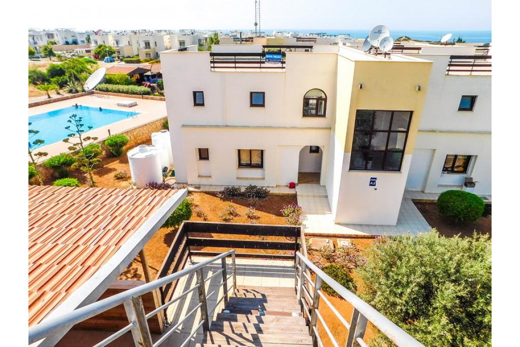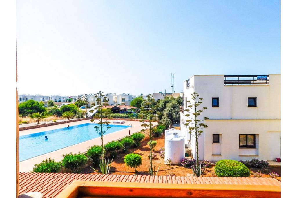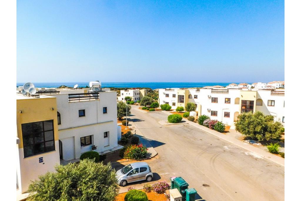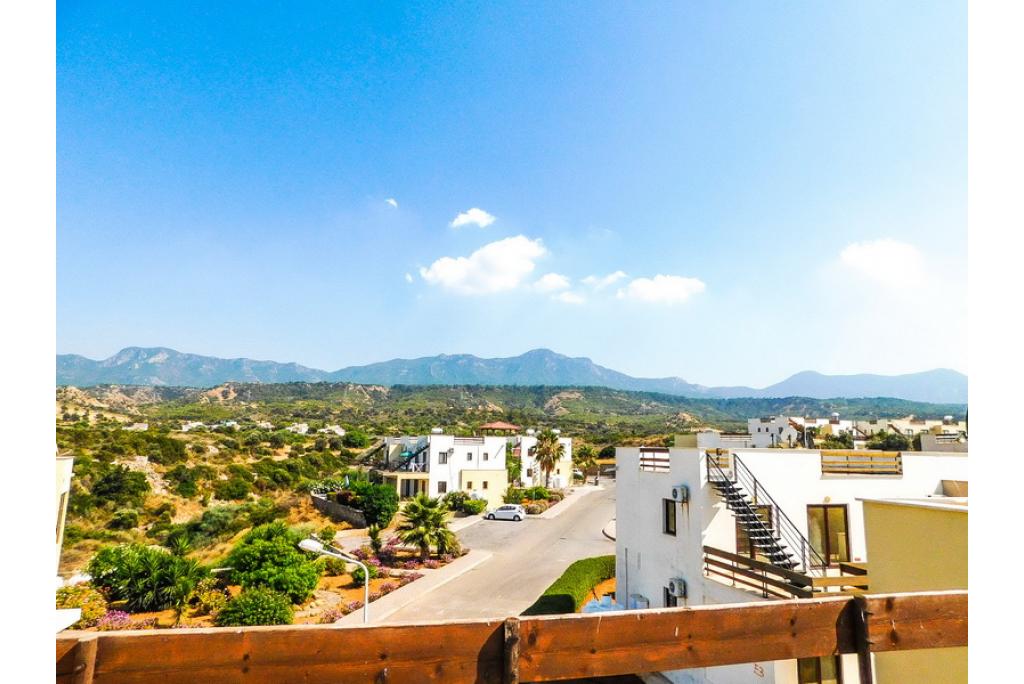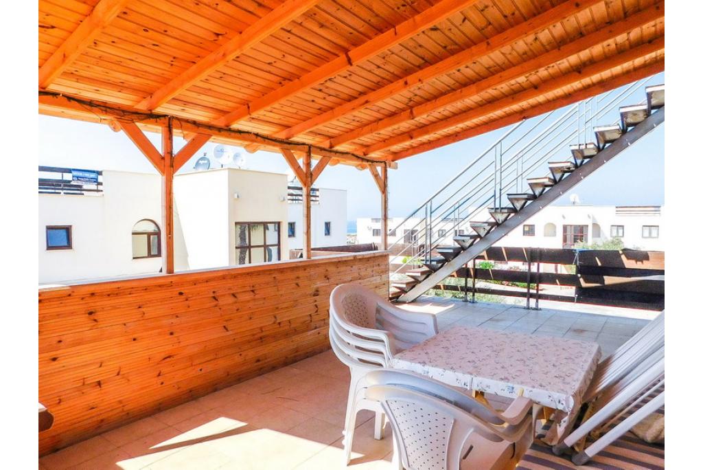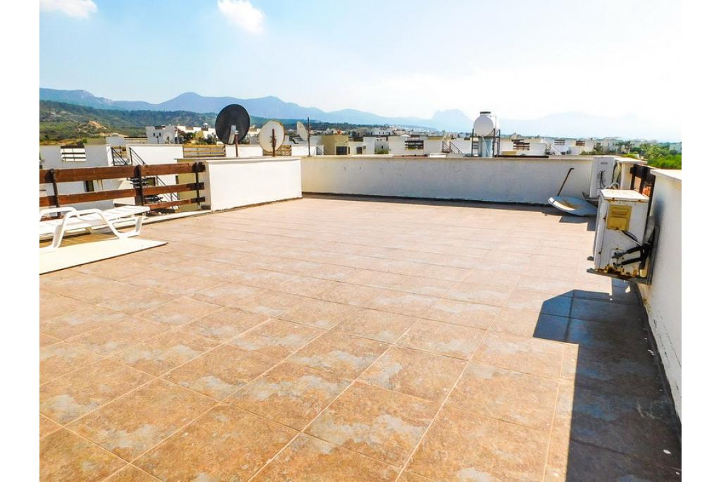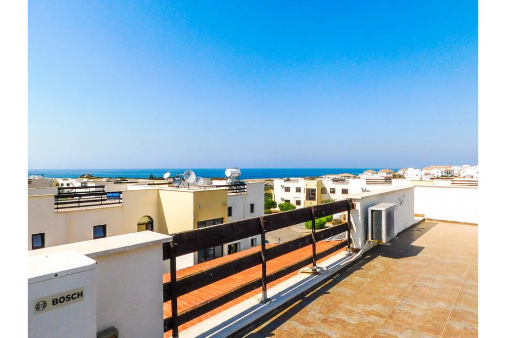 This beautiful penthouse apartment with the master bedroom having an en-suite bathroom is positioned on a spacious established sea front estate, consisting of 125 apartments. The lounge and kitchen area is open plan and there are patio doors towards the spacious covered terrace with built-in wooden bar and a staircase to 75m2 roof terrace with amazing sea and mountain views. There are 4 very large communal swimming pools (approximately 20m long) which are never crowded, perfect for lazing on an air bed or counting the laps. Each pool has a shallow section for children and the deep ends are 1.8m. The complex is owner managed by a committee of volunteer owners and all maintenance payments are allocated to the maintenance, upkeep and improvement of the site. This estate is a great location to rent or buy an apartment, for anyone to enjoy a relaxing holiday. It’s a spacious and well-laid out site with planted and gravelled areas, pathways and plenty of outdoor space for sunbathing. • 75m2 internal size • 170m2 with terraces • Exchange title deed • Completed 2007 • 4 communal swimming pools! • 2 bedrooms • Master with en-suite • Fully fitted kitchen with white goods • Air conditioners x 3 • Central heating infrastructure • 5 tons of water storage • Spacious balcony and roof terrace with perfect sea views • Maintenance fee £59 per month • Excellent investment in very demanded area