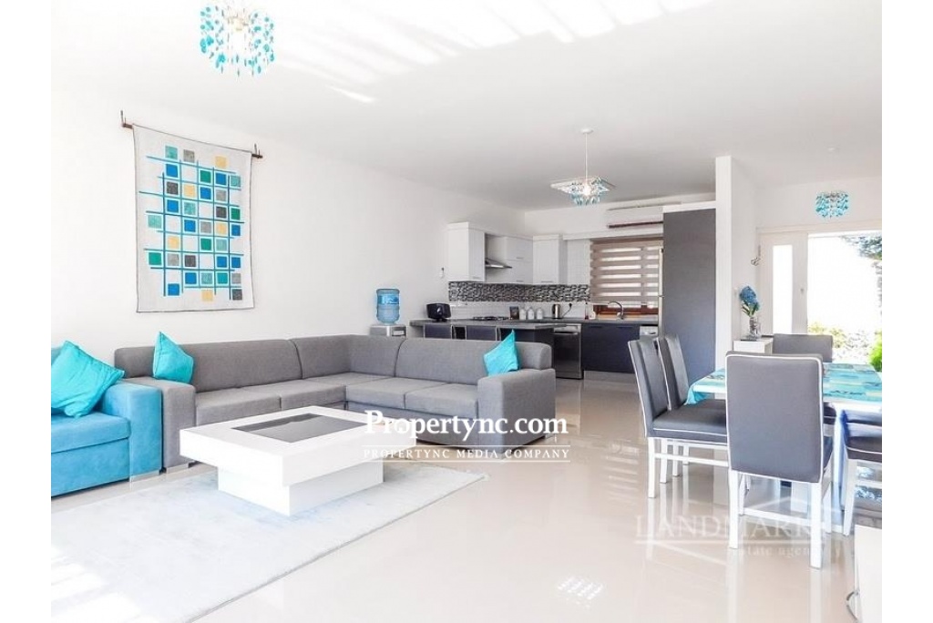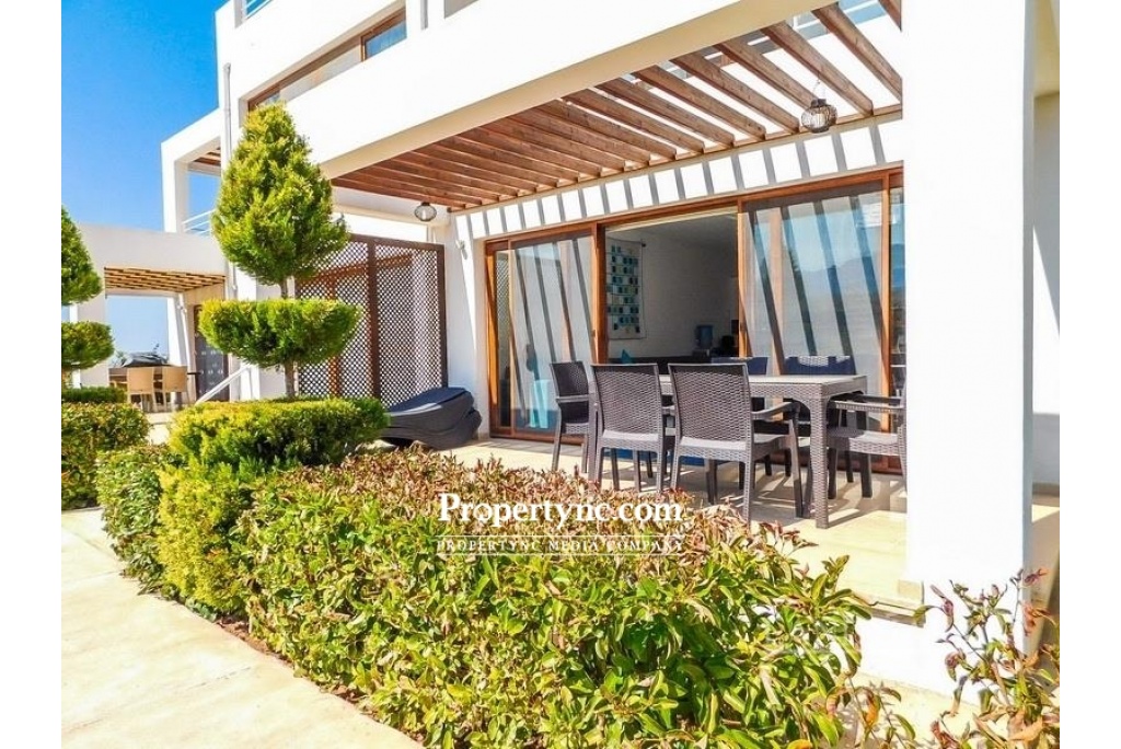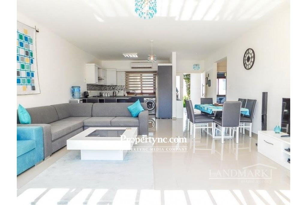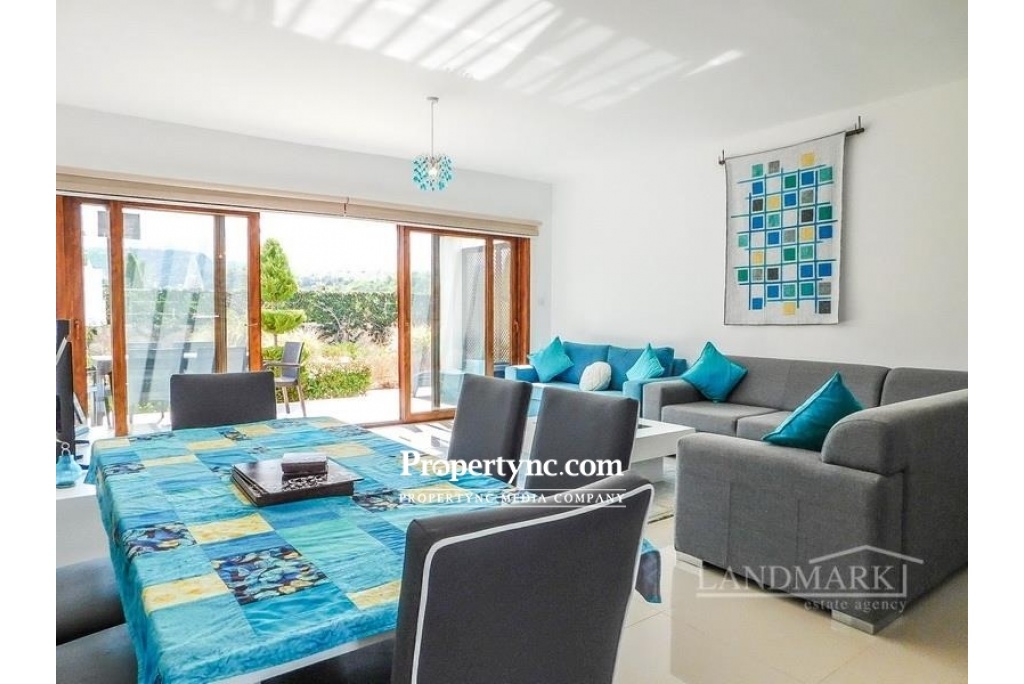 This apartment is a part of a beautiful luxury estate consisting of 4 apartments in each block all sharing a communal pool. This lovely garden apartment is a fantastic opportunity to purchase a holiday home for luxury living at an affordable price. The apartment has a spacious open-plan kitchen and lounge and offers easy access to the terrace and one of the on-site swimming pools just a few meters away. The kitchen is fully fitted including all Hotpoint appliances. There are 2 double bedrooms one with en suite bathroom and one with a sea view. This apartment has high quality furniture included in the price. Air conditioning units are throughout and wardrobes are fitted in both bedrooms. The site benefits from two overflow communal pools, beautiful landscaped gardens, a gym, spa, restaurant, children playground and tennis court and has a property management office. It is a place to relax, a place to enjoy peace, quiet and relaxation. The site is about 20 minutes drive from Kyrenia and situated around the corner from Korineum Golf course. 105m² internal size 15m2 terrace Communal swimming pools Exchanged title deeds Title deed ready to transfer, 5% VAT payable Fully furnished (except personal items) 2 bedrooms with built-in wardrobes Master with en-suite shower Family bathroom with shower Modern fitted kitchen units with white goods Air conditioning x 3 Parking space in front of the block Beautiful large communal garden with a mix of plants and trees Fully equipped site (gym, sauna, restaurant, children play area) Property management office on site Shuttle service to nearby beach Maintenance approx £125 - REF: 208p