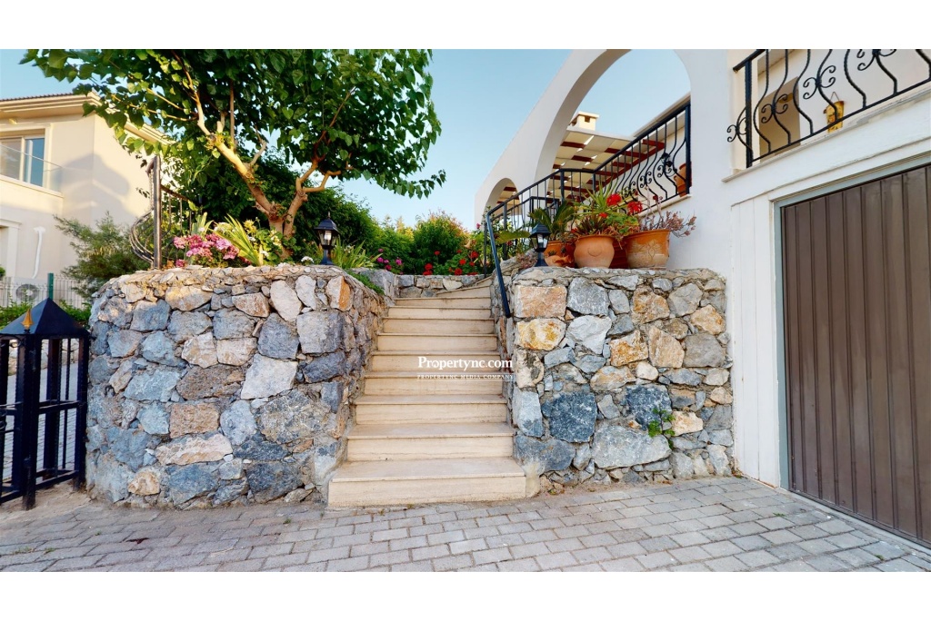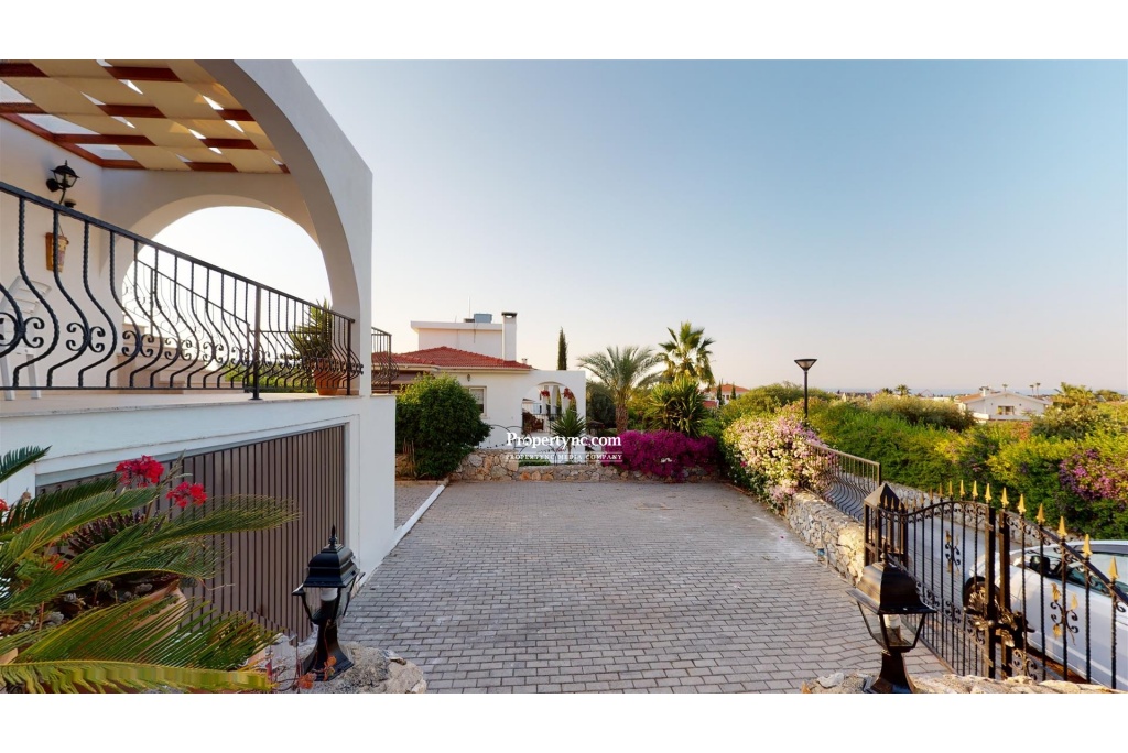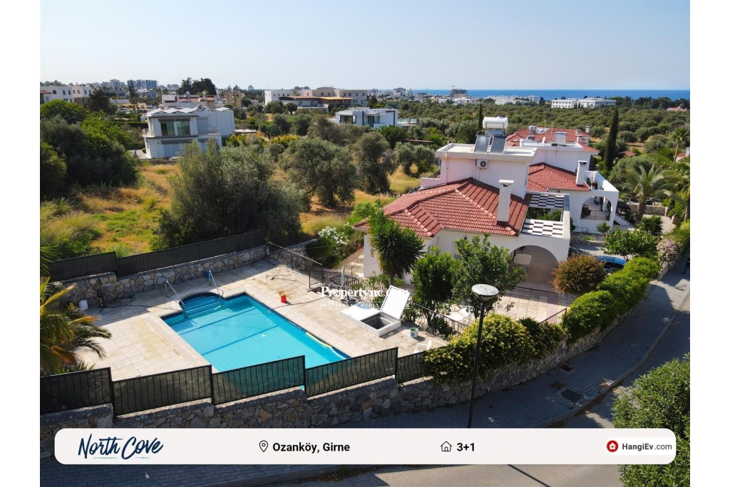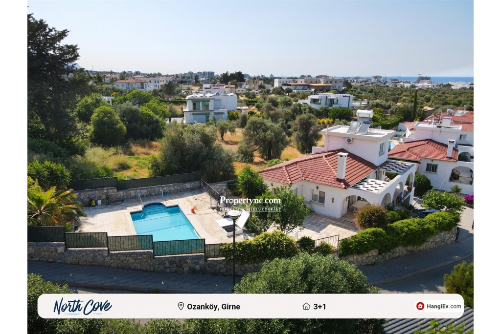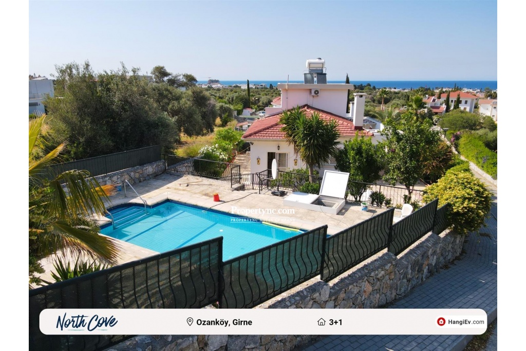 North Cove are pleased to introduce to the market a wonderful 3 bedroom bungalow set on over a donum of land with beautiful mature gardens. Upon entering the bungalow, you are greeted with high ceilings and a large open living space, with the kitchen, living room and dining room set in a manner which offers contemporary living with an abundance of natural light creating a light and airy entertaining area. The master bedroom is very large, with built in wardrobes and large patio doors, offering access directly to the terrace, which has beautiful sea views and, again, allows for lots of natural light to pass through. The second bedroom again offers a large bedroom, with built in wardrobes and plenty of space to utilise. The family bathroom compromises of a small shower which could easily be changed out for a bathtub or a larger shower. Up the stairs, to the outside of the property is the third bedroom, which could also be used as guest quarters. With an en-suite double bedroom with built in wardrobes and a fridge, this bedroom offers truly magnificent views of the sea and mountains. The sizeable grounds which the property sits on have been exquisitely maintained, with an array of flowers and plants creating a calming and relaxing environment, whilst helping to add to the privacy of the property. The property has an alluring private pool with views directly to the sea and of the mountains; a real gem in a prime location of Ozankoy.Close to local amenities, only a short drive to Girne centre and a stones throw from ESK, the property also boasts central heating, a small tool shed, a garage, a driveway with space for 3 cars and gated security to the property, offering you peace of mind in a luxuriously tranquil setting.Live your best life!Video: https://youtu.be/ydhpAqX7oco