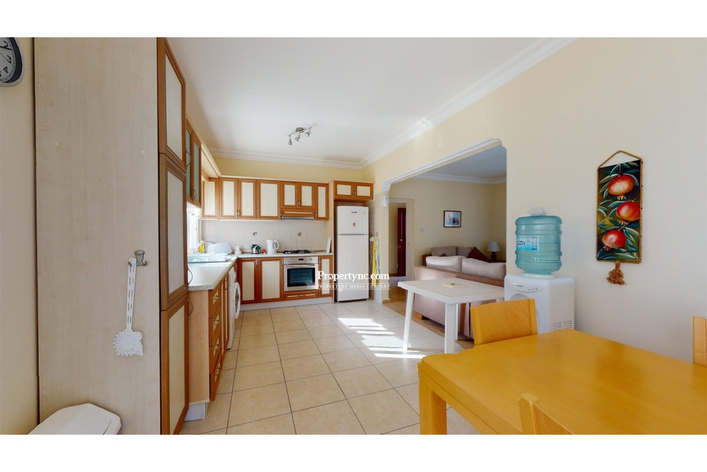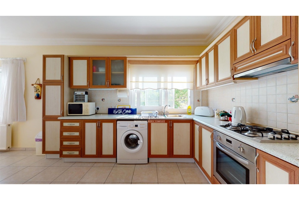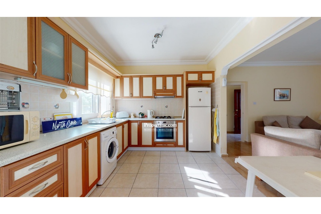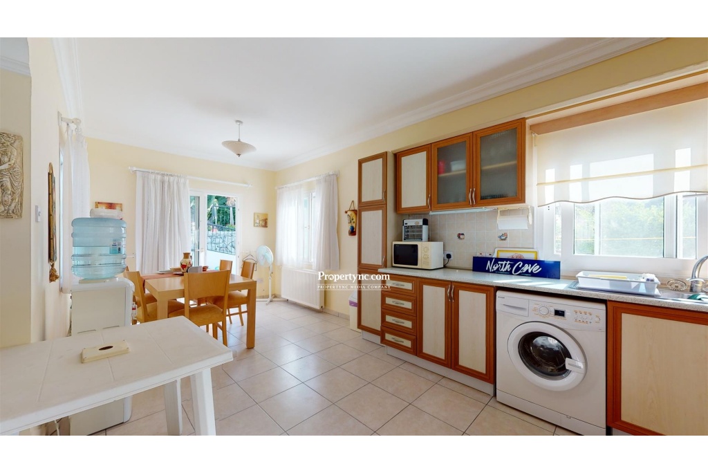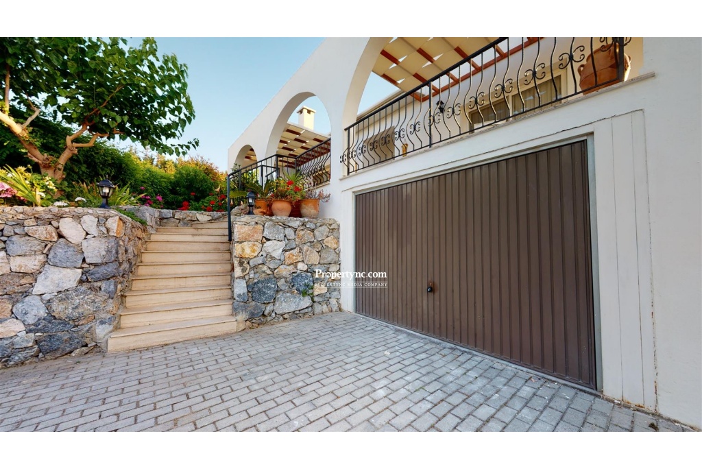North Cove are pleased to introduce to the market a wonderful 3 bedroom bungalow set on over a donum of land with beautiful mature gardens. Upon entering the bungalow, you are greeted with high ceilings and a large open living space, with the kitchen, living room and dining room set in a manner which offers contemporary living with an abundance of natural light creating a light and airy entertaining area. The master bedroom is very large, with built in wardrobes and large patio doors, offering access directly to the terrace, which has beautiful sea views and, again, allows for lots of natural light to pass through. The second bedroom again offers a large bedroom, with built in wardrobes and plenty of space to utilise. The family bathroom compromises of a small shower which could easily be changed out for a bathtub or a larger shower. Up the stairs, to the outside of the property is the third bedroom, which could also be used as guest quarters. With an en-suite double bedroom with built in wardrobes and a fridge, this bedroom offers truly magnificent views of the sea and mountains. The sizeable grounds which the property sits on have been exquisitely maintained, with an array of flowers and plants creating a calming and relaxing environment, whilst helping to add to the privacy of the property. The property has an alluring private pool with views directly to the sea and of the mountains; a real gem in a prime location of Ozankoy.Close to local amenities, only a short drive to Girne centre and a stones throw from ESK, the property also boasts central heating, a small tool shed, a garage, a driveway with space for 3 cars and gated security to the property, offering you peace of mind in a luxuriously tranquil setting.Live your best life!Video: https://youtu.be/ydhpAqX7oco