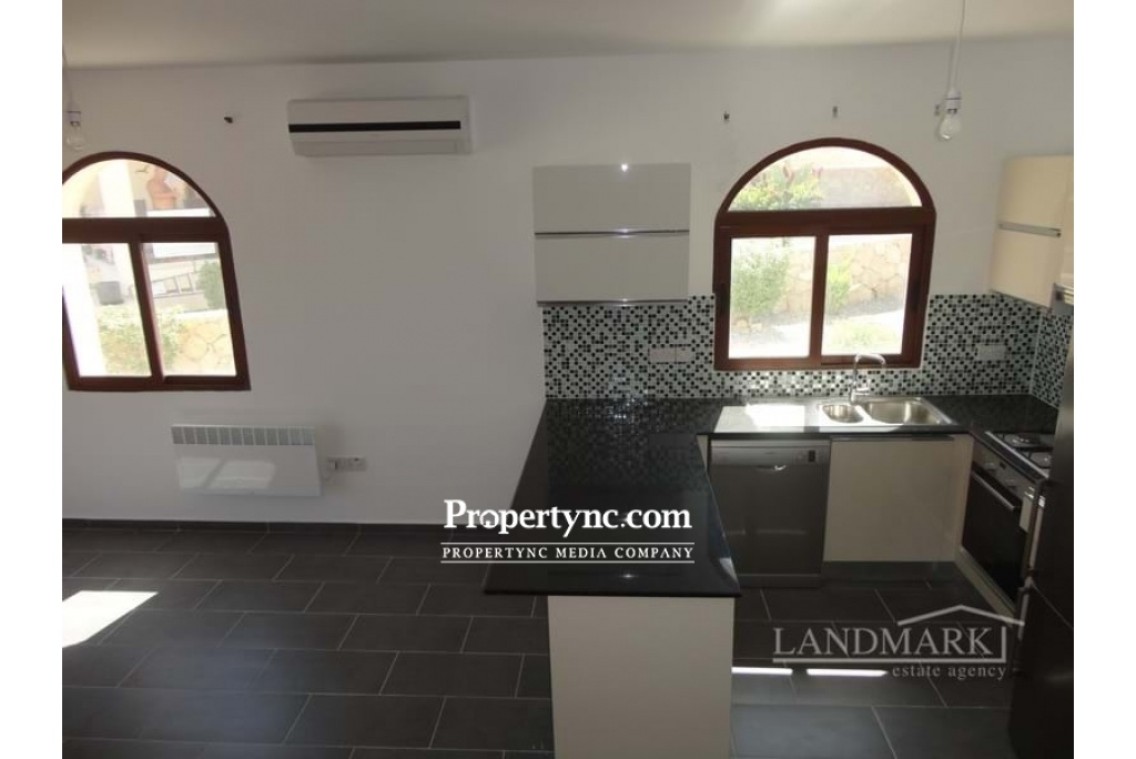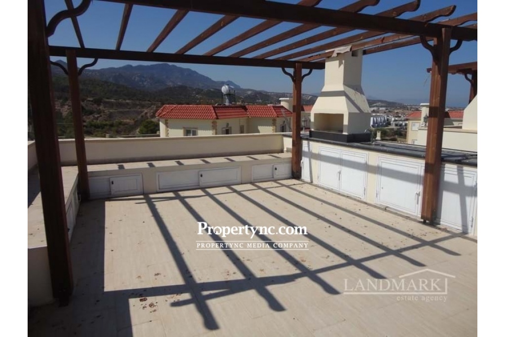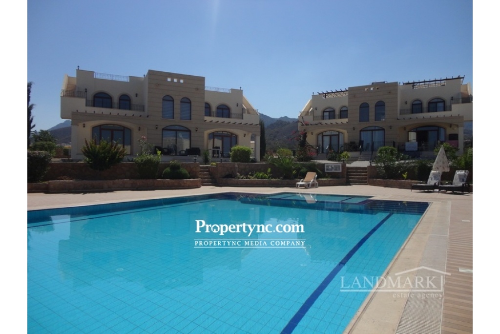 This is small site with 24 properties and features beautifully landscaped gardens, a communal swimming pool and recreation area, private parking and spectacular sea & mountain views. There are 2 bedrooms to the first floor with family bathroom and shower. In the bedrooms there are fitted wardrobes and a door which leads you to the roof terrace. Moreover all bedrooms are equipped with AC and electric radiators. From the terrace there is marvellous panoramic view over the sea and mountain. On a roof terrace there is build an open kitchen with sitting area, Cypriot BBQ, storage cupboard and pergola. To the ground floor there is an open plan lounge to the kitchen with fully fitted kitchen units, kitchen appliances, marble worktops, AC and electric radiator. Also there is entrance to the communal garden and swimming pool area. It´s location is perfect for walking along the coast line or mountain. Korineum golf club is only few minutes drive. Completed in 2014 Communal pool 110m² internal size 2 bedrooms with family bathroom and shower 1 WC to the ground floor Washing room with washing machine Ceramic flooring White goods Marble black work tops Electric radiator in living room & bedrooms Air conditionings x3 Roof terrace- with sitting area and wooden pergola Cypriot BBQ on roof terrace and storage cabinets Car port Beautiful established gardens Excellent area to purchase a home Property maintenance £780 year - REF: 622d