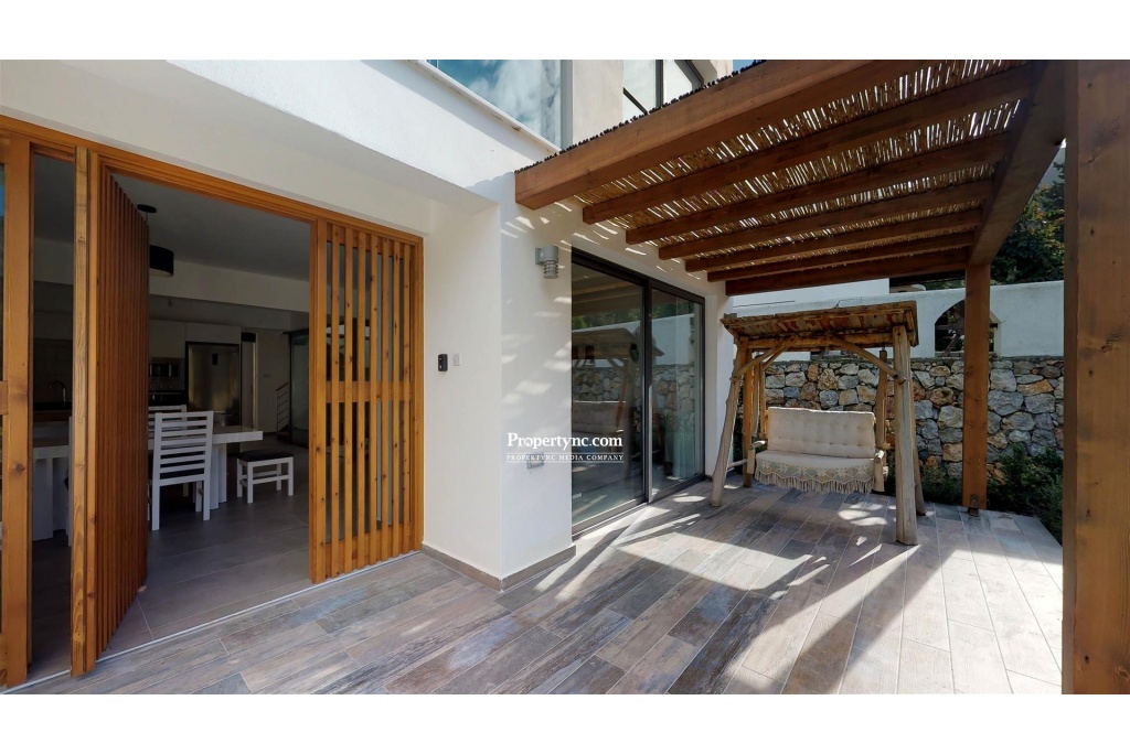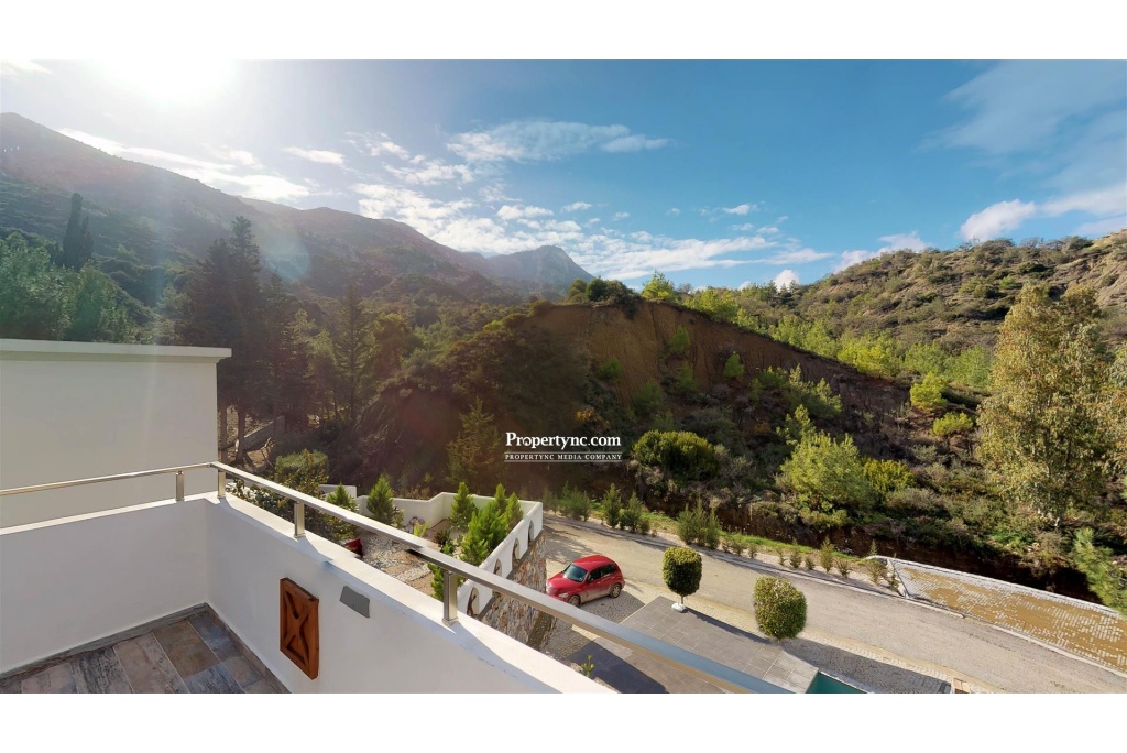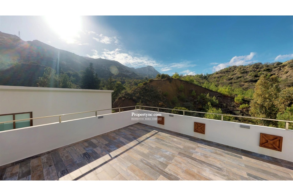 Looking for a modern quiet villa? Look no further! Homeowners of this lovely villa will enjoy terraces overlooking the mountains and greenery and the large roof top terrace complete with kitchen is fantastic for relaxing and enjoying an evening meal. A modern floating staircase runs alongside the internal glass surrounded garden where you have a feeling of serenity within the mountains. This Bellapais region is home to touristic attractions like St. Hilarion Castle, Bellapais Monastry and Bellapais Abbey and offers a relaxed lifestyle away from the hustle and bustle of Kyrenia City however still being only minutes away. This gated community is accommodated with a communal Swimming Pool, Nature Play and Picnic area, children’s play area and orchid hiking trails exclusively available for residents, come and breath the mountain air.